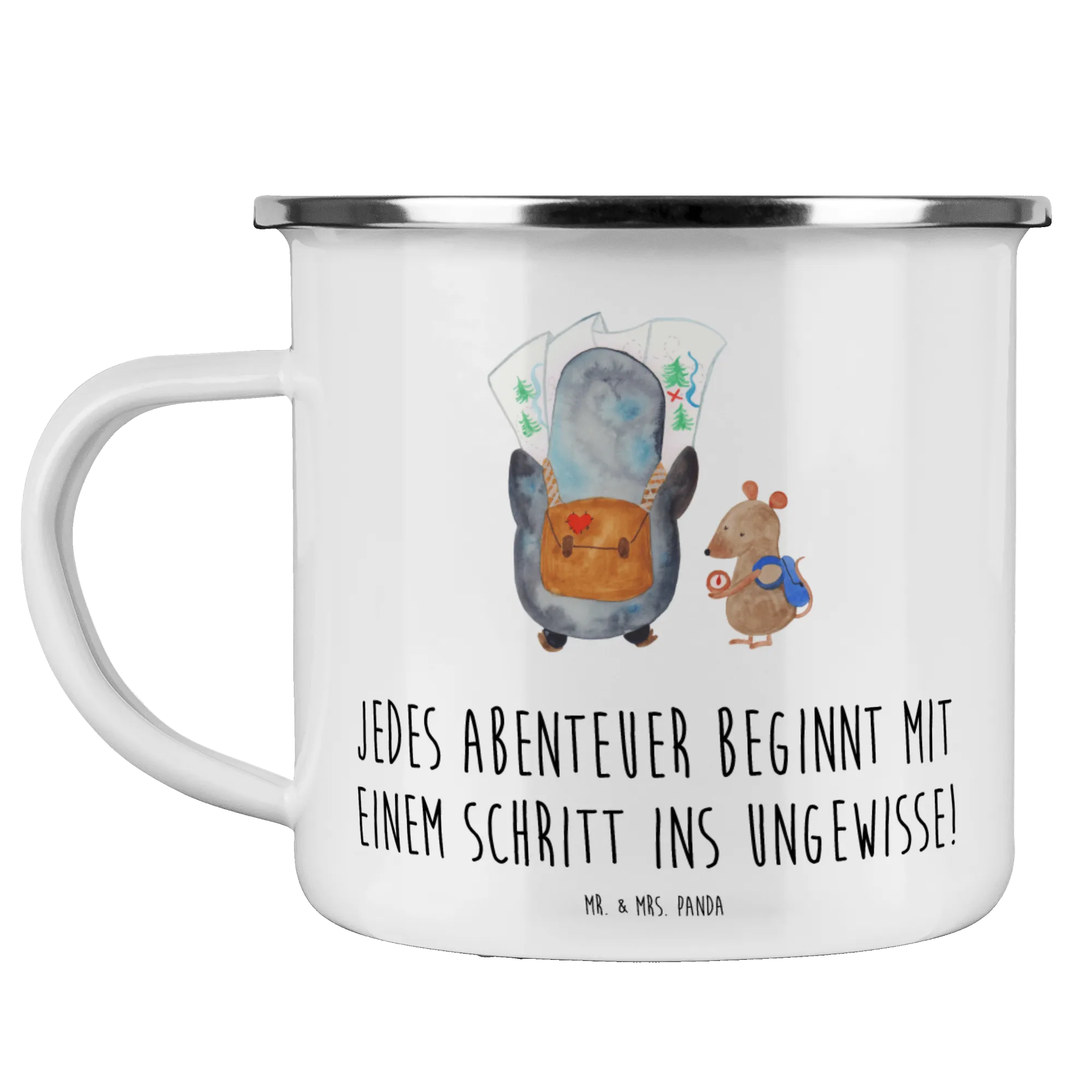 Kempingowy kubek emaliowany Jedes Abenteuer beginnt mit einem Schritt ins Ungewisse!