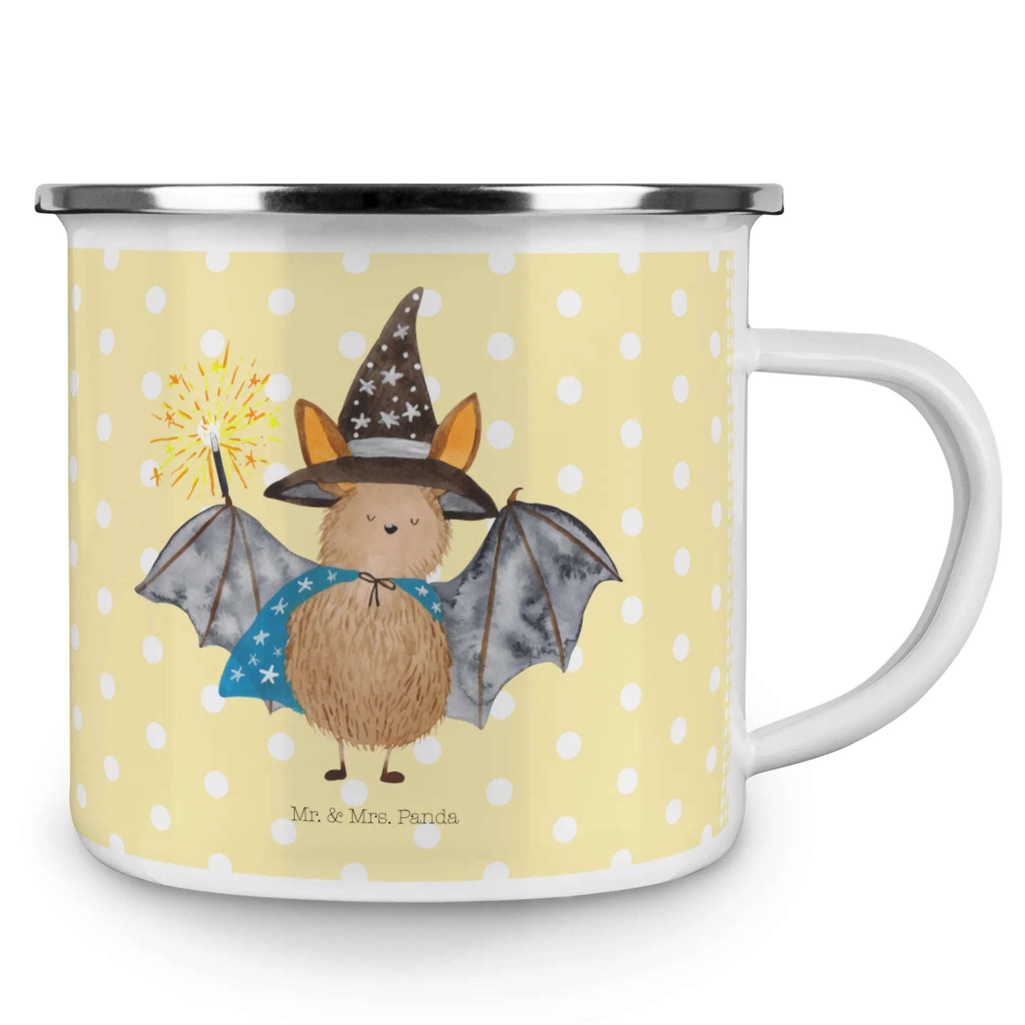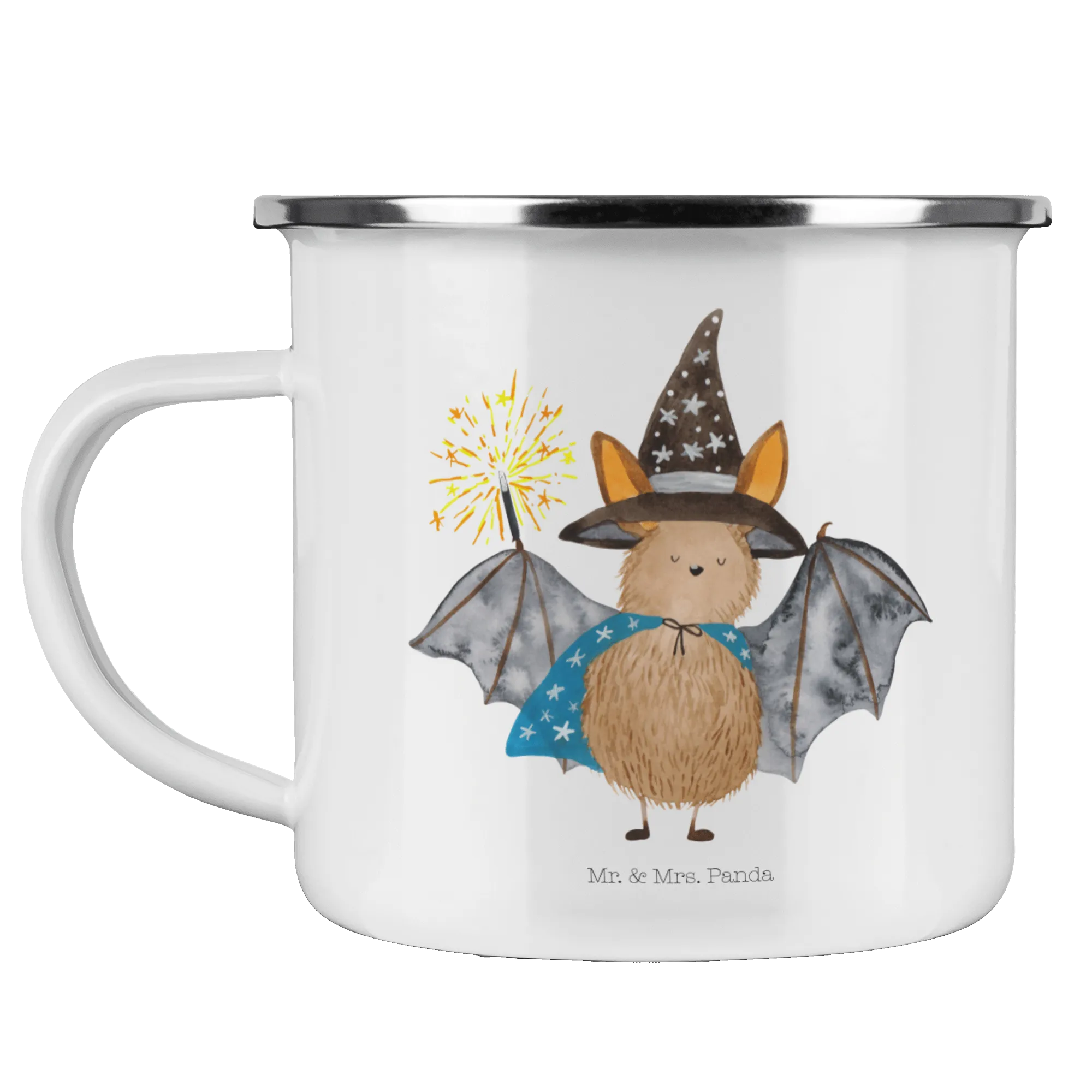 Kempingowy kubek emaliowany Nietoperz czarodziej - z napisem - biały