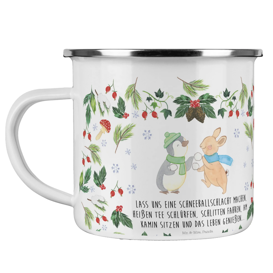 Kempingowy kubek emaliowany Pingwin królik Bitwa na śnieżki – Mr. & Mrs. Panda