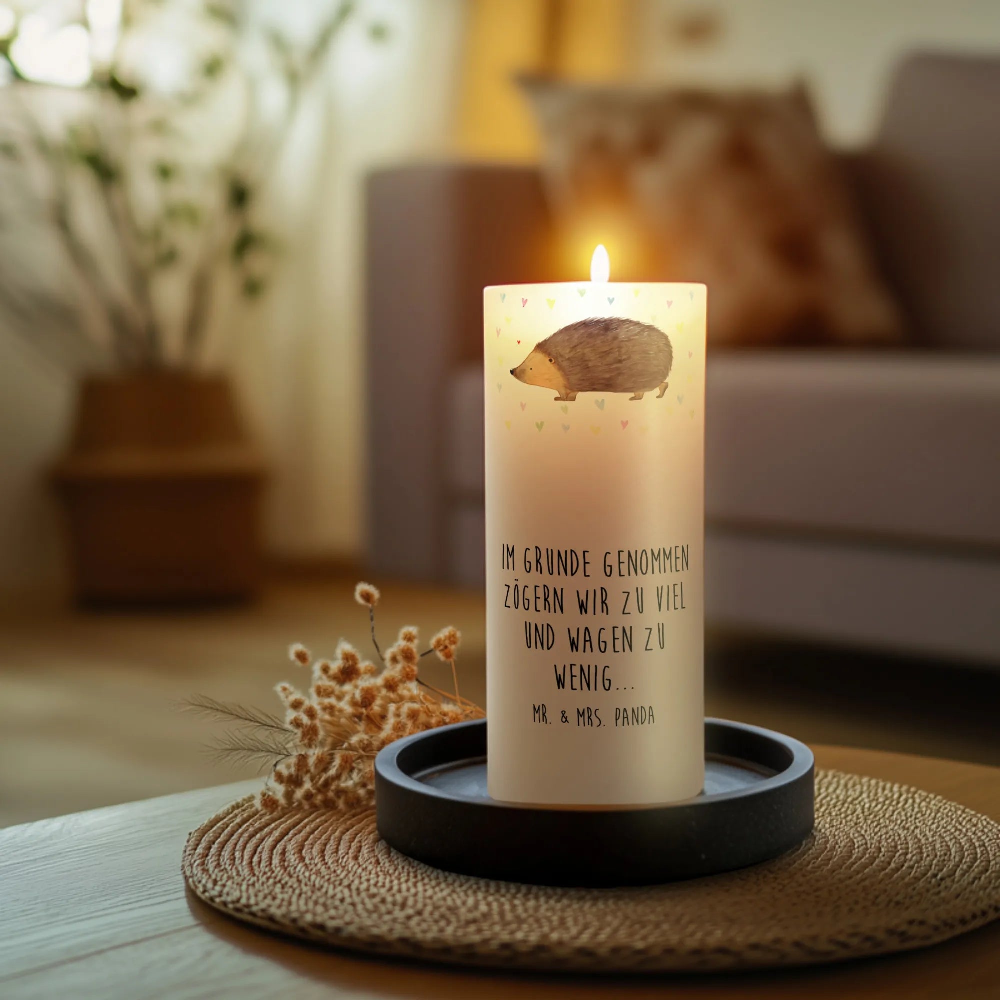 Der süße Igel, von einer Vielzahl roter Herzen umgeben, strahlt pure Lebensfreude aus. Mit dem Spruch "Im Grunde genommen zögern wir zu viel und wagen zu wenig..." regt diese Kerze zum Nachdenken an, während sie gleichzeitig eine warme Atmosphäre schafft.