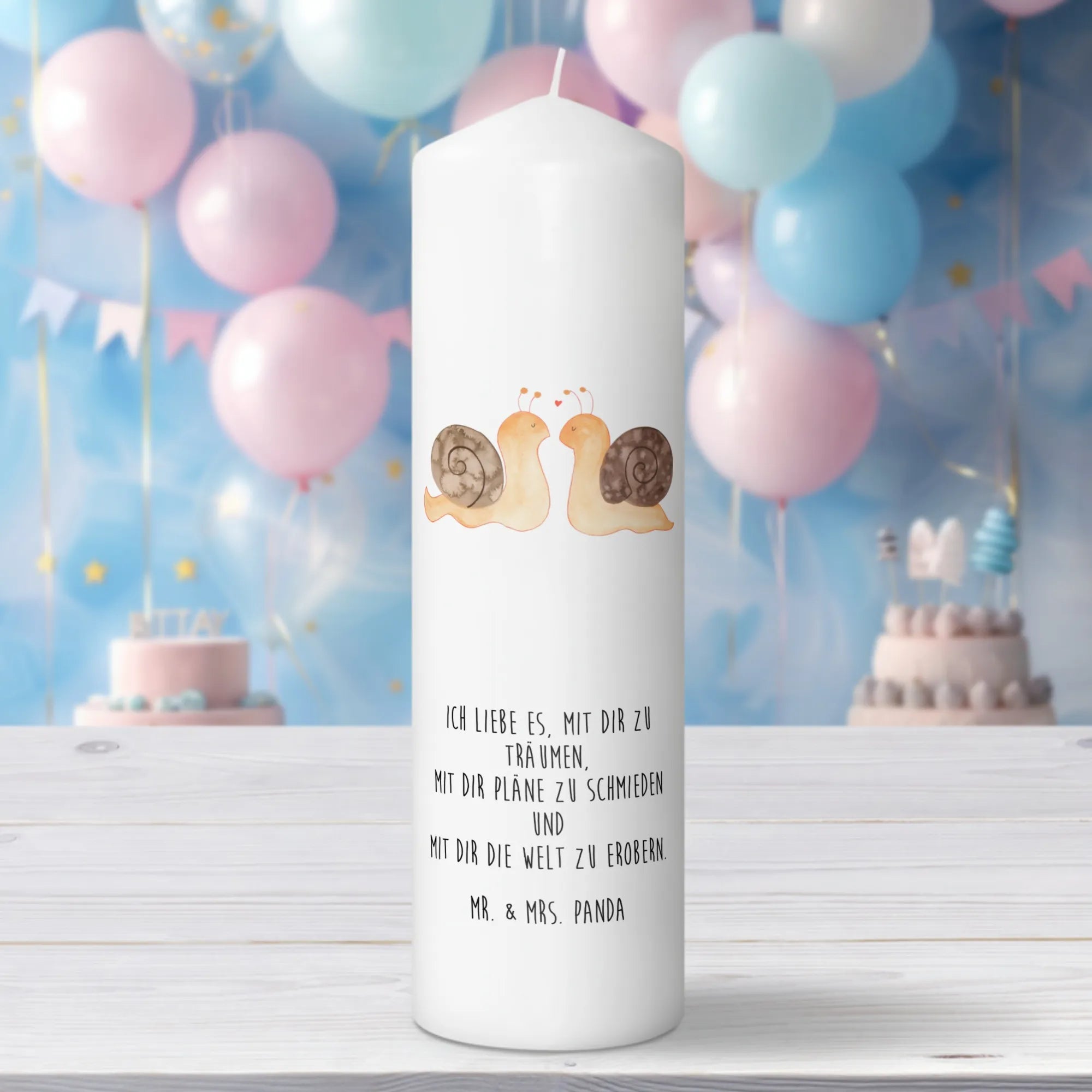 Die wunderschöne Taufkerze "Schnecken Liebe" von Mr. & Mrs. Panda ist das perfekte Geschenk für unvergessliche Anlässe wie Taufen oder Kommunionen. Diese besondere Kerze wird durch ihr liebevolles Design und den romantischen Spruch "Ich liebe es, mit dir zu träumen, mit dir Pläne zu schmieden und mit dir die Welt zu erobern" zu einem unvergesslichen Liebesbeweis.
