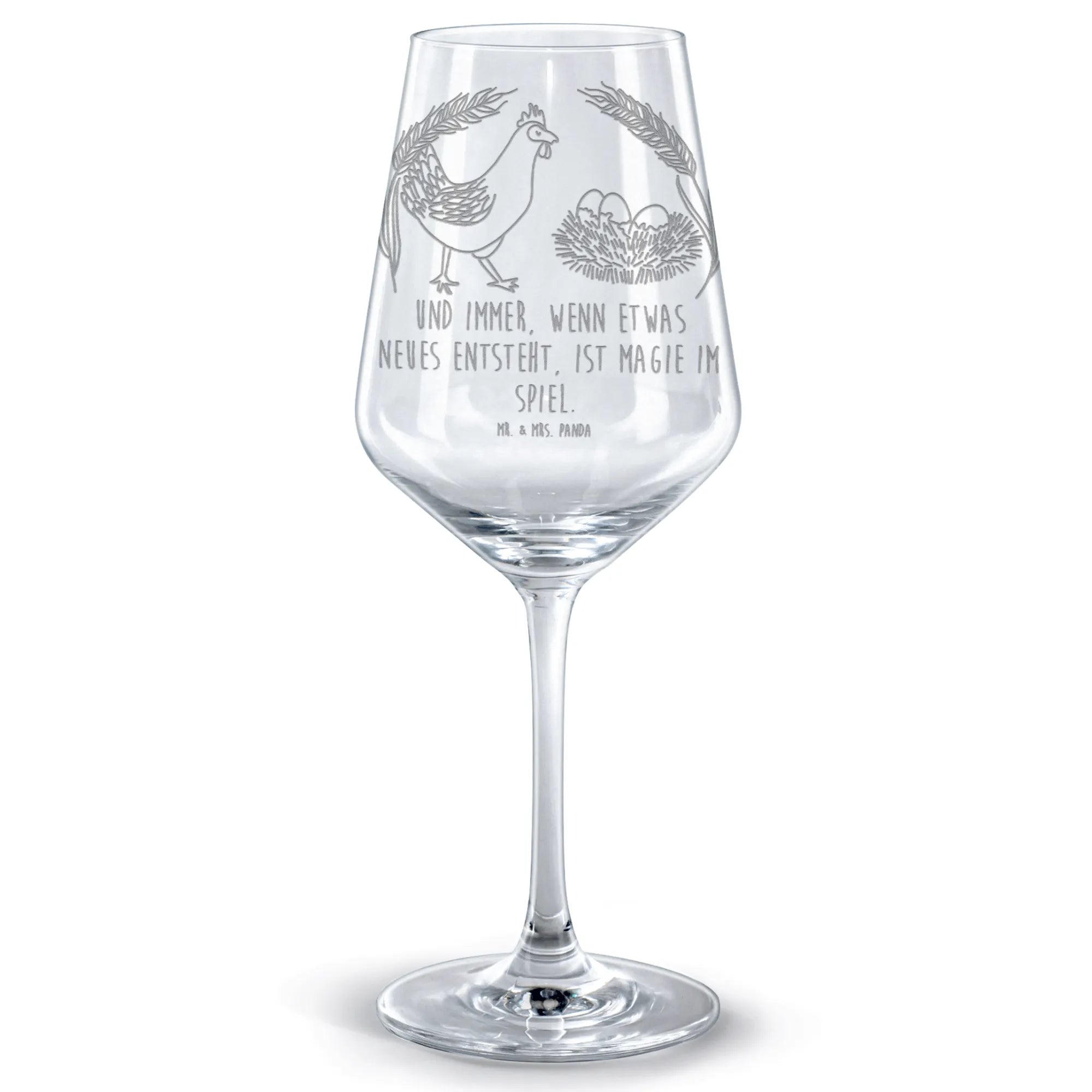 Dieses liebevoll gestaltete Rotweinglas aus der Bauernhof-Kollektion von Mr. & Mrs. Panda ist mehr als nur ein Weinglas für Rotwein – es ist ein kleines Freudenstück fürs Herz. Mit einer feinen Lasergravur zeigt sich Berta Henne, stolz und lebensfroh, neben dem bezaubernden Spruch: „Und immer, wenn etwas neues entsteht, ist Magie im Spiel.“ 🐔✨