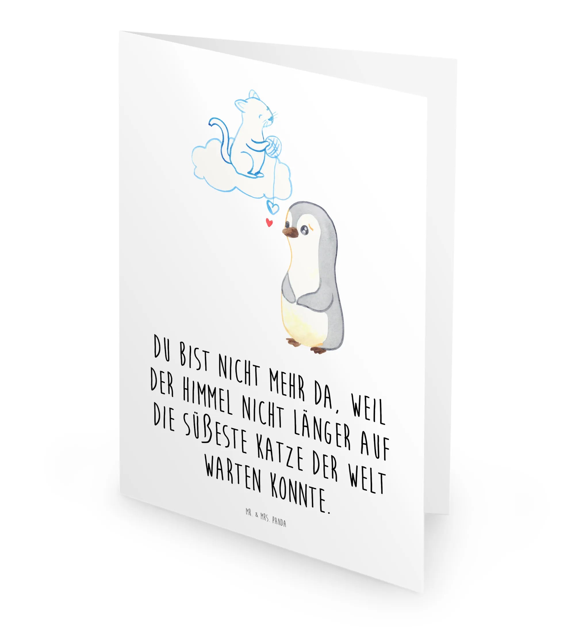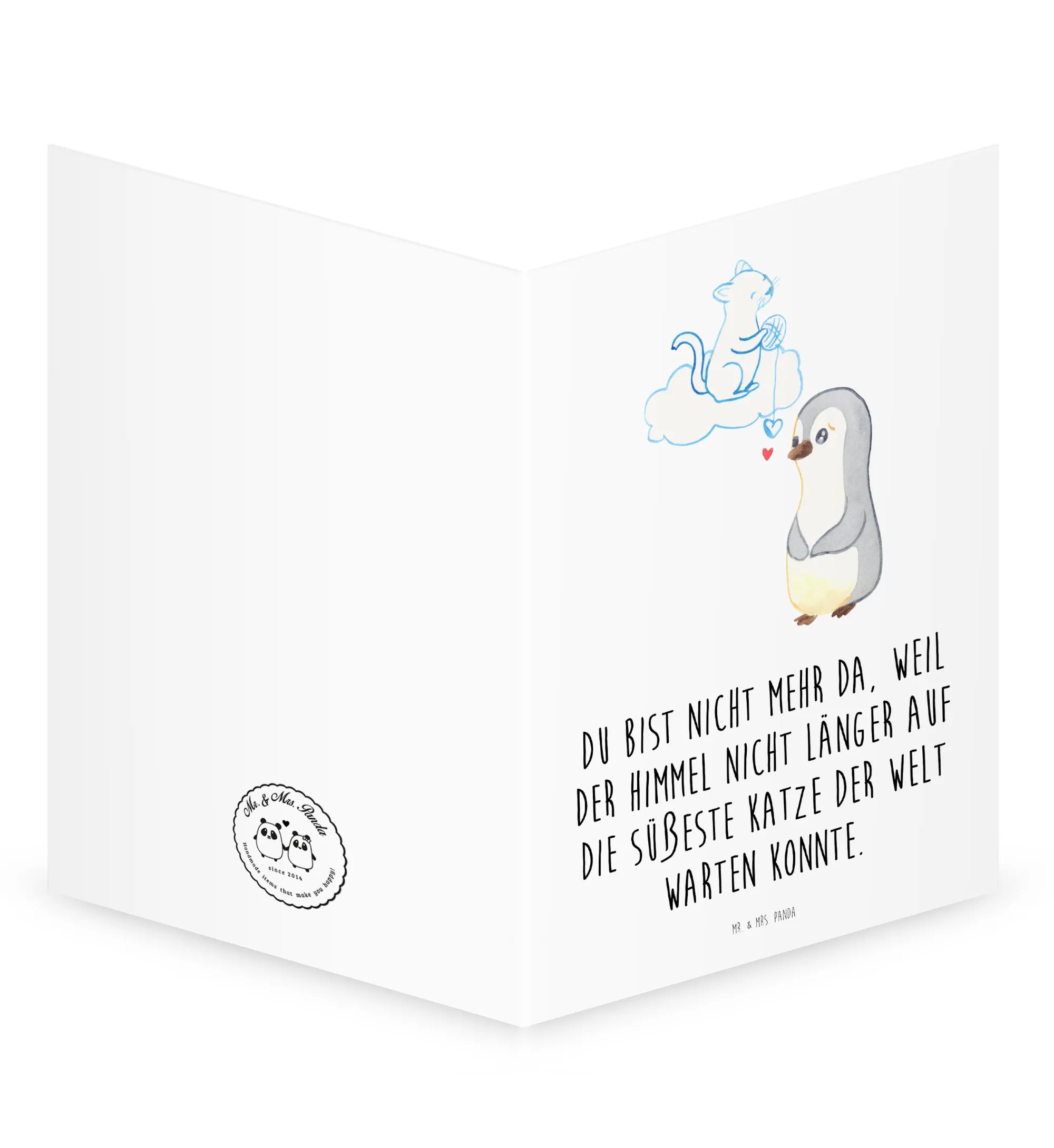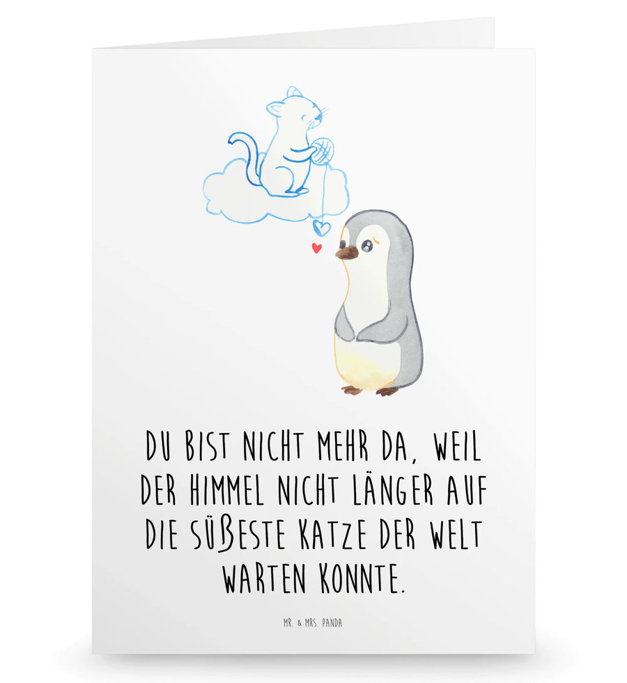 Die Klapp Trauerkarte mit dem einfühlsamen Motiv der Trauer Katze von Mr. & Mrs. Panda ist der perfekte Weg, um dein Beileid auf eine herzliche und liebevolle Weise auszudrücken. Wenn ein geliebtes Haustier, wie deine süße Katze, von uns geht, kann der Schmerz überwältigend sein. Diese Trauerkarte bietet dir die Möglichkeit, deine Gedanken und Gefühle in solch schweren Zeiten mit einem ganz besonderen Menschen zu teilen. Mit dem schönen Spruch "Du bist nicht mehr da, weil der Himmel nicht länger auf die süßeste Katze der Welt warten konnte." fangen wir die Gefühle von Verlust und Anteilnahme ein.