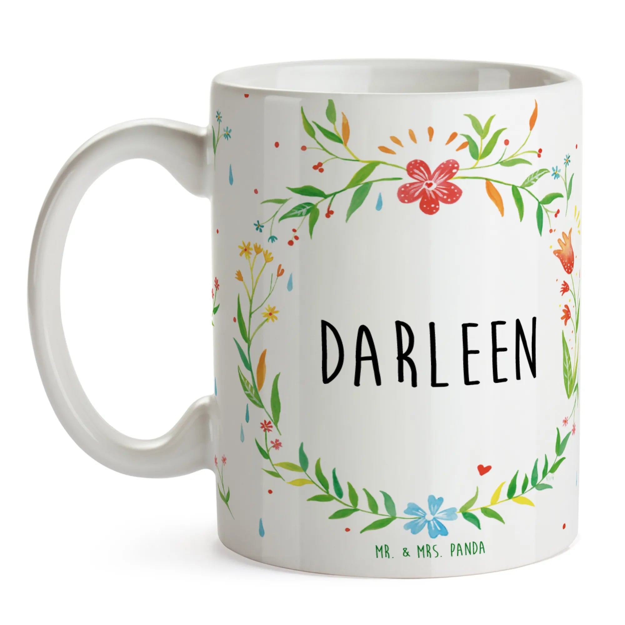 Diese bezaubernde Tasse aus der forenames Kollektion trägt den liebevollen Schriftzug „Darleen“, umrahmt von einer zarten, floralen Blumenranke. Das Design ist brillant bedruckt und die besonders glänzende Oberfläche macht das Motiv zu einem hübschen Hingucker auf deinem Frühstückstisch oder im Büro.