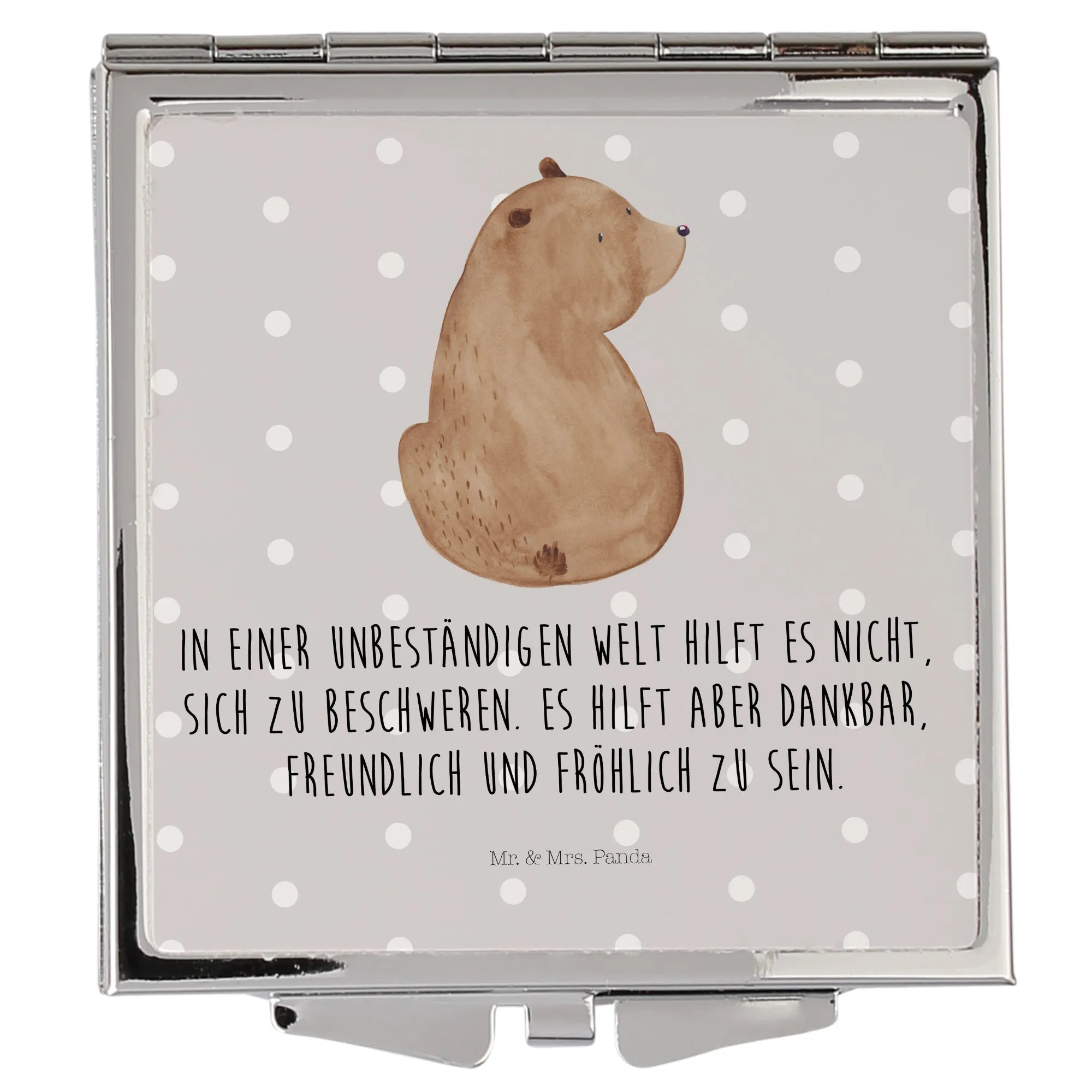 Kwadratowe lusterko do torebki niedźwiedź spojrzenie przez ramię - z napisem - Pastelowy szary