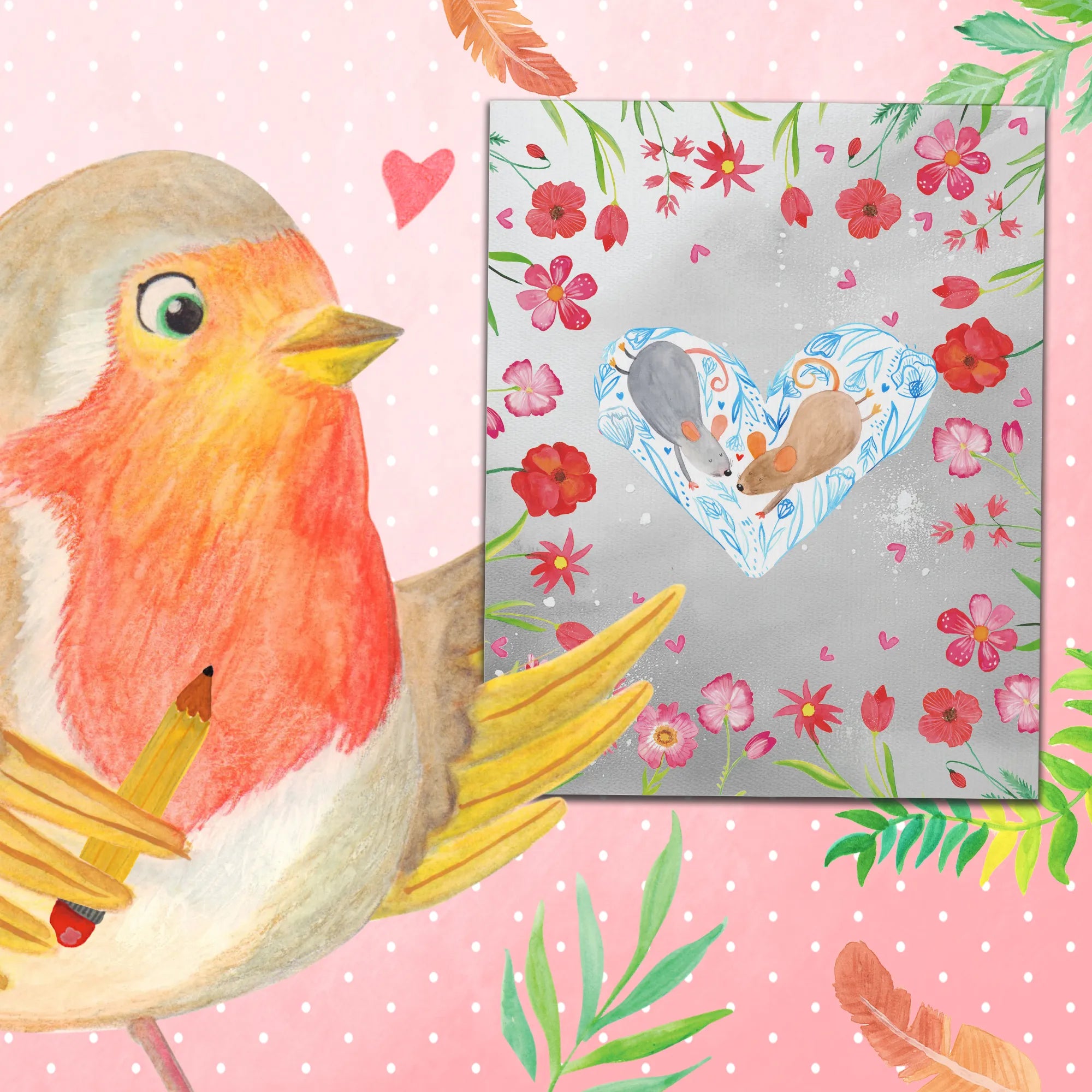 Das Motiv zeigt zwei süße Mäuse, die ein Herz formen – eine bezaubernde Liebesbotschaft! Die Mäuse sind in sanften Aquarellfarben gestaltet, eine grau und die andere beige. Ihr Schwanz und die Körperlinien vereinen sich, um die Form eines Herzens zu kreieren. Umgeben von zarten floralen Elementen und kleinen Herzen wirkt das Bild liebevoll und romantisch.