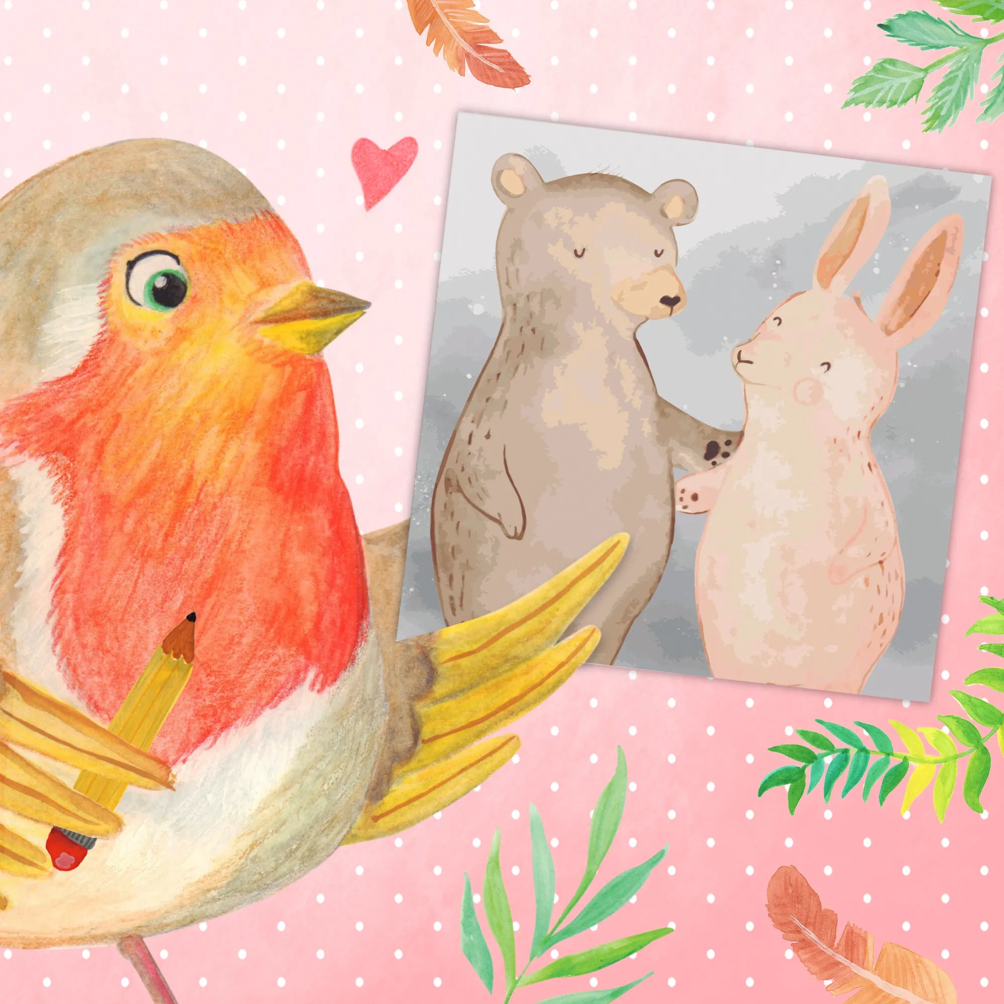Die Szene zeigt die beiden Tiere in einem niedlichen, cartoonhaften Stil, der Freude und Wärme ausstrahlt.