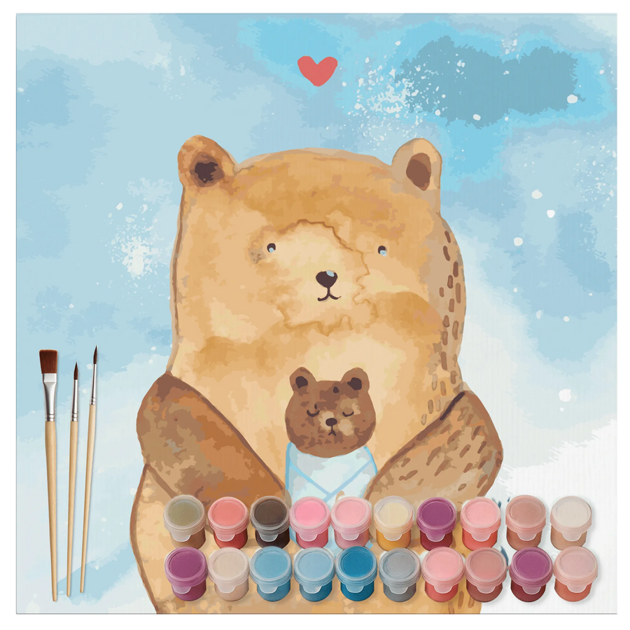 Mit einem liebevoll gestalteten Motiv eines süßen Bären, der sein Babybärchen im Arm hält, wird dieses Ausmalbild jeden begeistern! Das Set umfasst hochwertige Acrylfarben und formstabile Pinsel, mit denen du deine Kreativität ausleben kannst. Perfekt als DIY-Projekt für große und kleine Künstler.