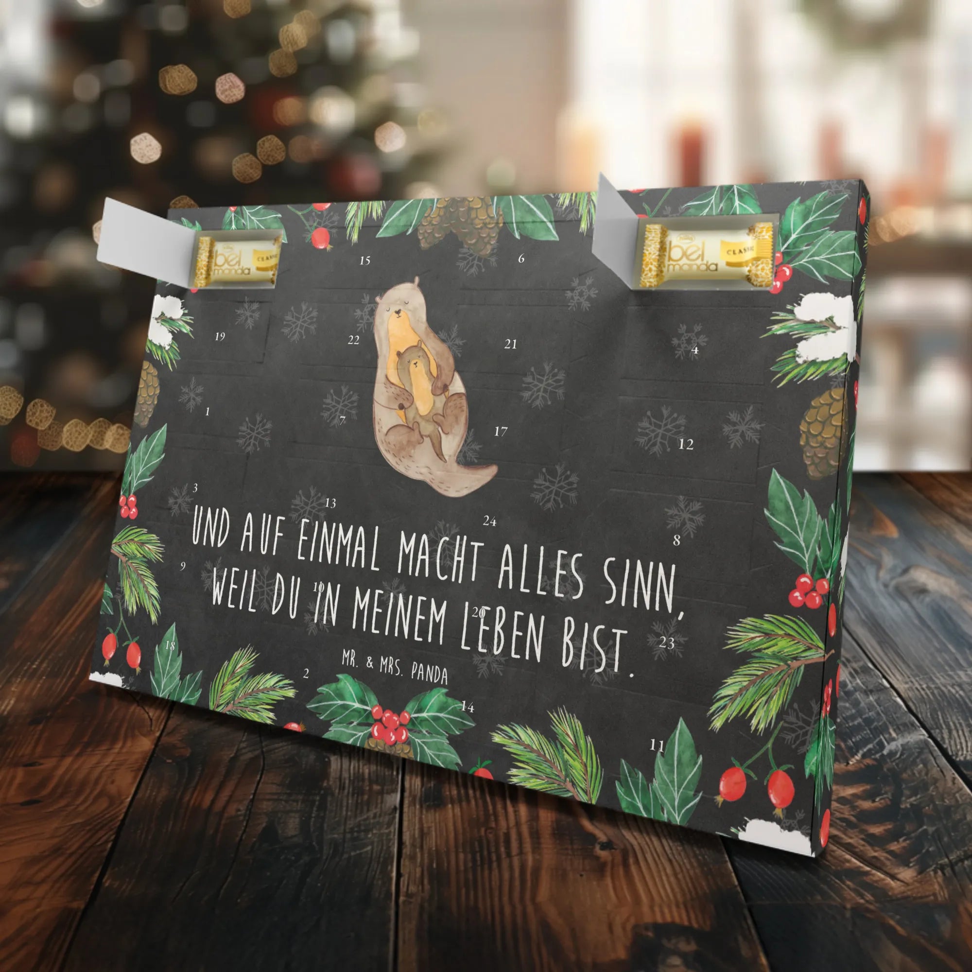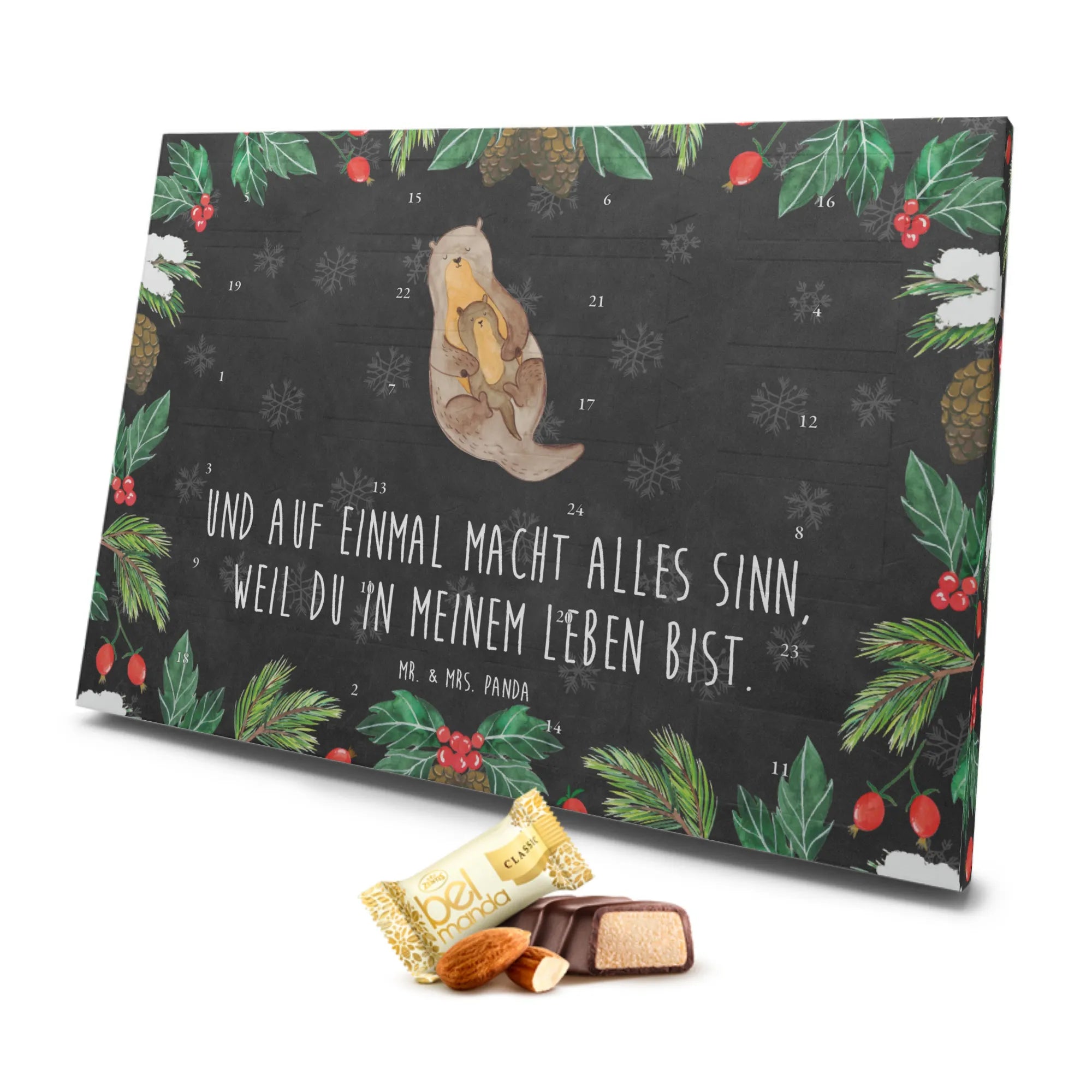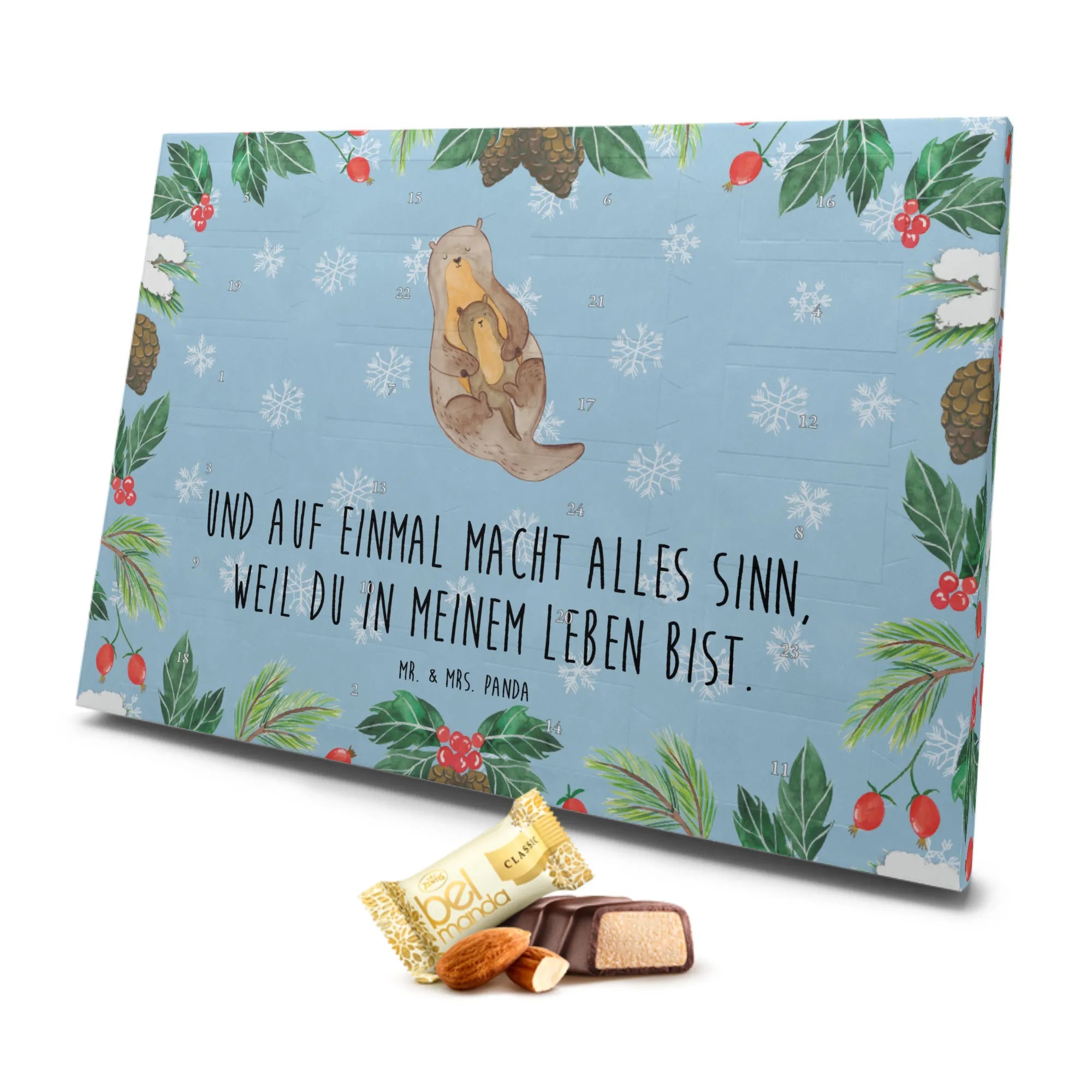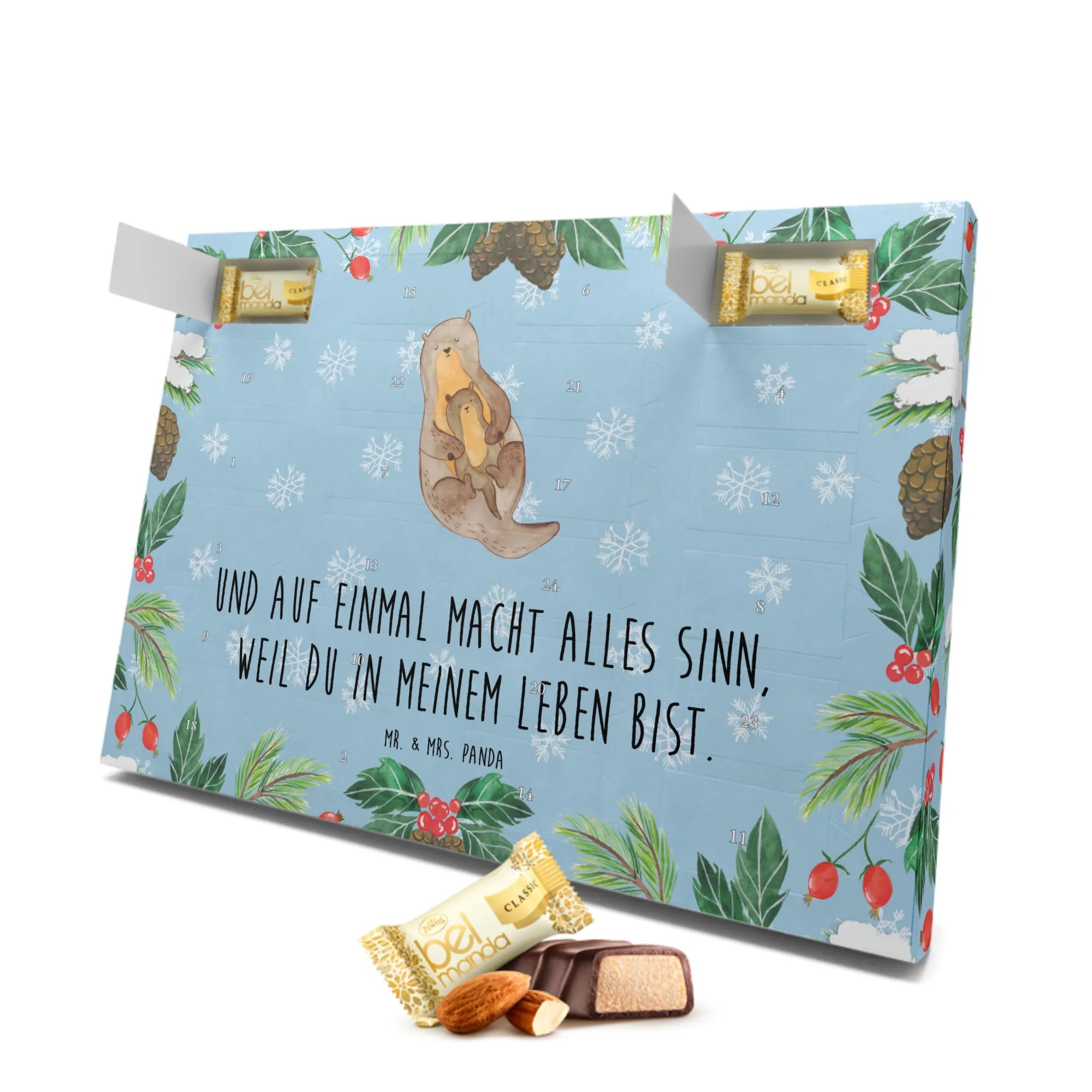 Der wunderschöne Marzipan Adventskalender "Otter mit Kind" von Mr. & Mrs. Panda ist die perfekte Geschenkidee für alle Otter-Fans und Naschkatzen! Mit liebevoll handgezeichneten Motiven und dem sentimentalen Slogan "Und auf einmal macht alles Sinn, weil du in meinem Leben bist." verwandelt dieser Kalender die Adventszeit in ein unvergessliches Erlebnis.