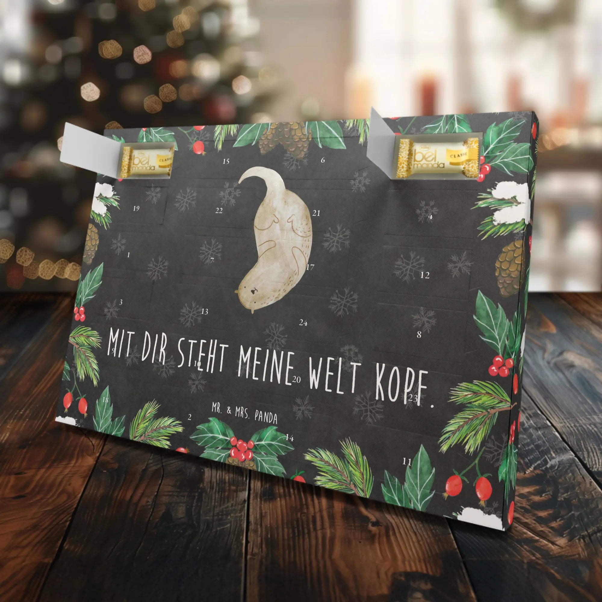 Der wunderschöne Marzipan Adventskalender mit dem niedlichen Motiv "Otter kopfüber" von Mr. & Mrs. Panda bringt fröhliche Stimmung in die Adventszeit. Mit dem charakteristischen Spruch "Mit Dir steht meine Welt Kopf" wird dieser Kalender zu einem besonderen Begleiter in der Vorweihnachtszeit.