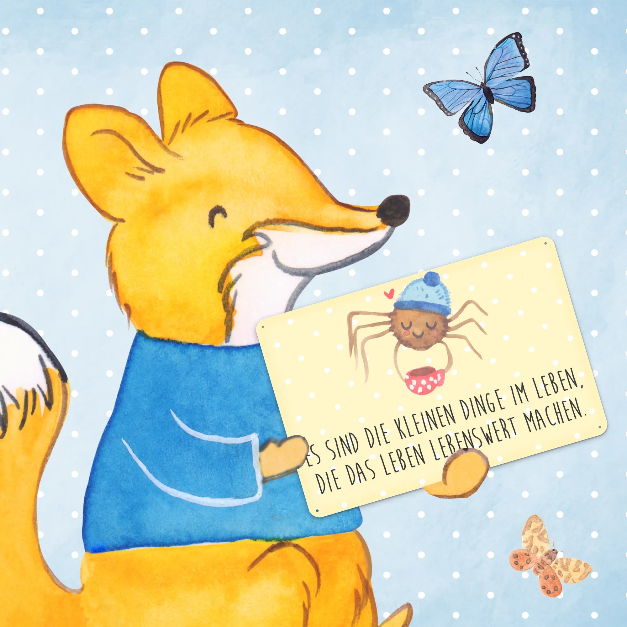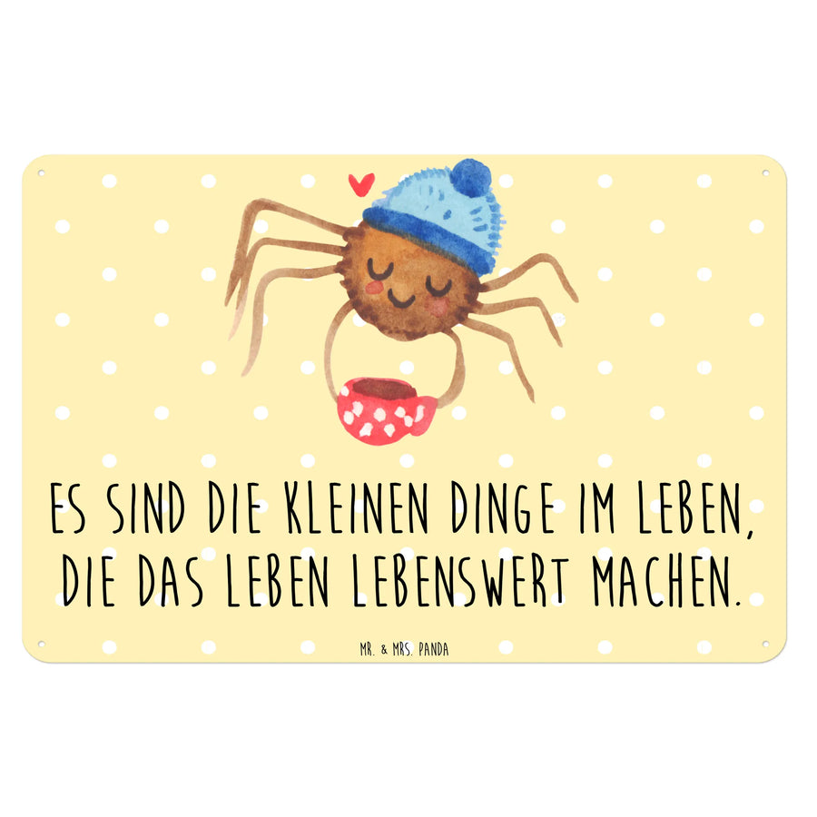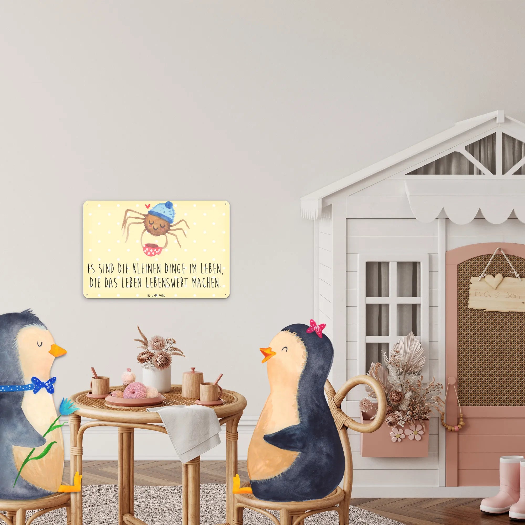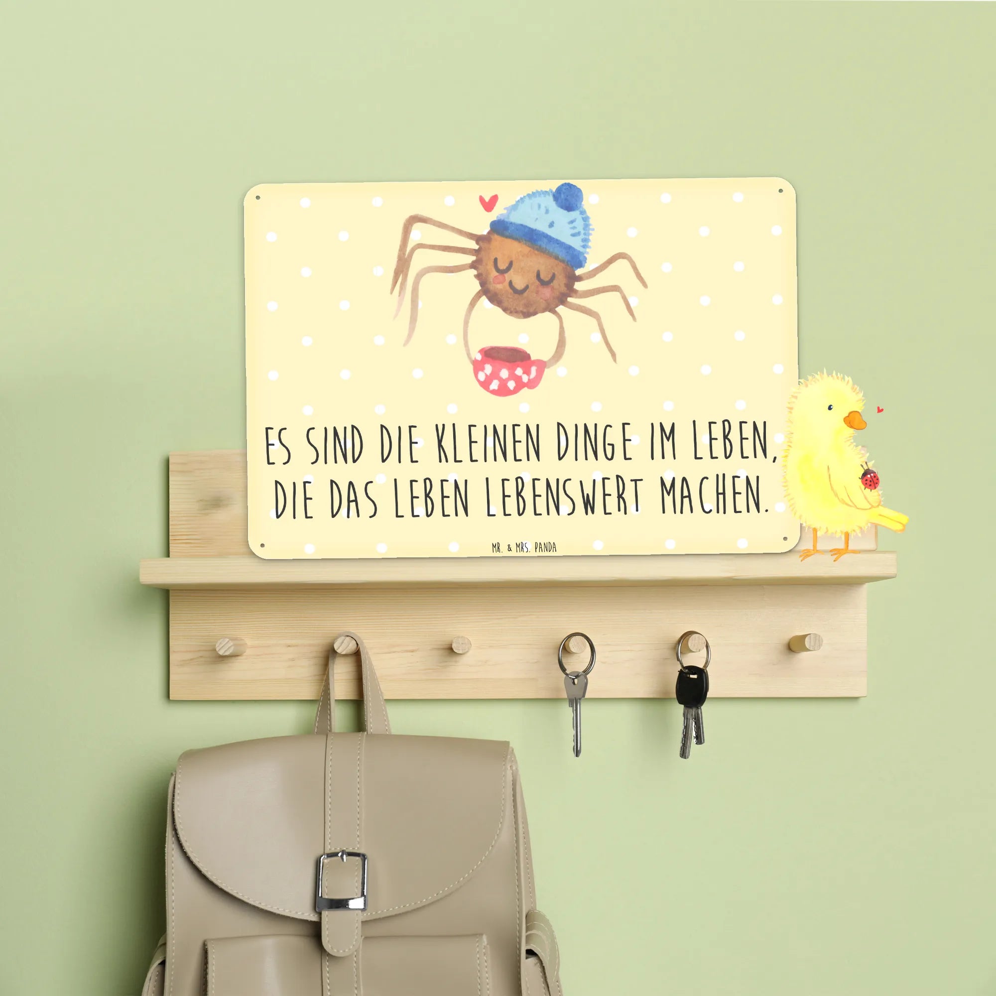 Wenn Du auf der Suche nach einem ganz besonderen Geschenk bist, dann ist das Blechschild "Spinne Agathe Kaffee" aus der Kollektion Spinne Agathe von Mr. & Mrs. Panda genau das Richtige! Dieses bezaubernde Schild zeigt die süße Spinne Agathe, die in einer kuscheligen Wollmütze genüsslich ihren Kaffee sippt. Neben ihr schimmert ein kleines Herz und der liebevolle Slogan "Es sind die kleinen Dinge im Leben, die das Leben lebenswert machen" bringt einen Hauch von Lebensfreude in jedes Zuhause.