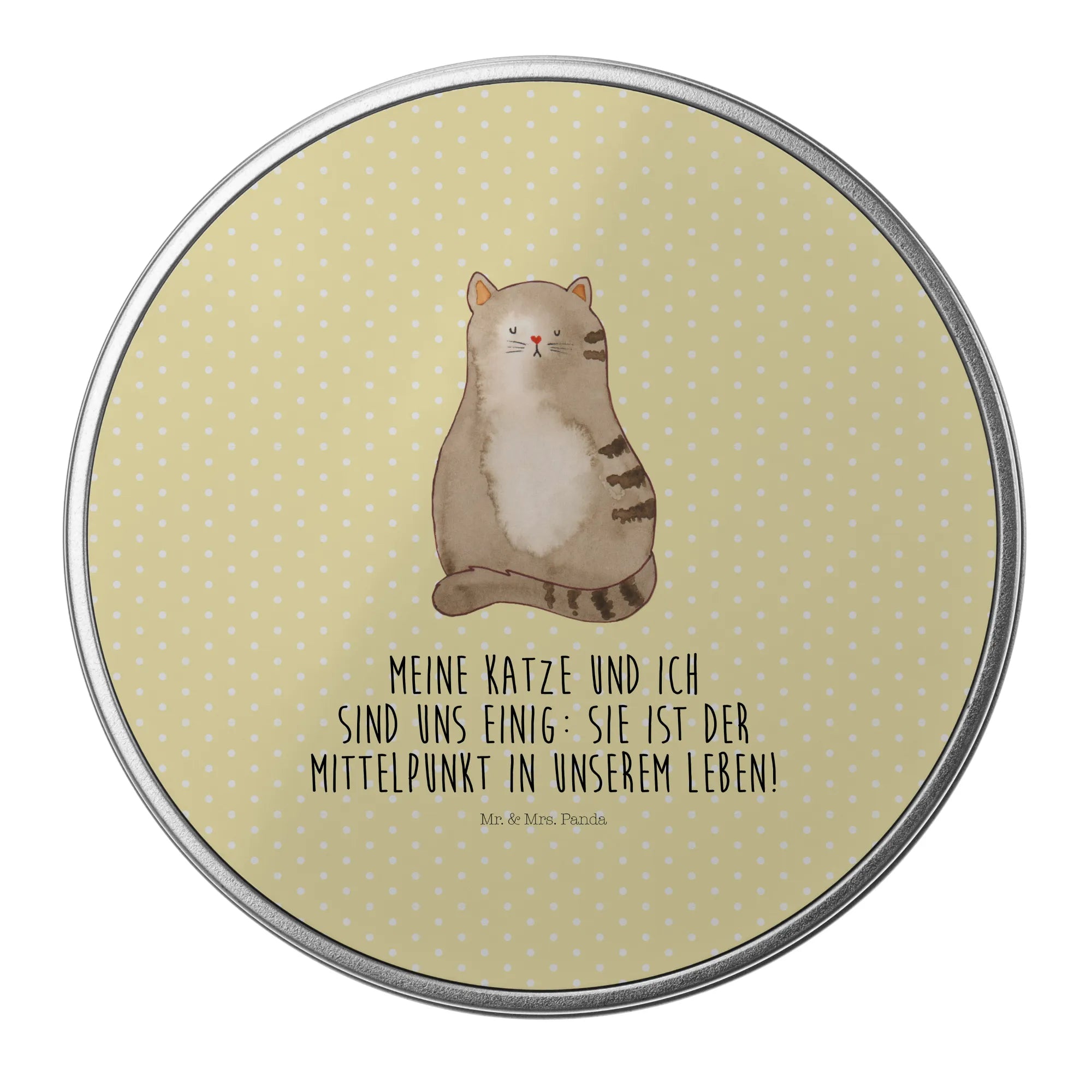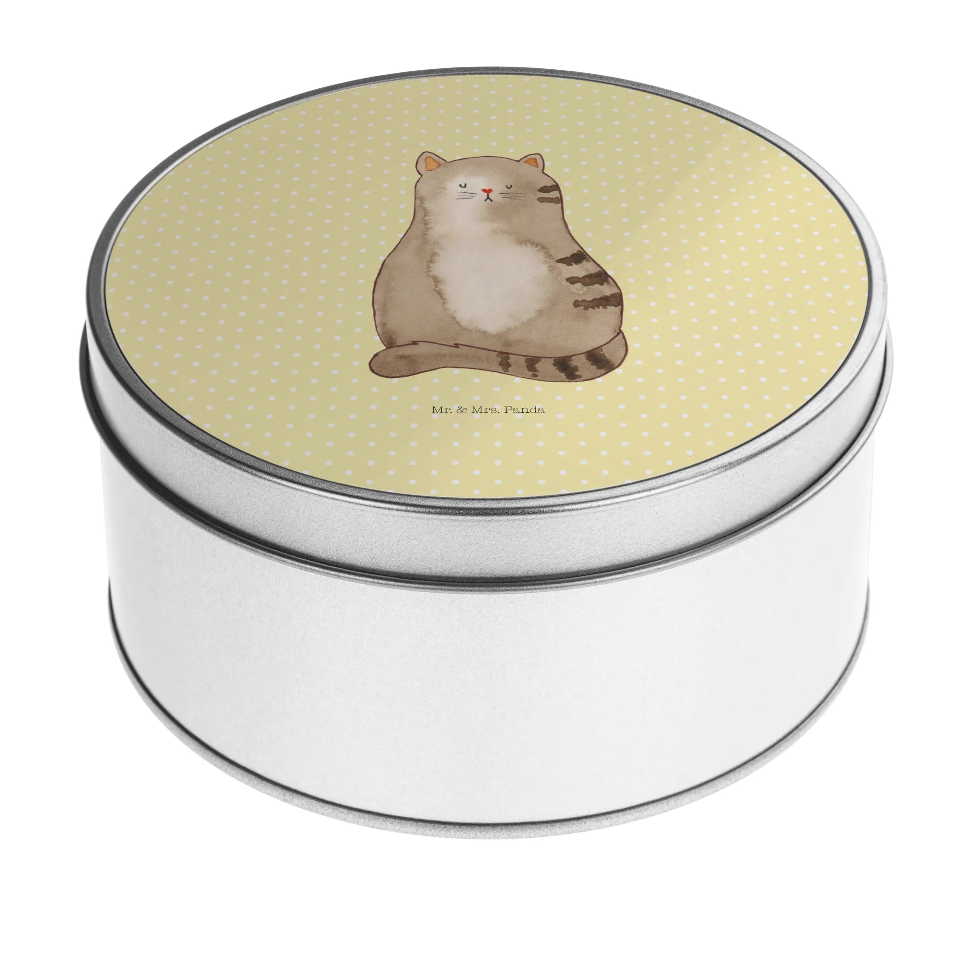 okrągła puszka z blachy kot siedzenie - z napisem