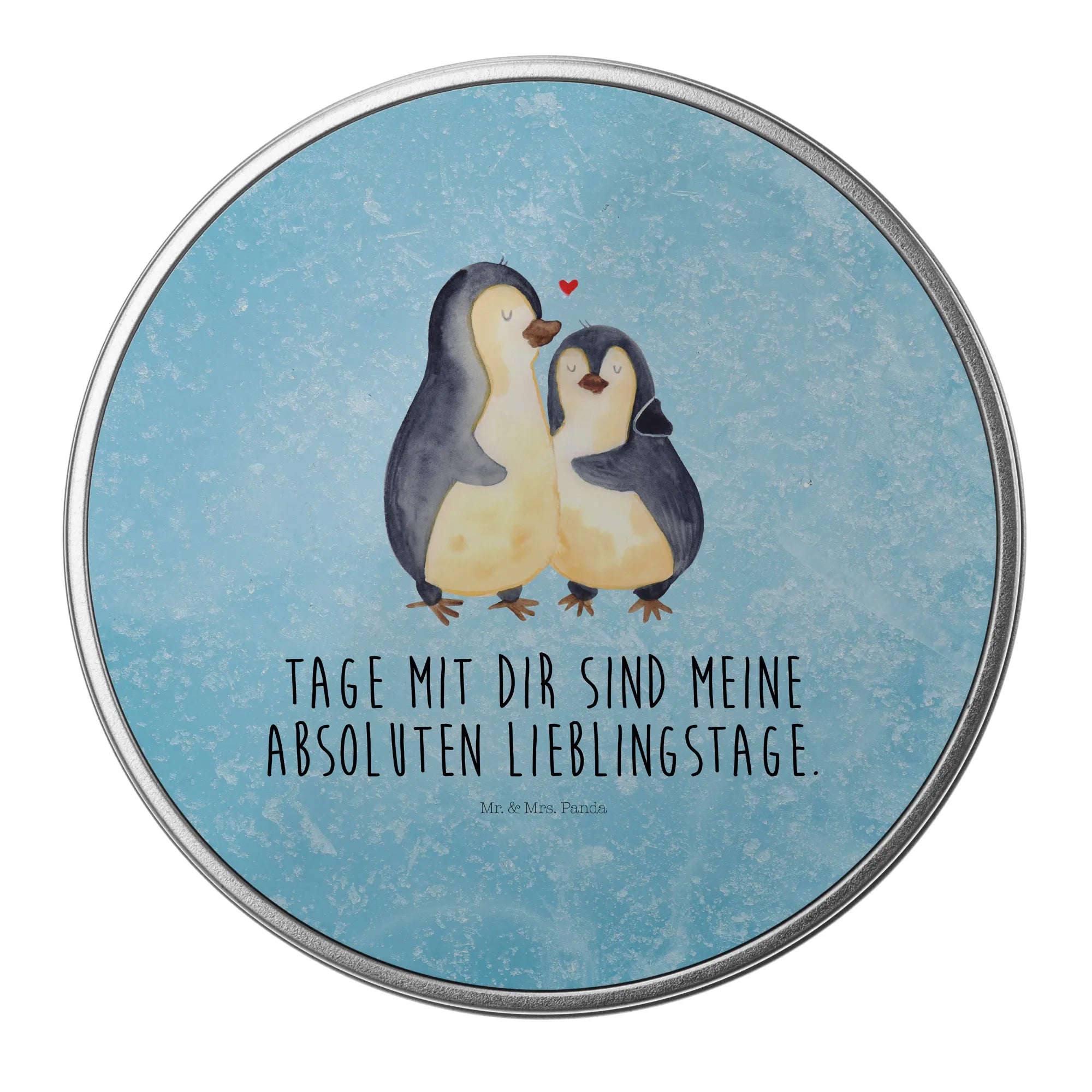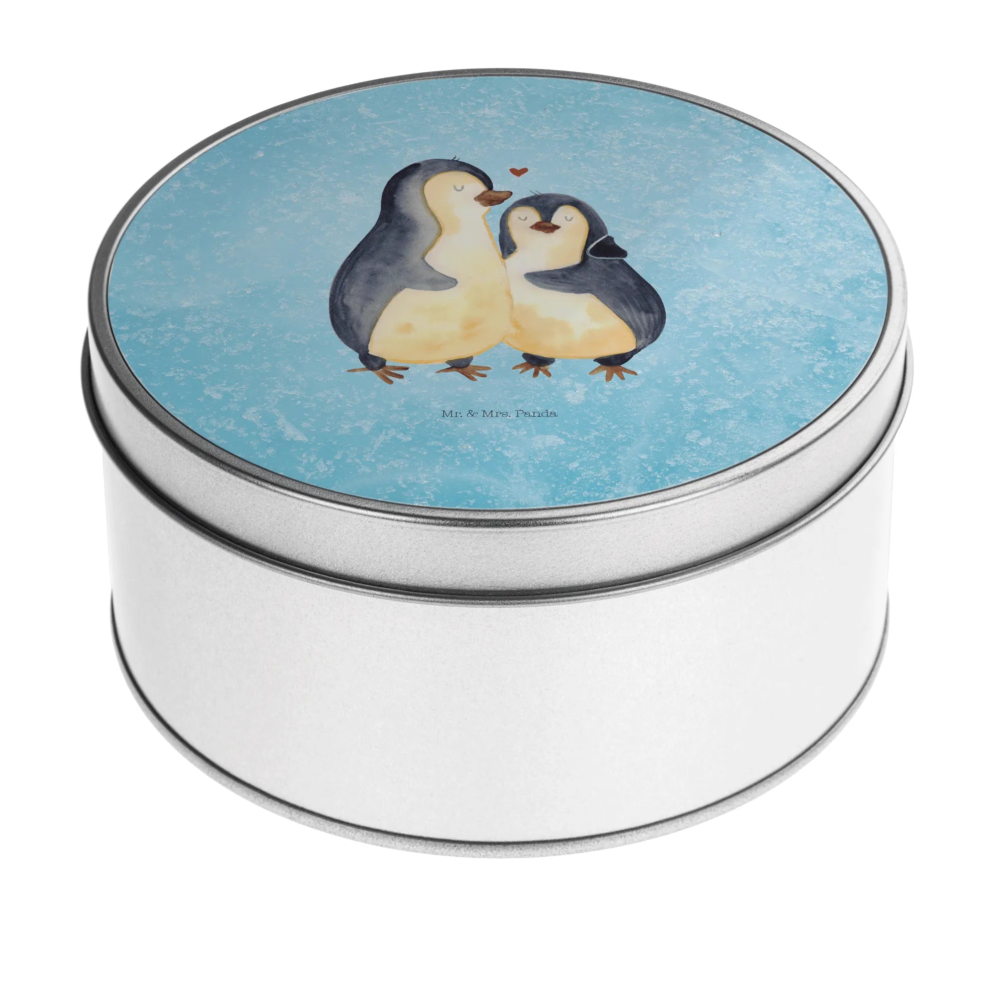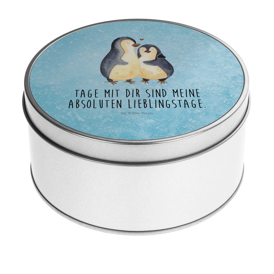 okrągła puszka z blachy Pingwin przytulać - z napisem