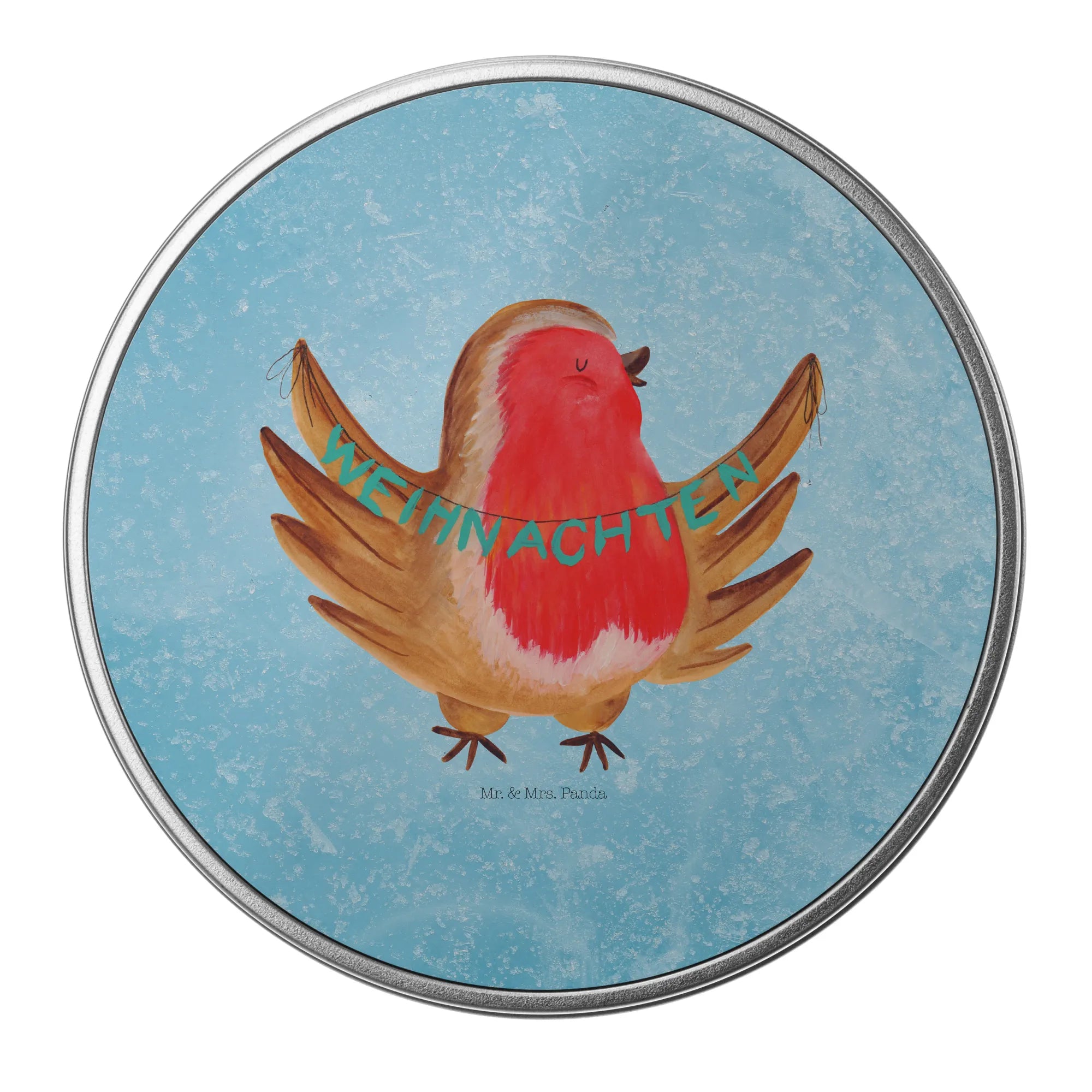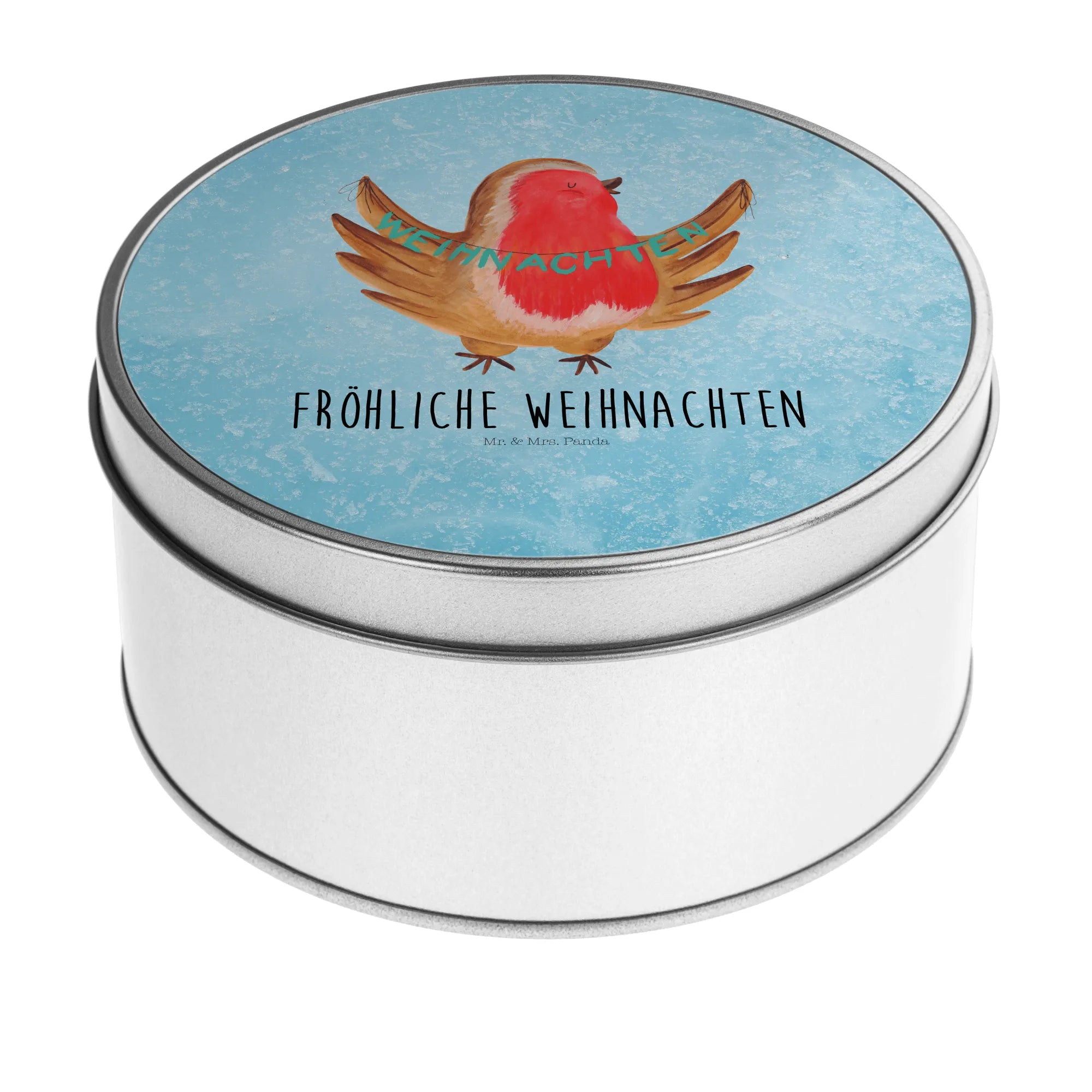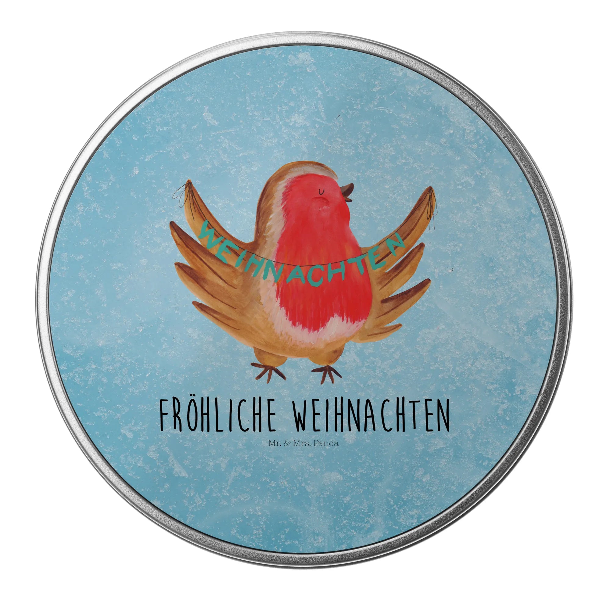 okrągła puszka z blachy rudzik Boże Narodzenie - z napisem