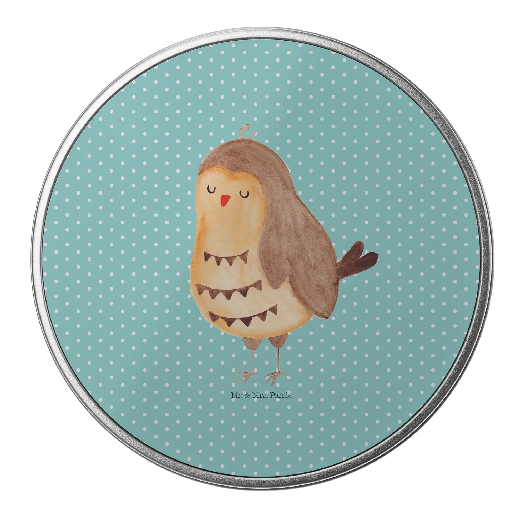 okrągła puszka z blachy sowa zadowolona - z napisem
