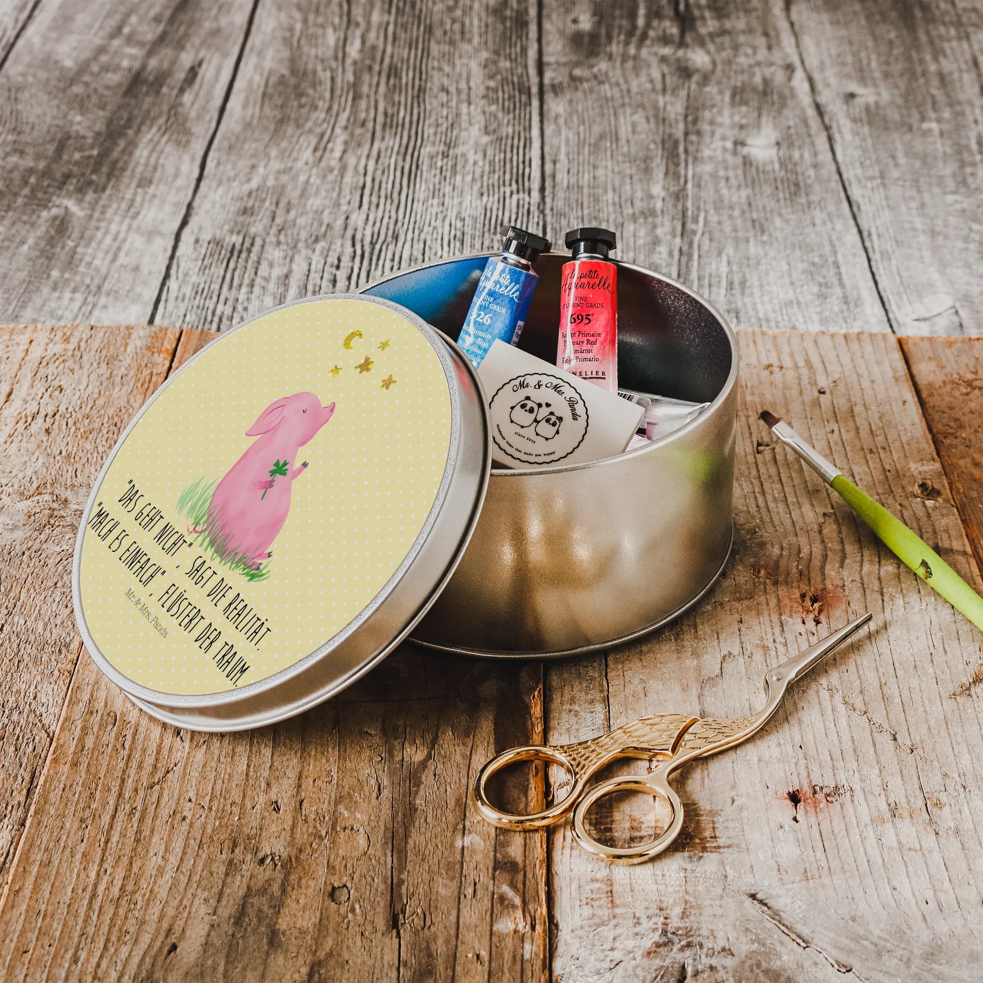okrągła puszka z blachy świnia Szczęście - z napisem