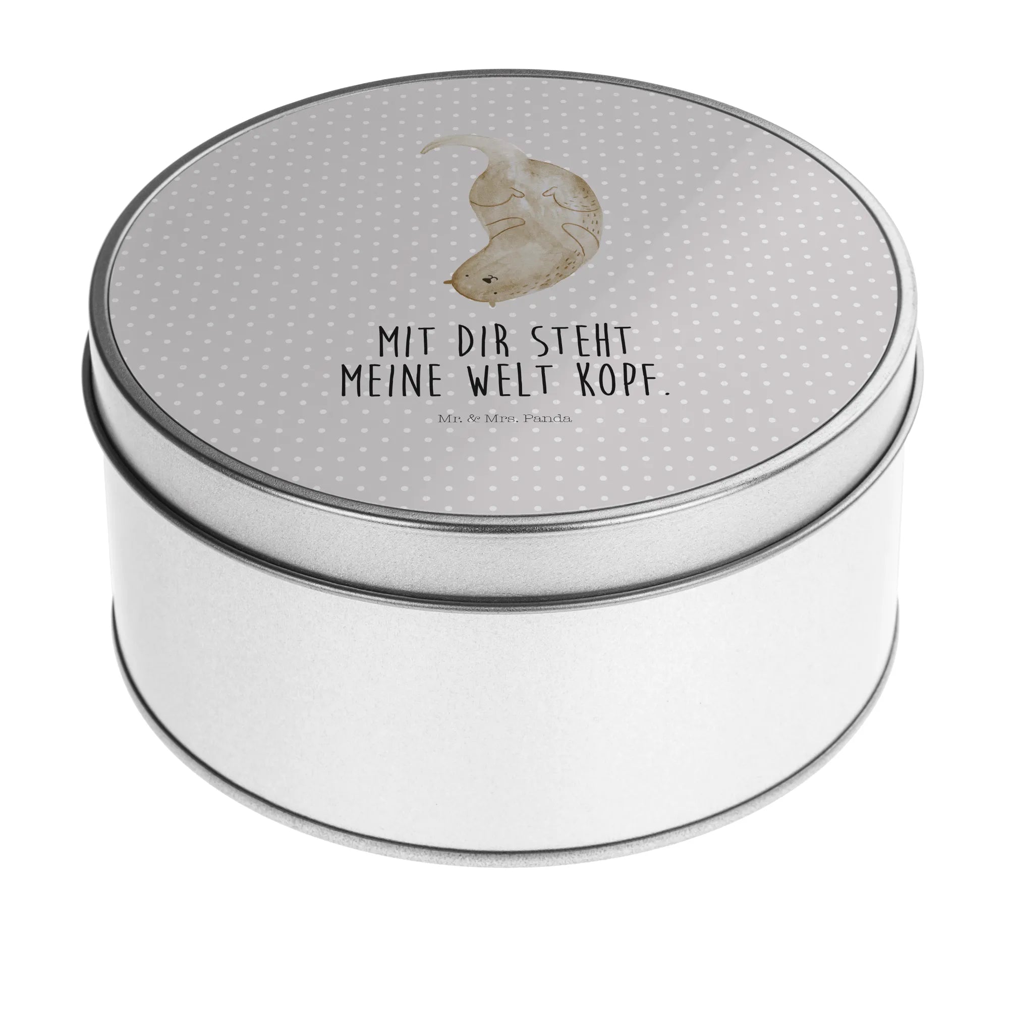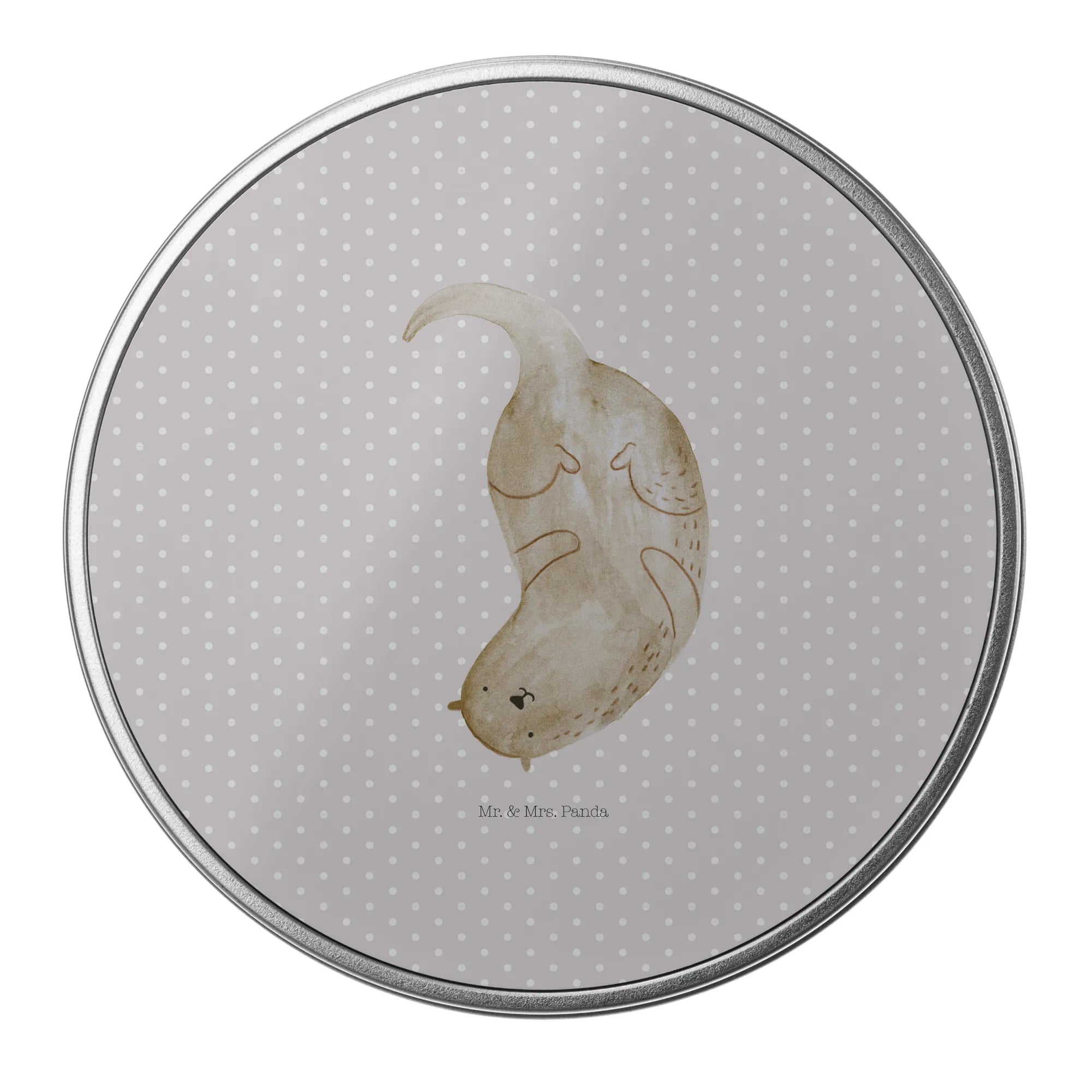 okrągła puszka z blachy wydra Do góry nogami - z napisem