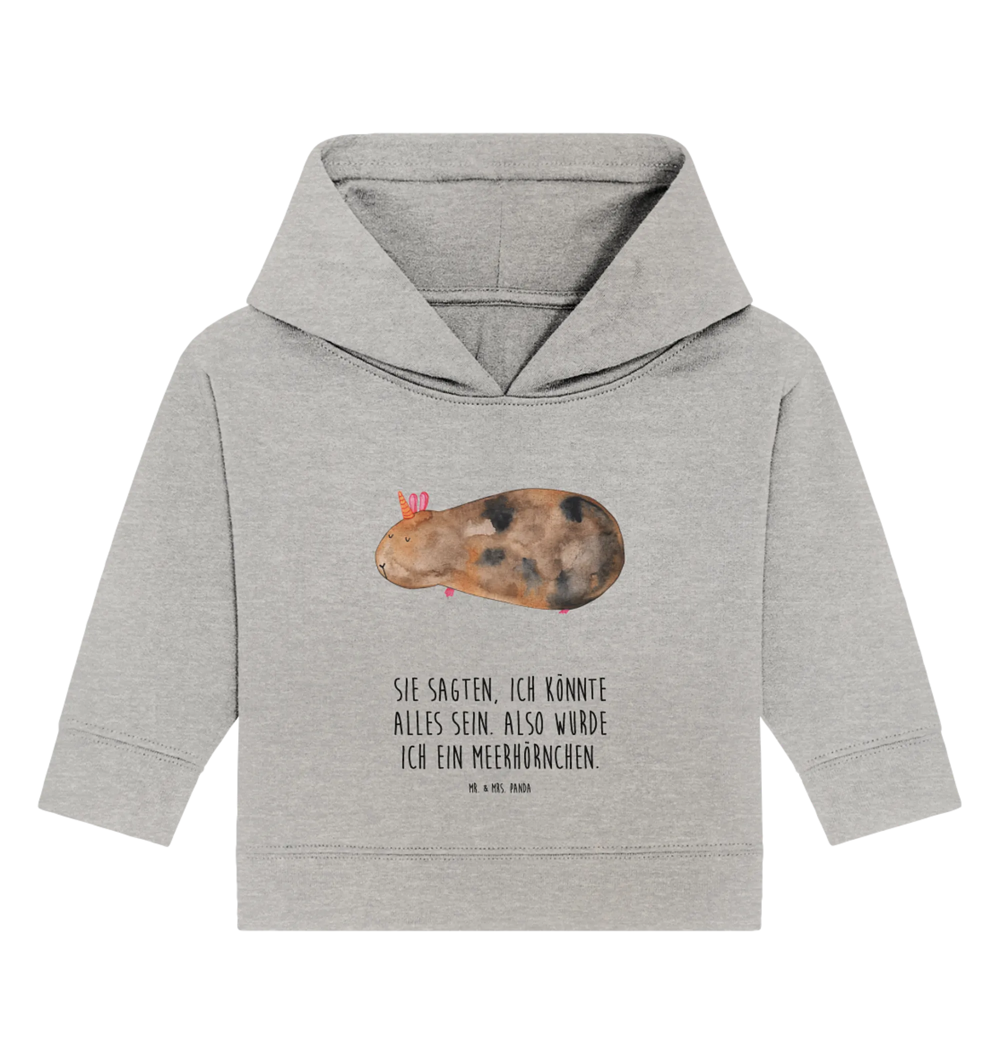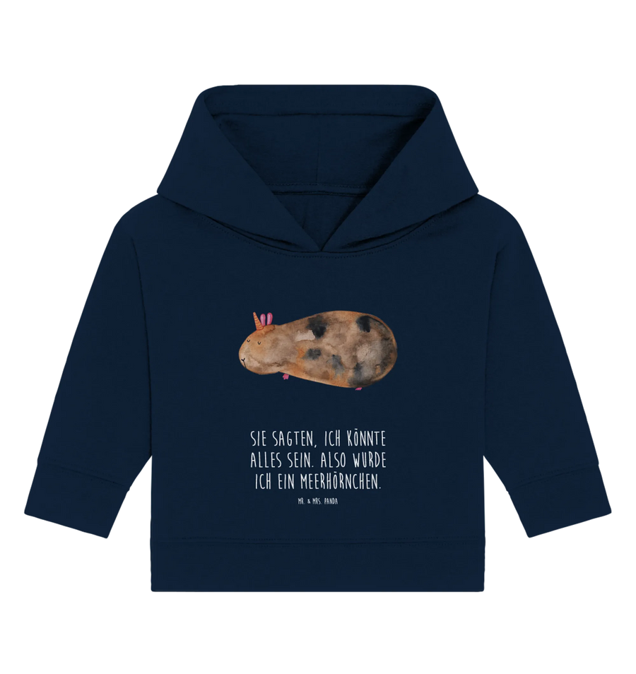 Das handgezeichnete Motiv zeigt ein niedliches Meerschweinchen mit einem Horn auf dem Kopf und wird zum Blickfang jeder Baby-Garderobe. Die liebevollen Sprüche auf dem Hoodie zaubern jedem ein Lächeln ins Gesicht. 'Sie sagten, ich könnte alles sein. Also wurde ich ein Meerhörnchen.' - dieser Spruch ist einfach zum Verlieben!