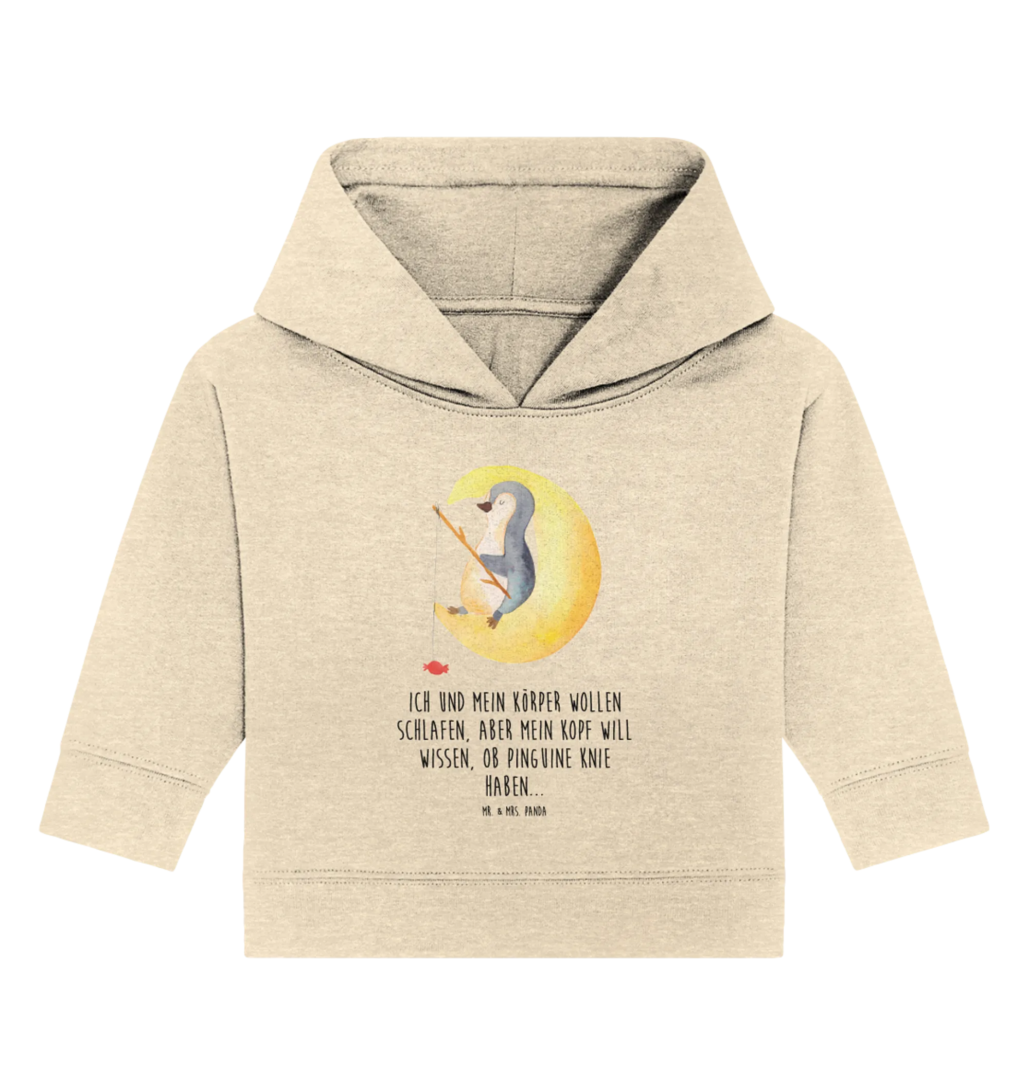 Die bedruckte Aquarellillustration und der liebevolle Spruch "Ich und mein Körper wollen schlafen, aber mein Kopf will wissen, ob Pinguine Knie haben..." machen das Kapuzensweatshirt zu einem ganz besonderen Geschenk. Ob zur Geburt, zur Taufe oder einfach nur so für zwischendurch, mit diesem Hoodie tust du nicht nur deinem kleinen Liebling, sondern auch den Eltern einen Gefallen. Jeder weiß, wie wichtig eine ruhige Nacht ist, besonders bei kleinen Schlafstörungen.