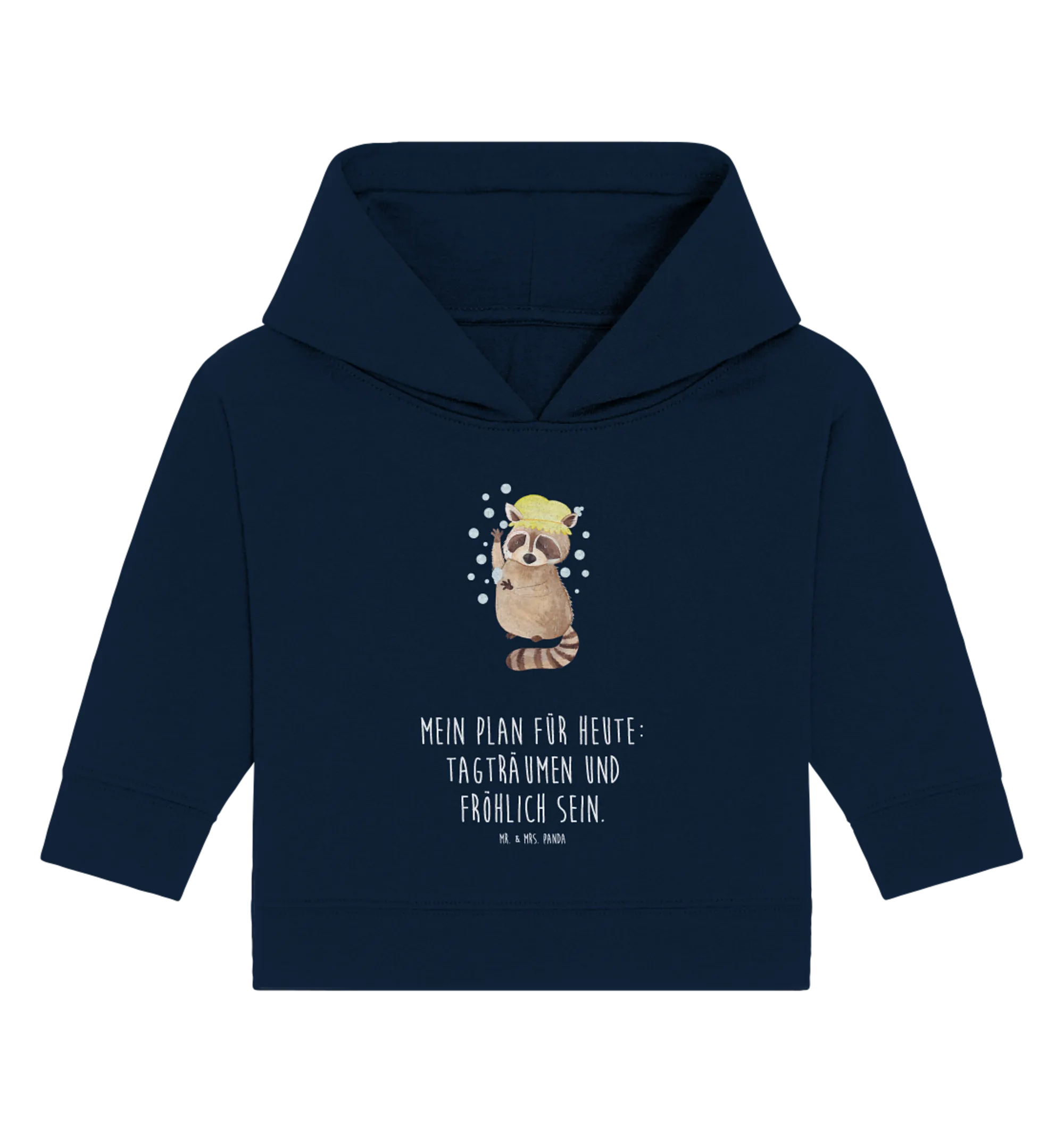 Der süße Waschbär bringt nicht nur gute Laune, sondern auch eine Portion Spaß in den Alltag deiner Kleinen. Das Design ist von Mrs. Panda liebevoll mit Aquarellfarben handgezeichnet worden und strahlt eine fröhliche Energie aus, die jedes Kinderherz höher schlagen lässt. Der Slogan "Mein Plan für heute: Tagträumen und fröhlich sein" macht unseren Hoodie zu einem perfekten Begleiter für kleine Abenteurer.