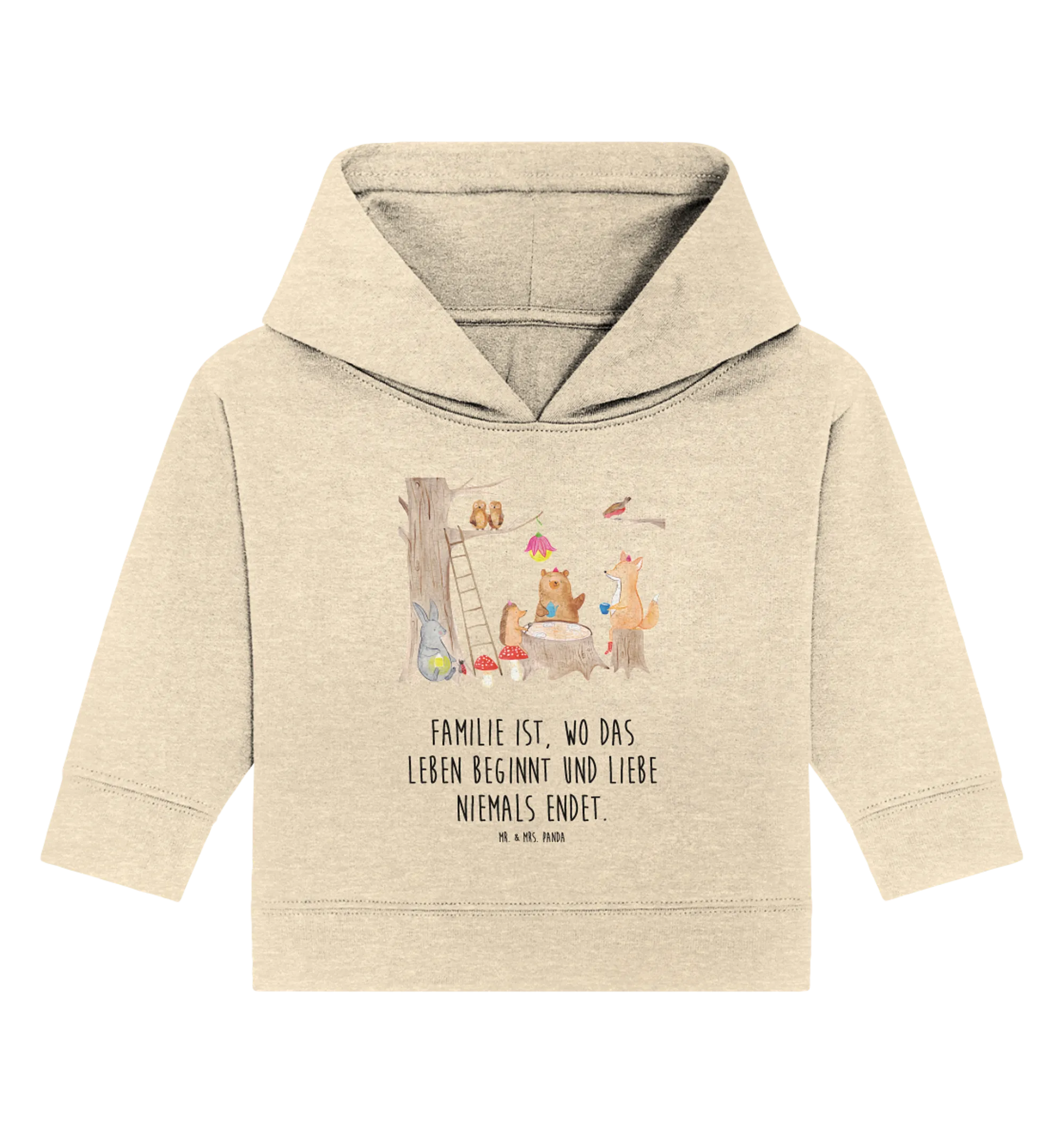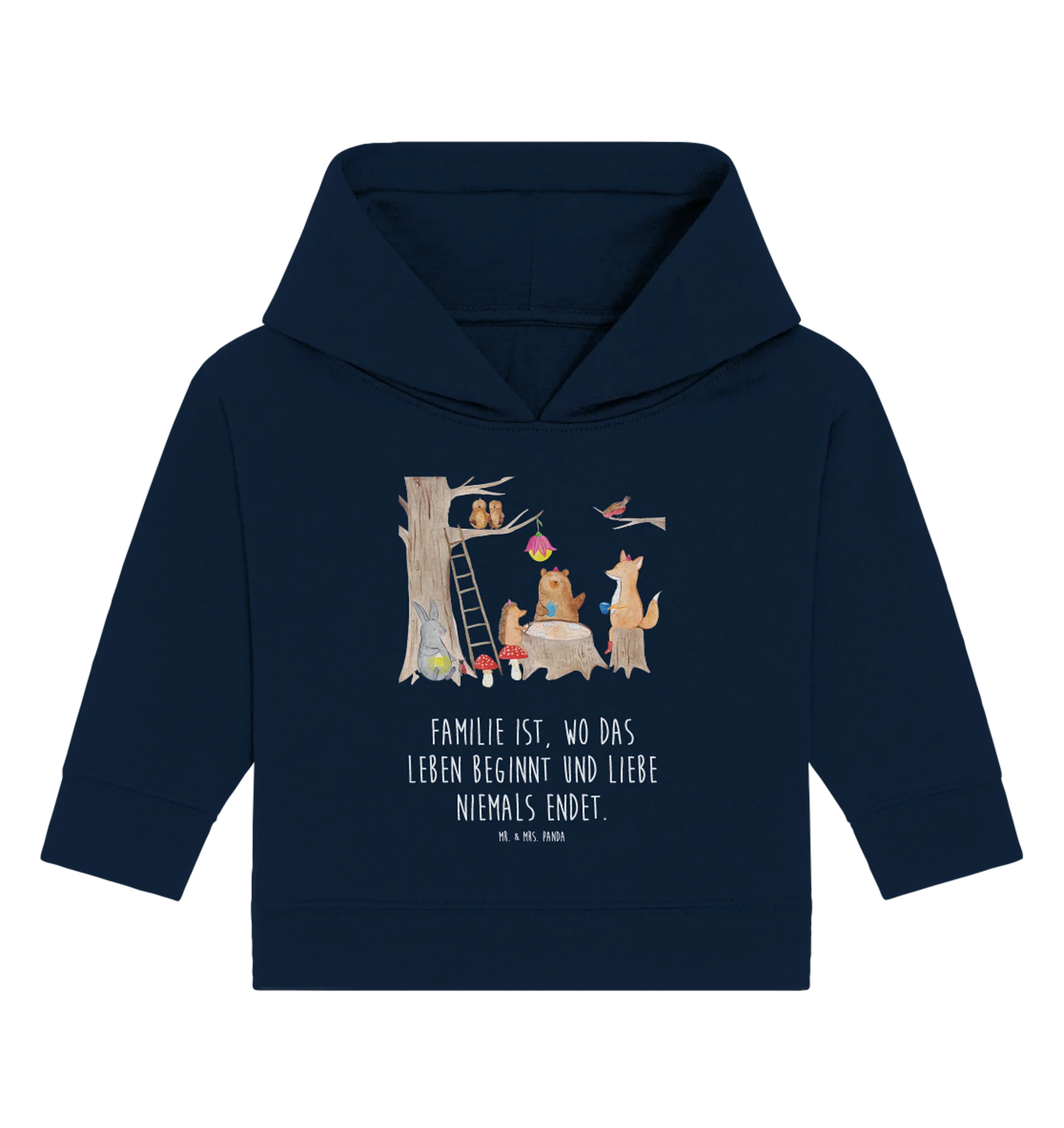 Mit dem Spruch "Familie ist, wo das Leben beginnt und Liebe niemals endet" wird dieses Hoodie zu einem besonderen Begleiter in der wichtigsten Zeit deines Lebens. Die Kollektion "Small World" ist geschaffen aus einer Vielzahl von fröhlichen Tiermotiven, die liebevoll von Mrs. Panda in Aquarell handgezeichnet wurden. Der Stoff besteht aus hochwertiger, ökologischer Baumwolle, die sanft zur zarten Kinderhaut ist und komfortabel genug für langen Spielspaß.