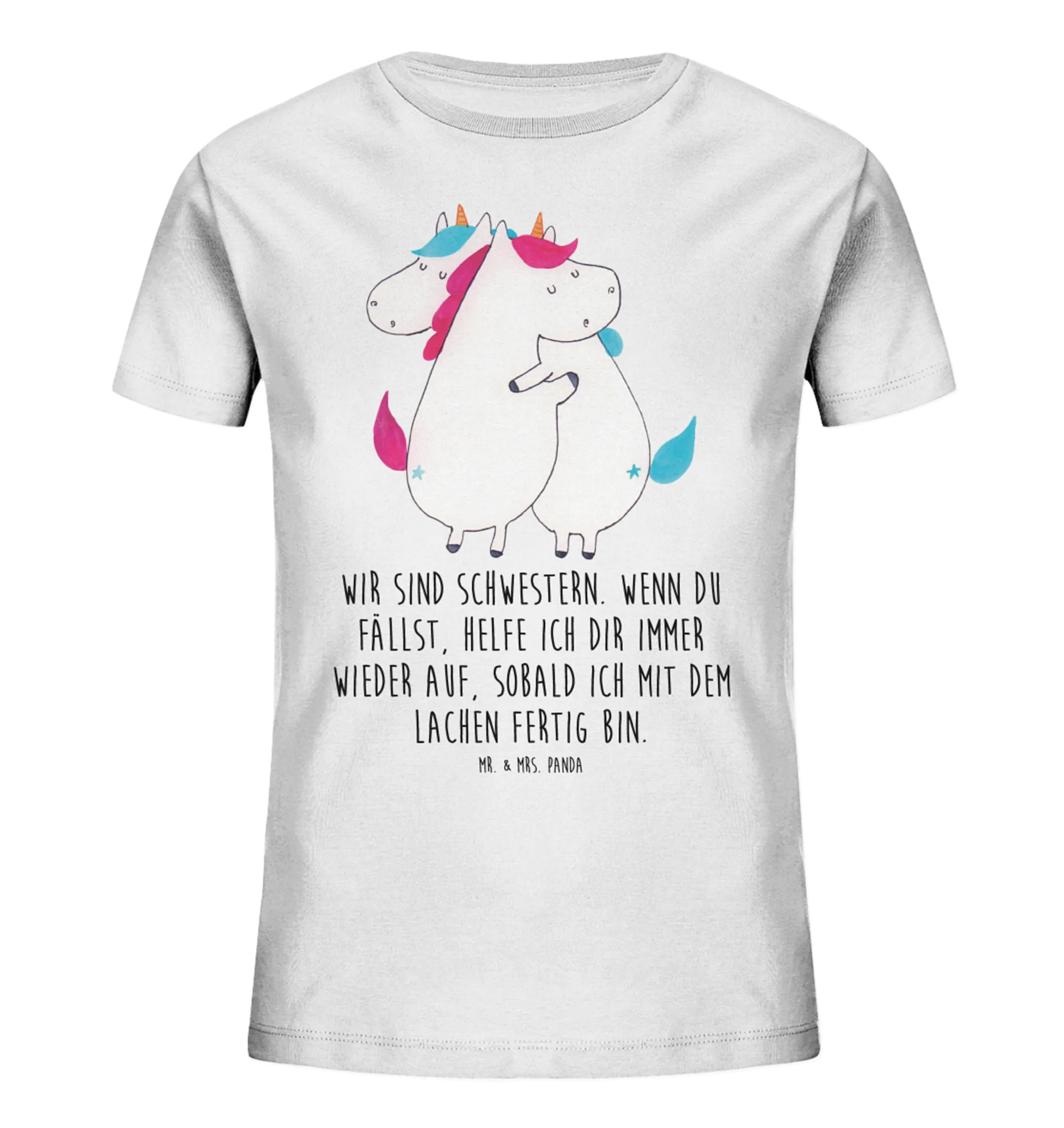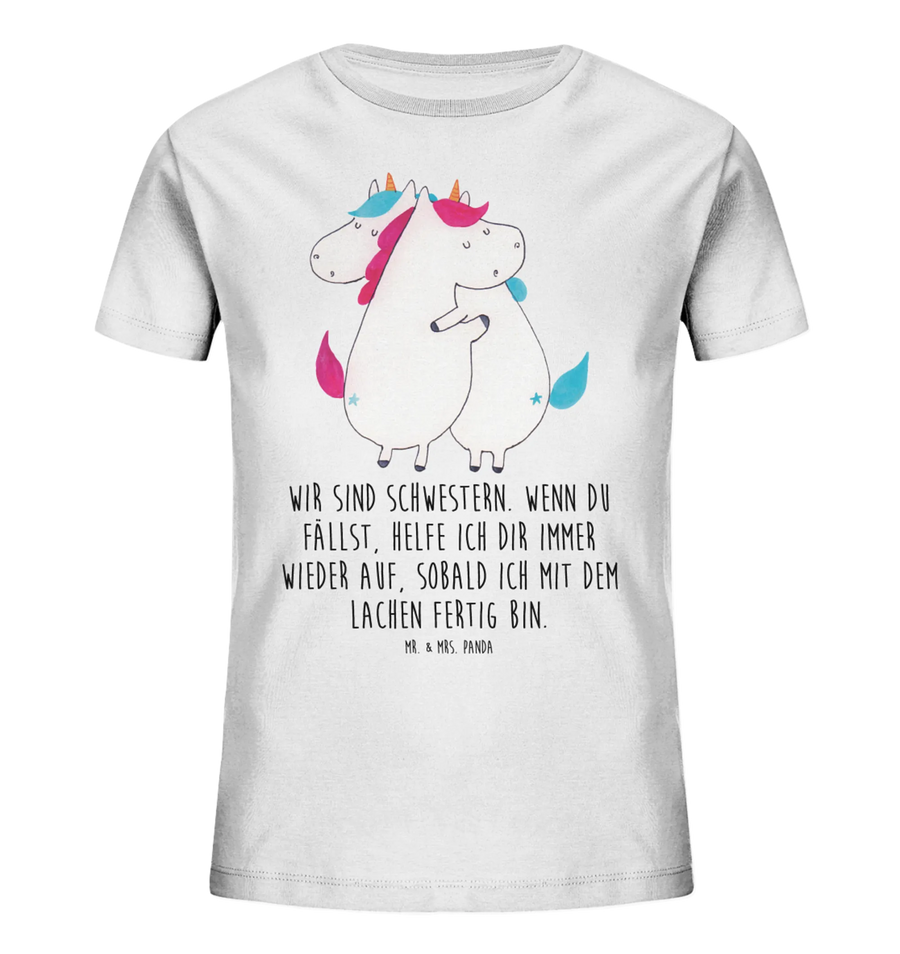 Das wunderschöne Organic Kinder T-Shirt "Einhörner Umarmen" von Mr. & Mrs. Panda ist das perfekte Geschenk für Kinder, die Einhörner lieben! Bedruckt mit zwei süßen Einhörnern, die sich fröhlich umarmen, bringt dieses Shirt eine zauberhafte Botschaft der Geschwisterliebe mit sich: "Wir sind Schwestern. Wenn du fällst, helfe ich dir immer wieder auf, sobald ich mit dem Lachen fertig bin." Egal, ob zum Geburtstag, zu Weihnachten oder einfach so – dieses T-Shirt sorgt für strahlende Augen!