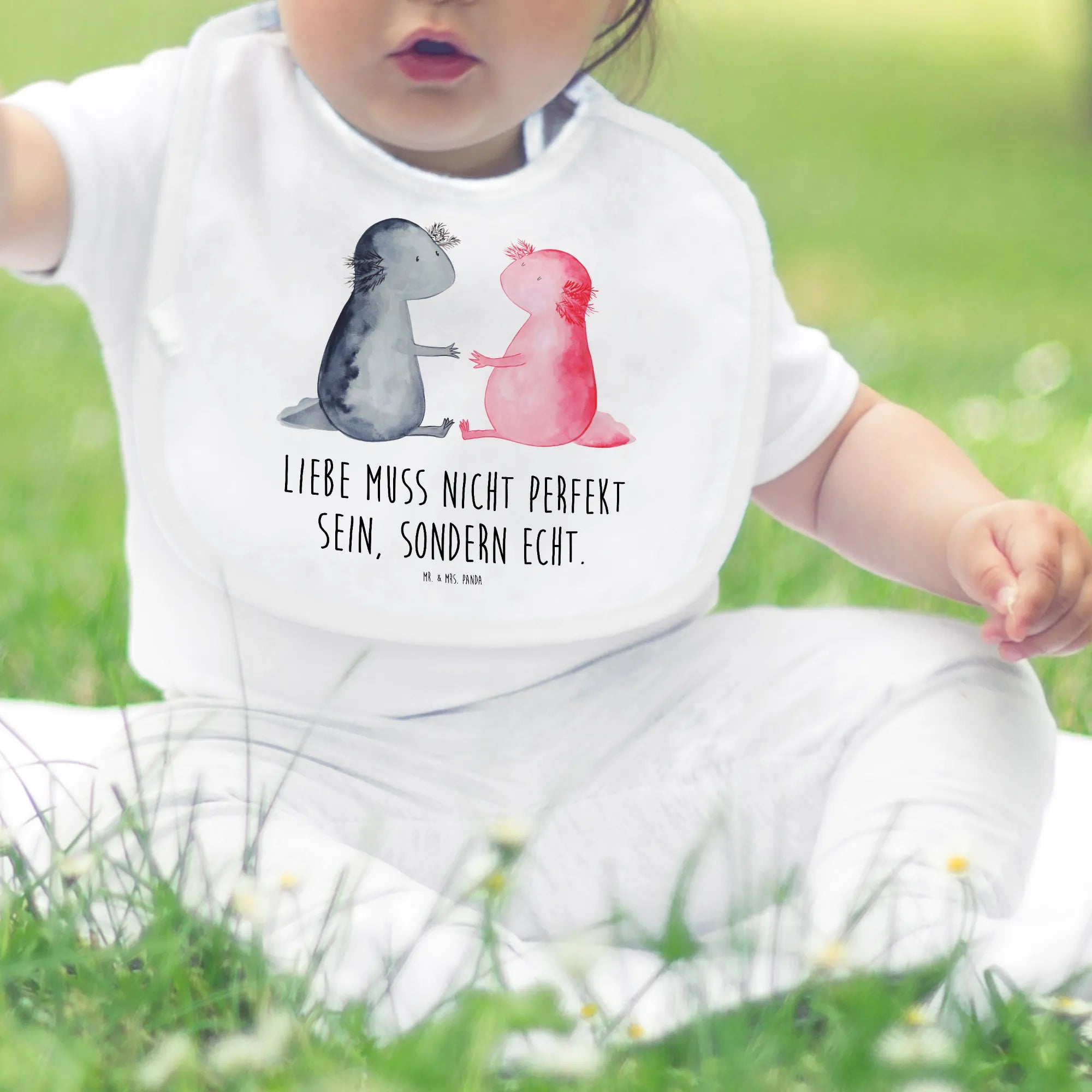 Es schützt die Kleidung Deines Babys vor den kleinen Missgeschicken beim Füttern und sorgt dabei für ein ganz besonderes Design. Die süßen Axolotl, die Händchen haltend nebeneinander sitzen, sind nicht nur niedlich, sondern drücken auch eine herzerwärmende Botschaft aus: "Liebe muss nicht perfekt sein, sondern echt".