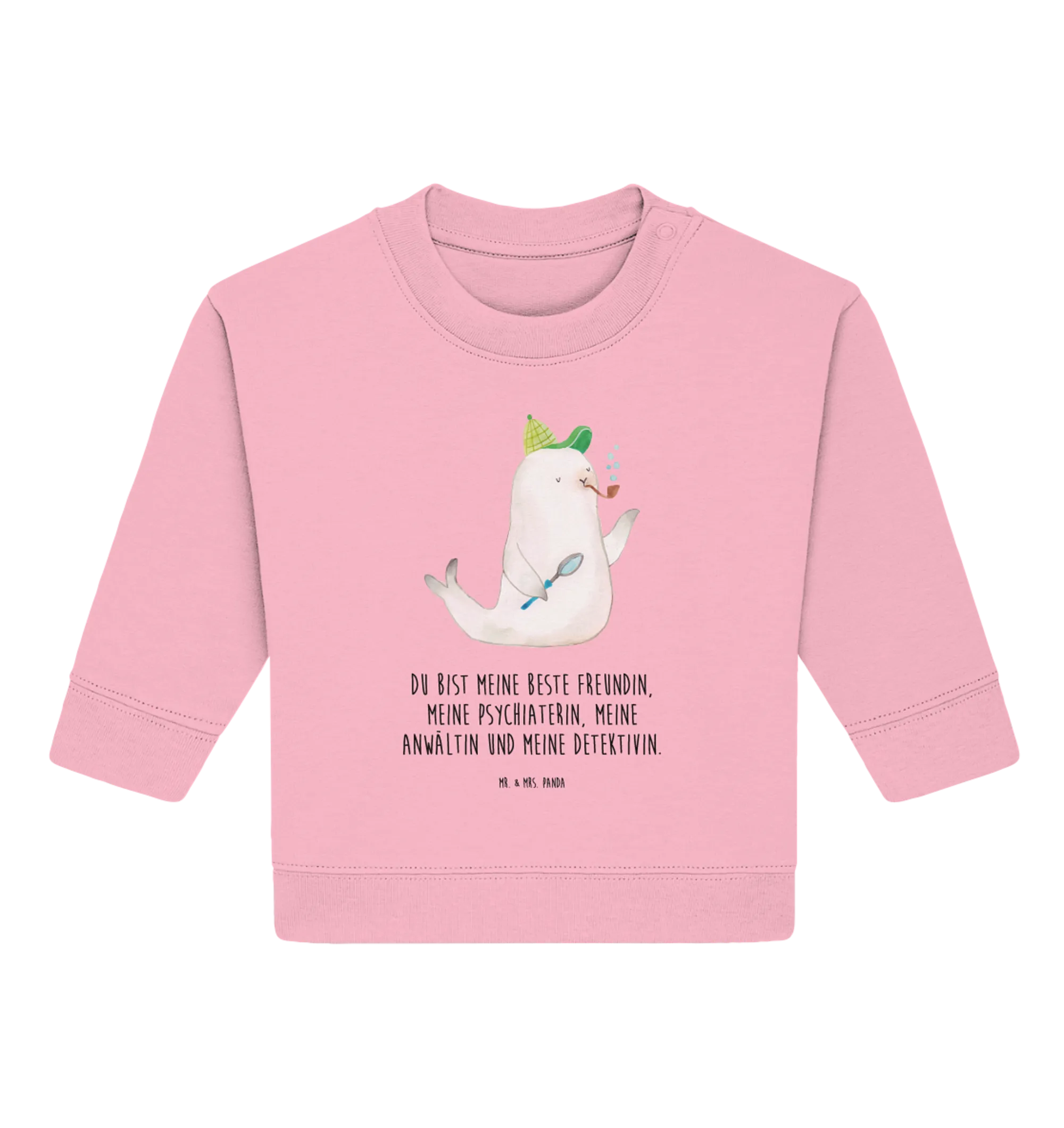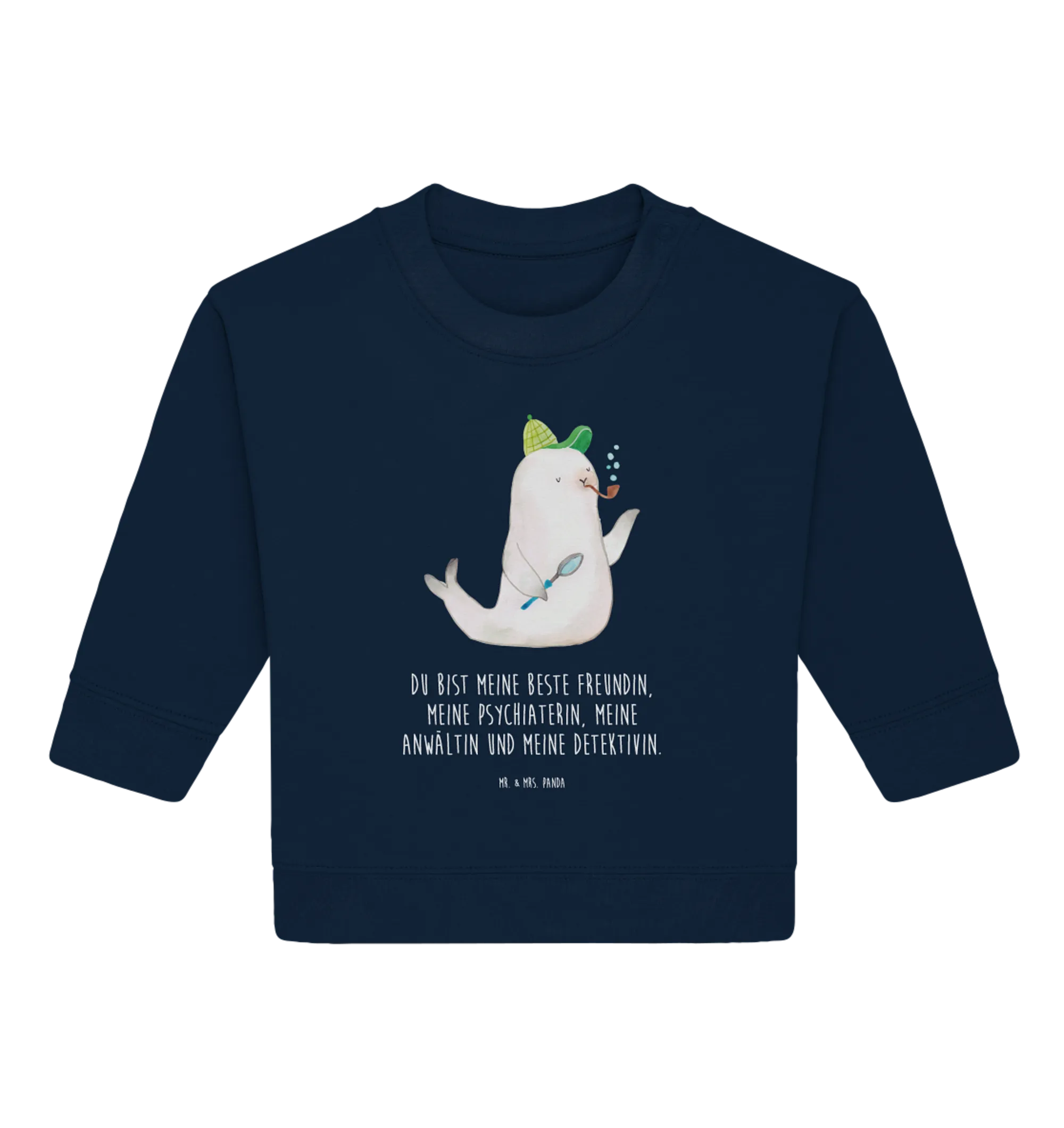 Die liebevollen Designs von Mr. & Mrs. Panda sind nicht nur schön, sondern regen auch die Fantasie an. Auf der Vorderseite des Pullovers findest du die niedliche Robbe Sherlock, die immer auf der Suche nach dem nächsten Abenteuer ist. Das Motiv wird mit dem witzigen Spruch „Du bist meine beste Freundin, meine Psychiaterin, meine Anwältin und meine Detektivin“ kombiniert, was es zu einem perfekten Geschenk für kleine und große Freundinnen macht.