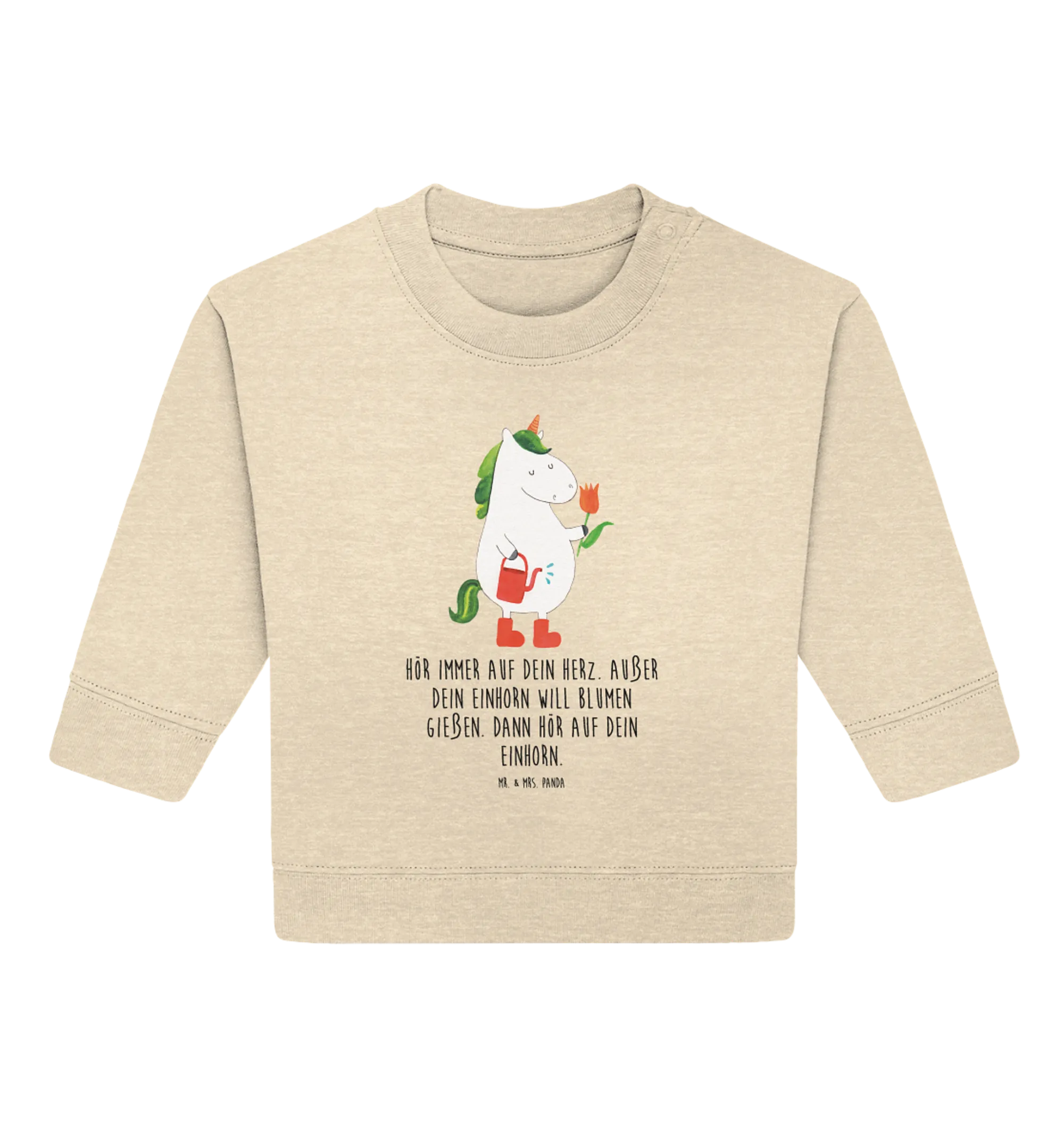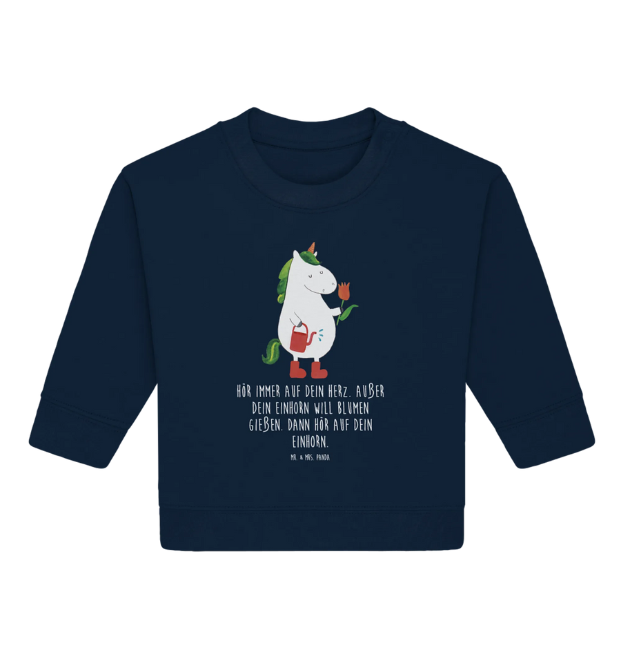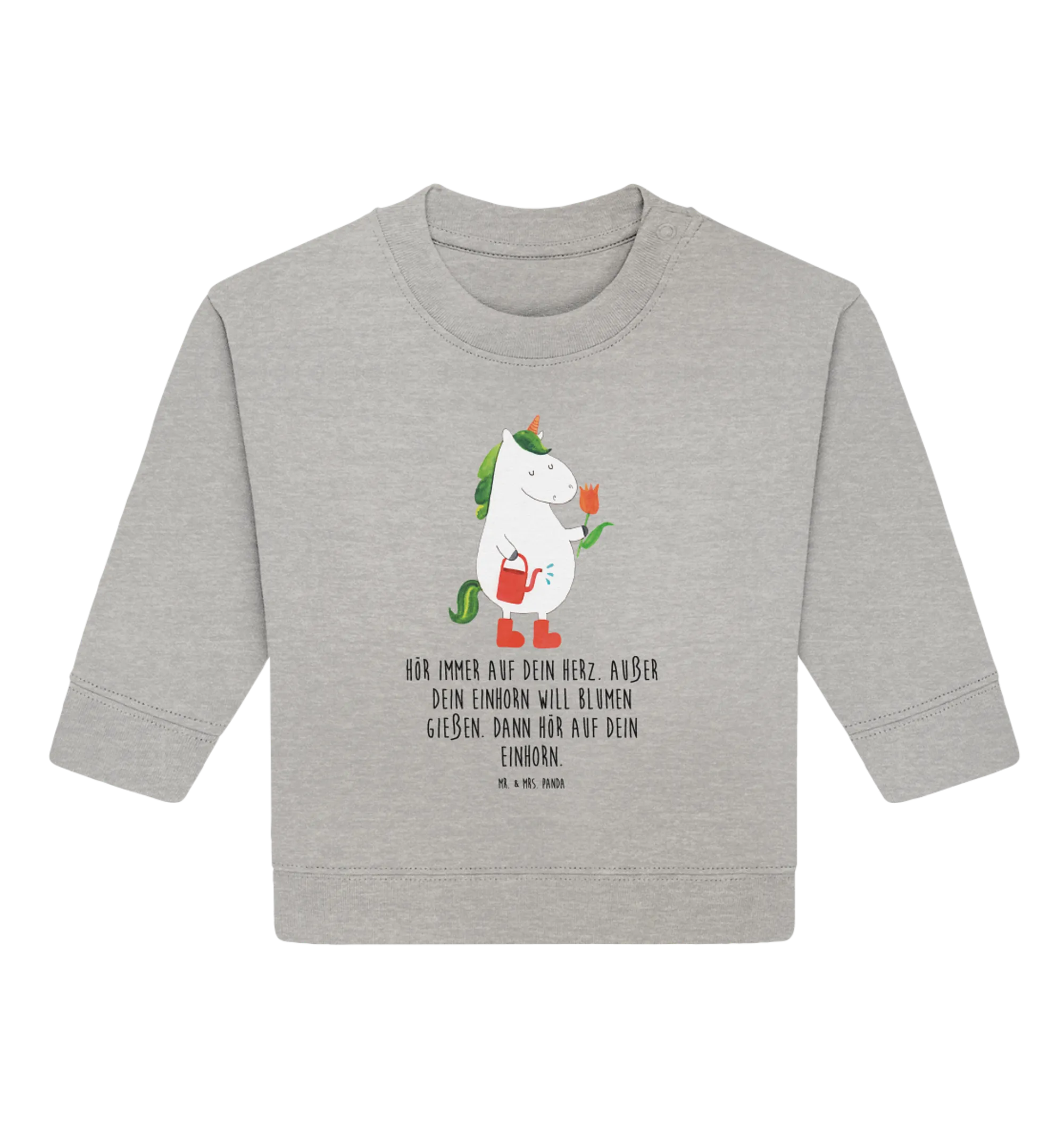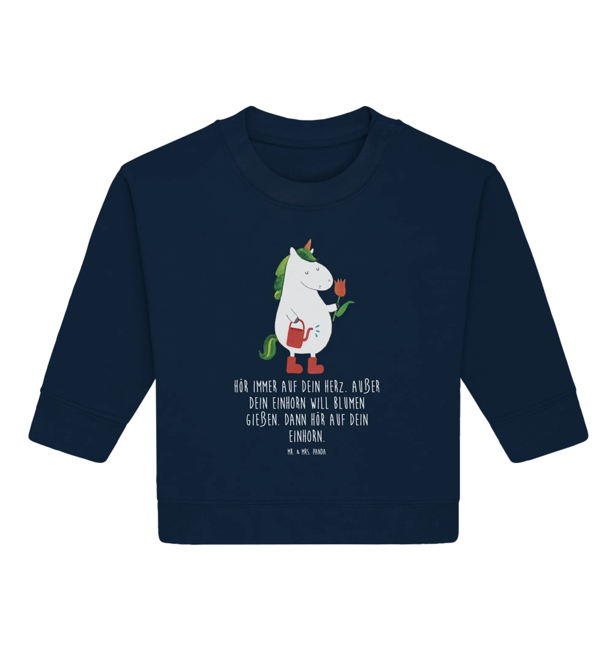 Der Organic Baby Pullover Einhorn Gärtner aus der zauberhaften Einhorn-Kollektion von Mr. & Mrs. Panda ist das perfekte Geschenk für kleine Einhorn-Liebhaber! Mit seinem liebevollen, handgezeichneten Einhorn-Motiv, das fröhlich Blumen gießt, ist dieser Pullover nicht nur ein echter Blickfang, sondern vermittelt auch eine wunderbare Botschaft. Der süße Spruch "Hör immer auf dein Herz. Außer dein Einhorn will Blumen gießen. Dann hör auf dein Einhorn." lädt dazu ein, der eigenen Fantasie freien Lauf zu lassen.
