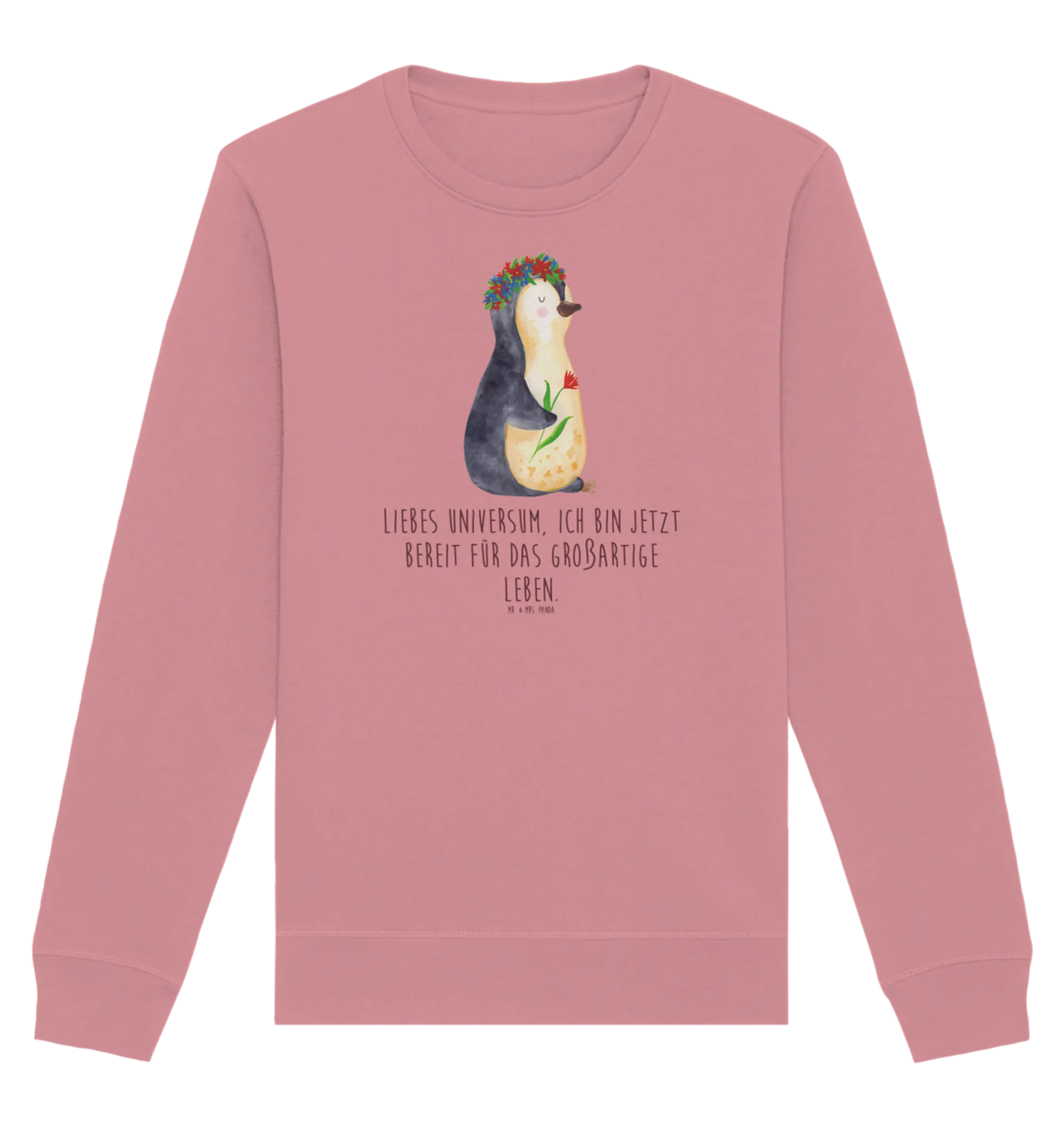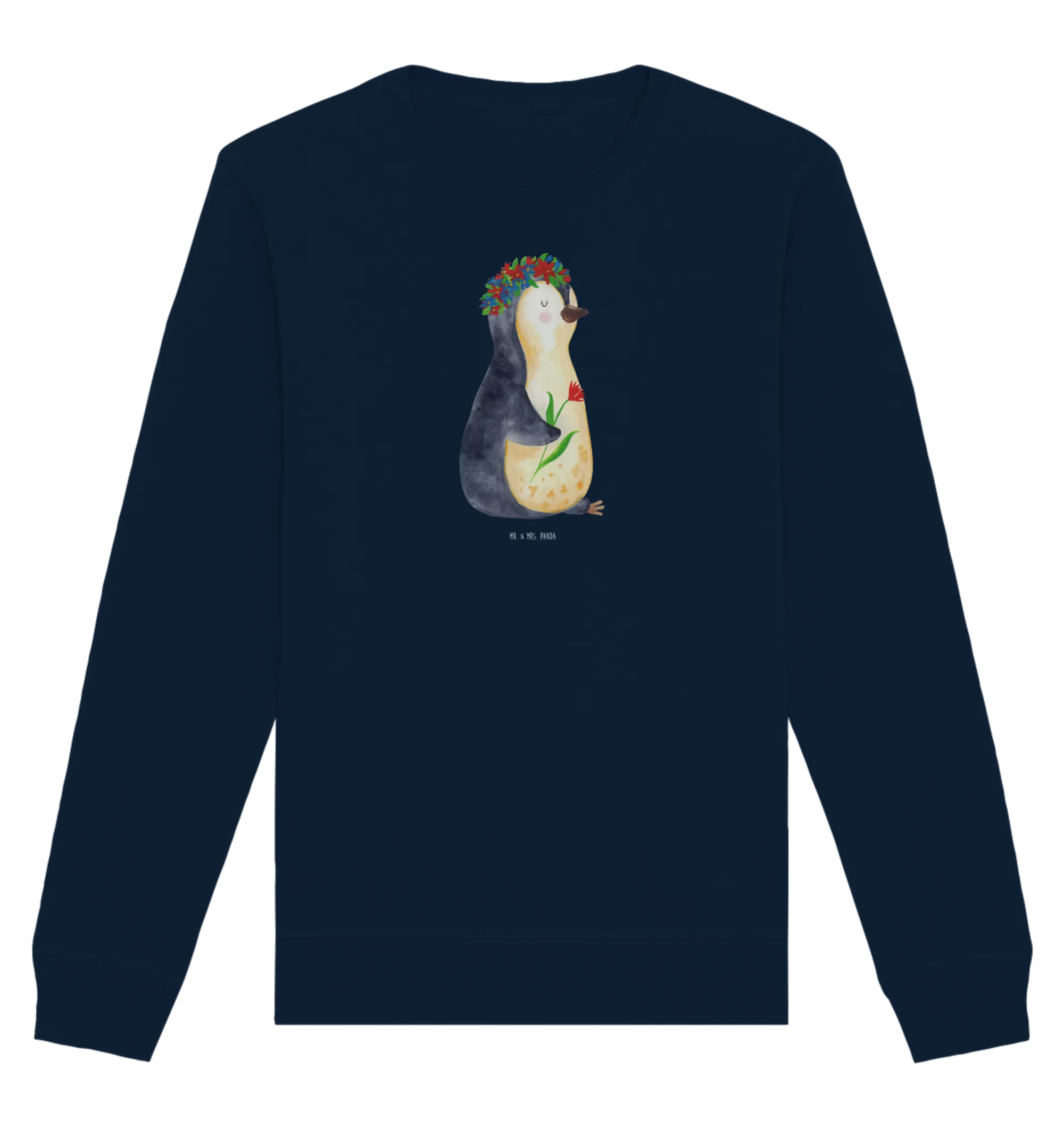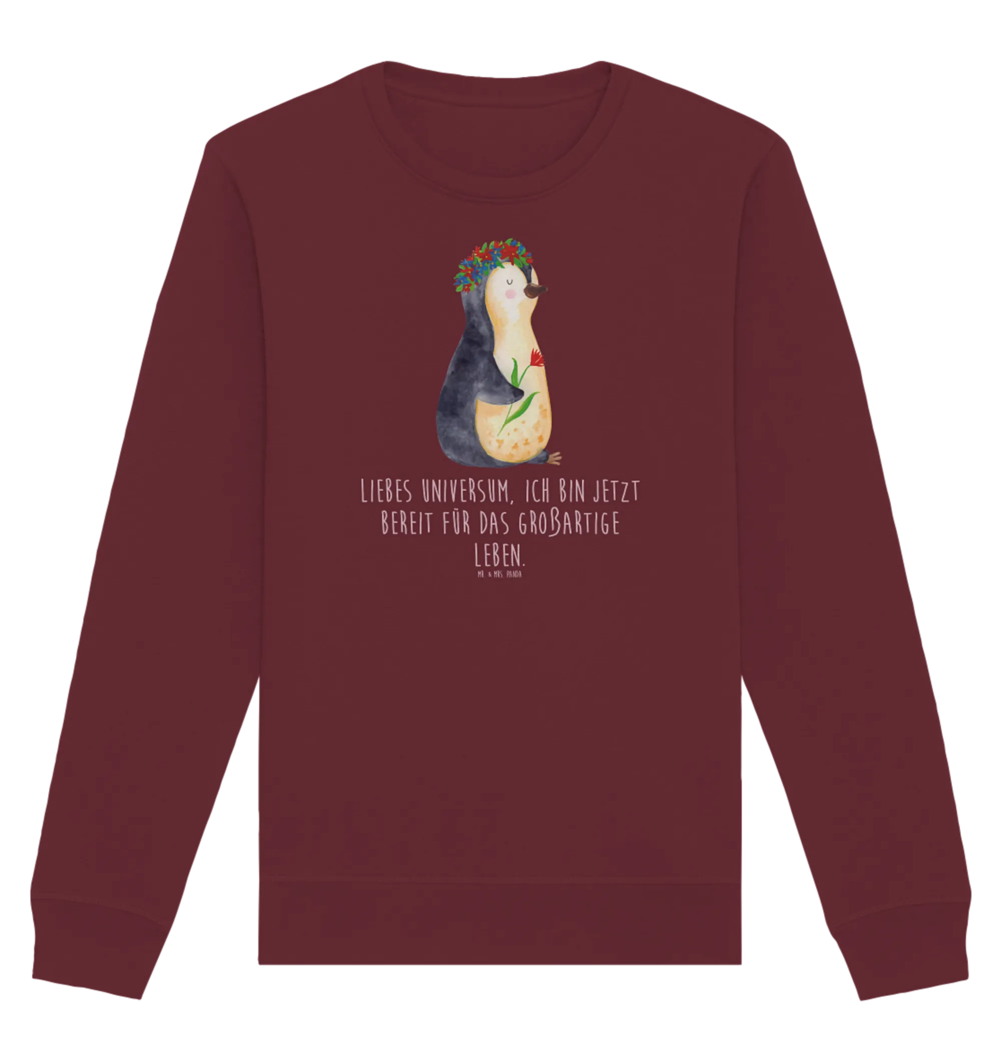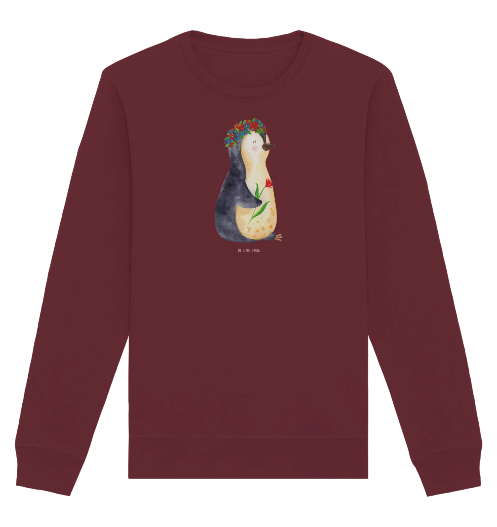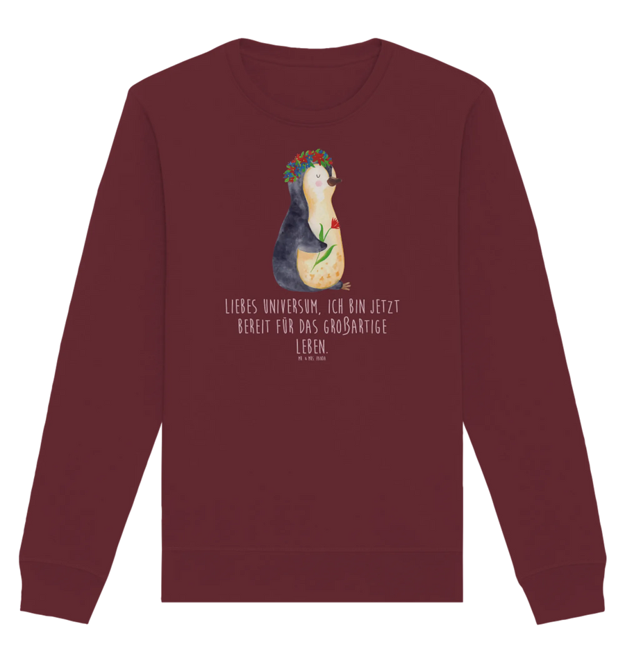 Der Organic Pullover mit dem zauberhaften Pinguin Blumenkranz ist das perfekte Geschenk für all jene, die Lebensfreude und Motivation lieben. Gepaart mit einem tiefen Burgunder-Rot, bringt dieser Pullover nicht nur Farbe, sondern auch einen Hauch von Eleganz in Deinen Kleiderschrank. Jeder Pinguin ist handgezeichnet von Mrs. & Mr. Panda und strahlt Lebenslust und Freude aus.