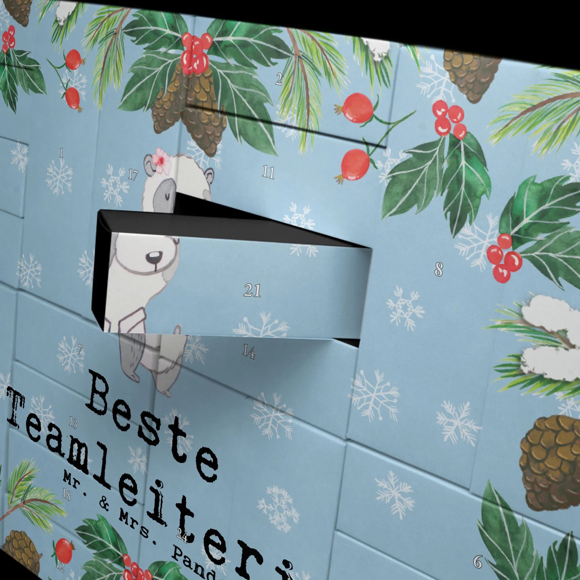Die Kollektion Beziehungen von Mr. & Mrs. Panda besteht aus mehr als 150 liebevoll handgezeichneten Motiven, die alle dafür geschaffen wurden, um Freude zu verschenken und Wertschätzung auszudrücken. Dein befüllbarer Adventskalender "Panda Beste Teamleiterin" ist dabei der perfekte Ausdruck deiner Anerkennung für die Menschen, die dir wichtig sind.