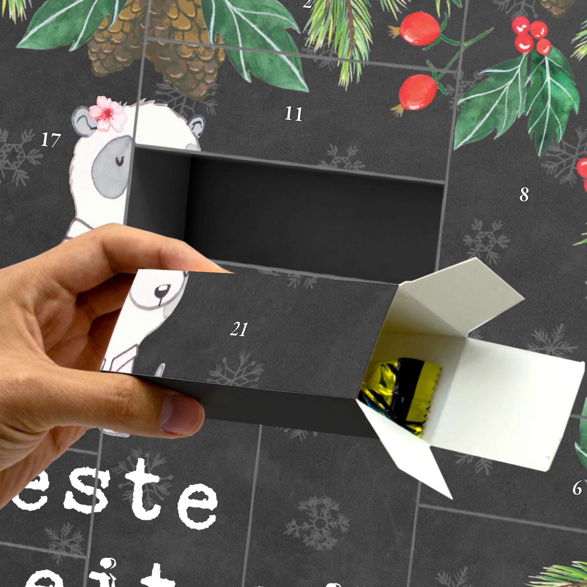 Der befüllbare Adventskalender "Panda Beste Teamleiterin" von Mr. & Mrs. Panda ist das perfekte Geschenk für jede Teamleiterin, Seminarleiterin oder Kollegin, die du wertschätzen möchtest! Mit seinem niedlichen Panda-Motiv und dem liebevollen Slogan "Beste Teamleiterin" zaubert dieser Adventskalender jedem ein Lächeln ins Gesicht.