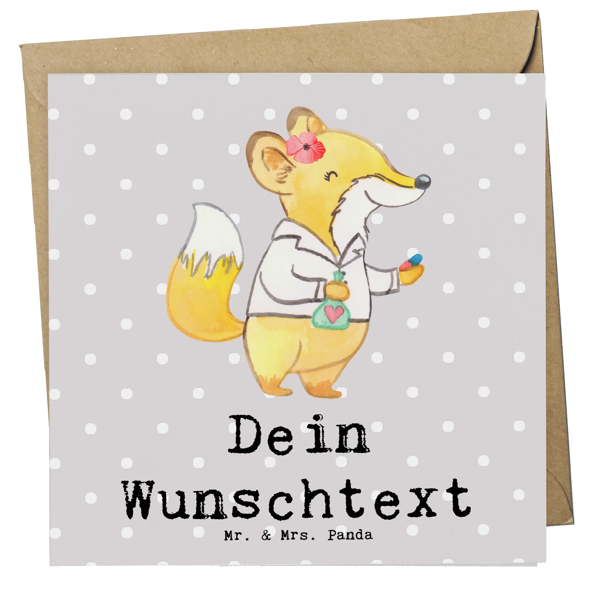 Die personalisierte Deluxe Karte "Apothekerin mit Herz" von Mr. & Mrs. Panda ist das perfekte Geschenk für jeden Anlass oder um einfach einmal Danke zu sagen. Diese wunderschöne und hochwertige quadratische Karte mit den Maßen 140 mm x 140 mm überzeugt durch ihr liebevolles Design. Das charmante Motiv zeigt eine niedliche Fuchsdame im weißen Kittel, ausgestattet mit einer Tablette und einem Reagenzglas – und das ganz im Zeichen des Apothekerberufs.