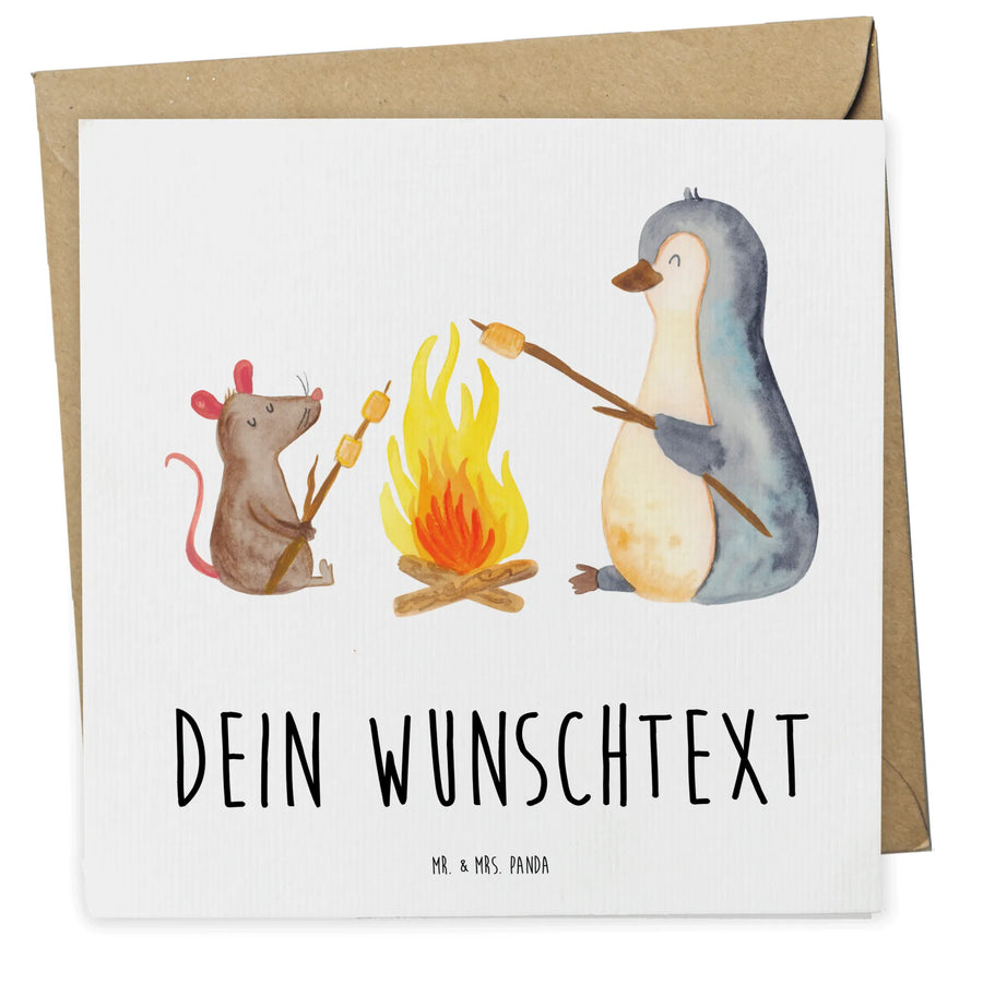 Die Vorderseite zeigt einen niedlichen Pinguin und eine liebliche Maus, die gemütlich am Lagerfeuer sitzen und Marshmallows rösten. Dieses Motiv strahlt nicht nur Wärme und Geborgenheit aus, sondern vermittelt auch eine Botschaft von Freundschaft und Zweisamkeit.
