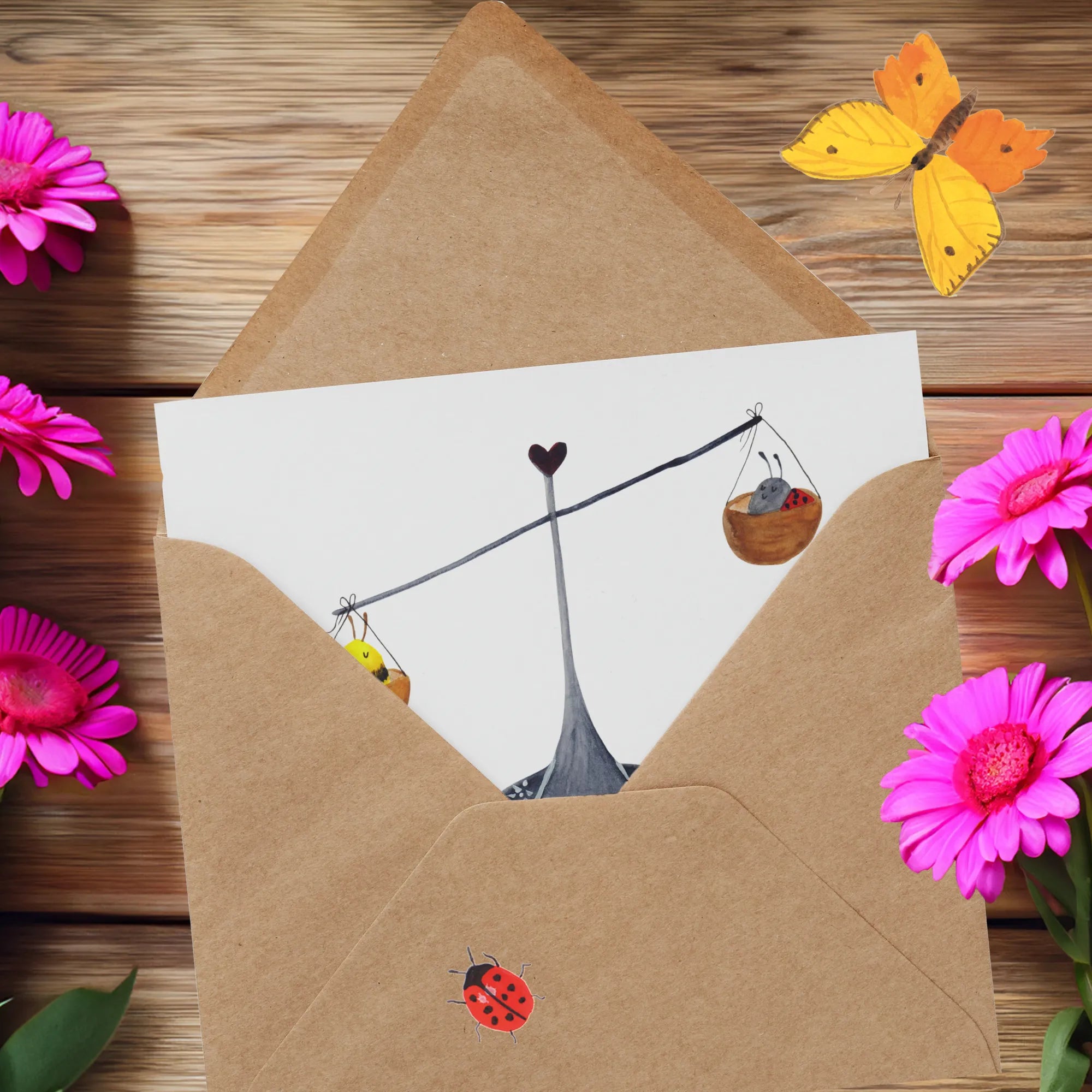 Das Motiv zeigt eine klassische Waage, auf der ein süßer Marienkäfer und eine putzige Hummel sitzen – sie helfen dem Bild, das Gleichgewicht zu halten. Du kannst deine Karte mit einem eigenen Text personalisieren, sei es mit einem Namen oder einer herzlichen Botschaft, um die Karte noch spezieller zu machen.