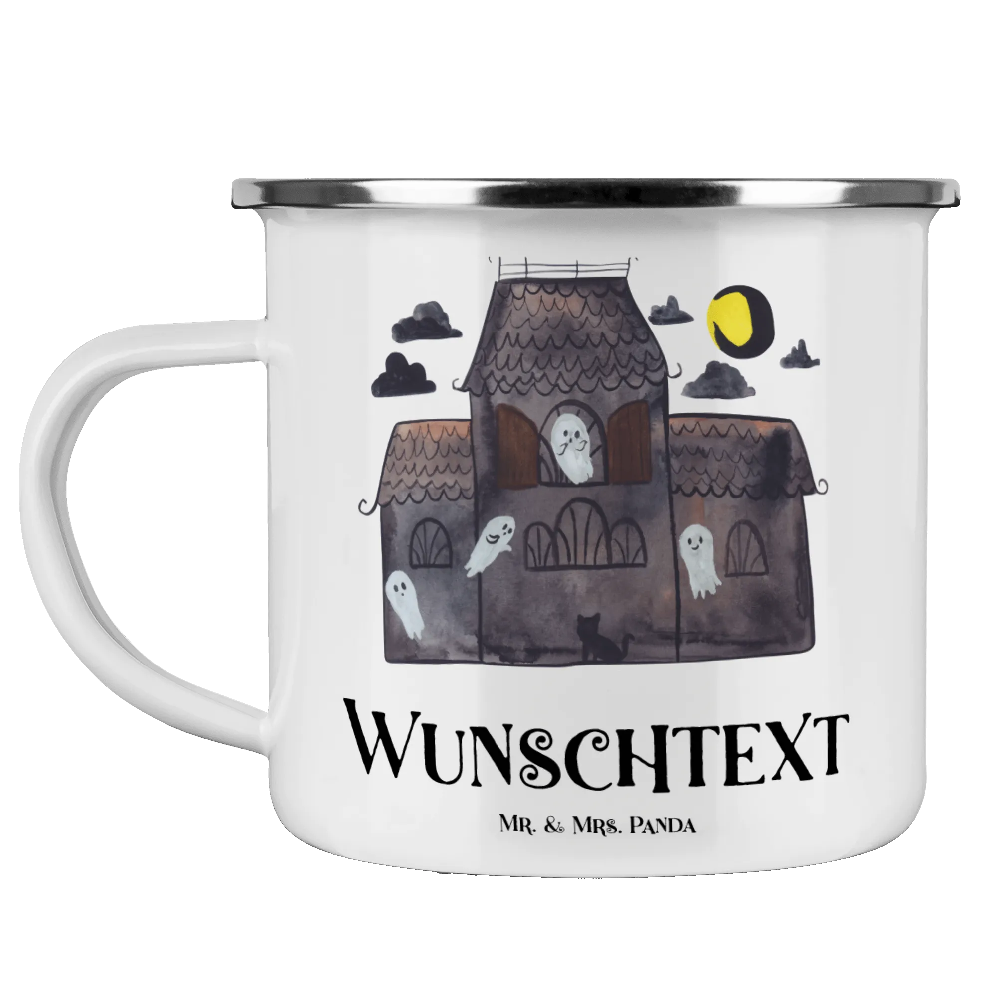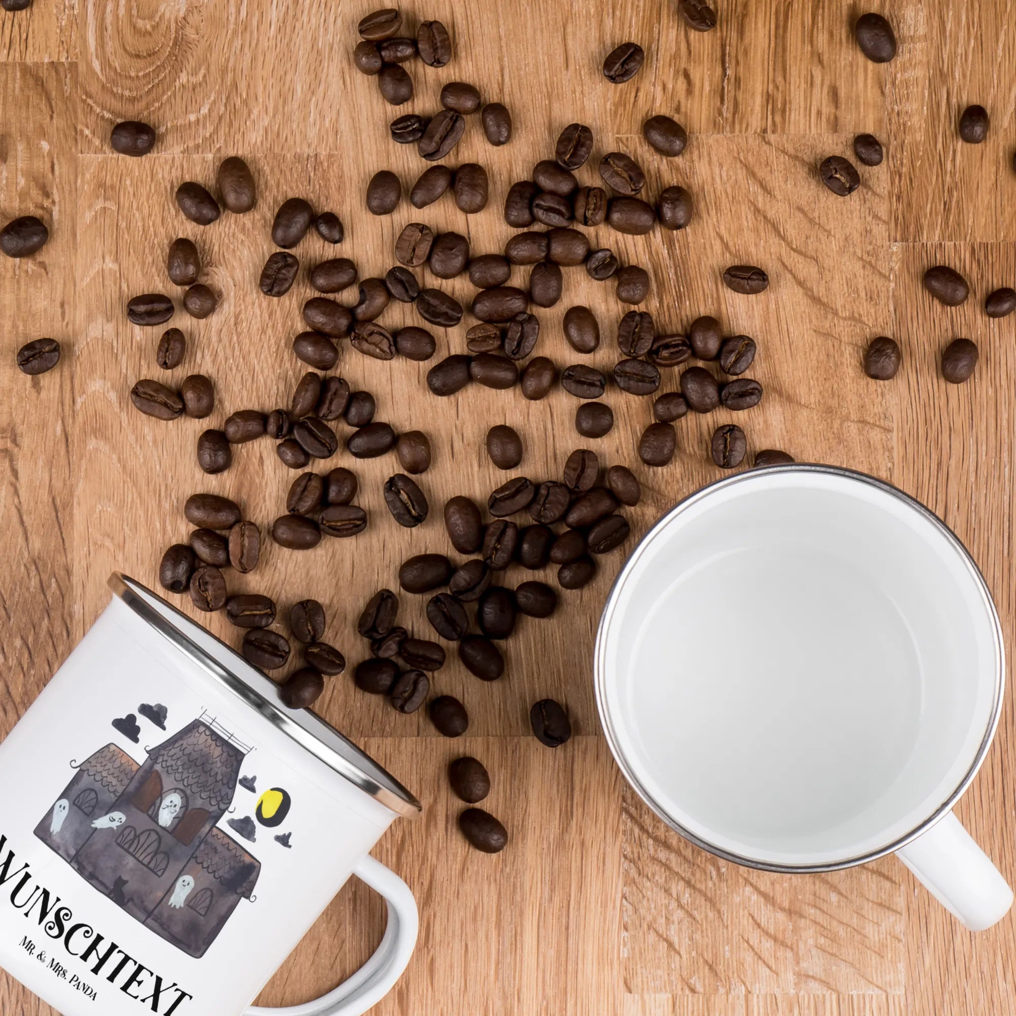 Die personalisierte Emaille Tasse Geister Villa von Mr. & Mrs. Panda ist das perfekte Geschenk für alle Halloween-Fans! Egal, ob du sie für dich selbst oder als liebevolles Präsent für einen Freund oder ein Familienmitglied suchst, diese einzigartige Tasse ist einfach zauberhaft. Mit einem fröhlichen, gespenstischen Motiv, das eine schaurige Villa bei Nacht zeigt, umgeben von gelben Mondstrahlen und gemeinsamen Wolken, bringt diese Tasse den Halloween-Geist direkt in dein Zuhause. Vorhanden sind auch fröhliche Geister und eine mysteriöse schwarze Katze, die das Bild vervollständigt.