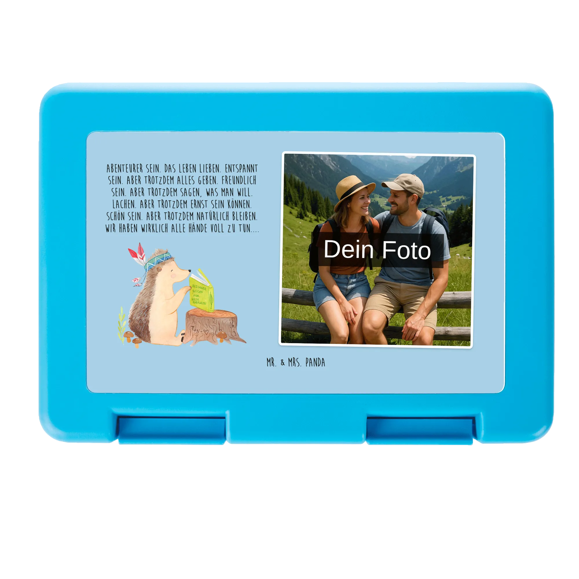 Personalisierte Foto Brotdose Igel Federschmuck - Blau Pastell
