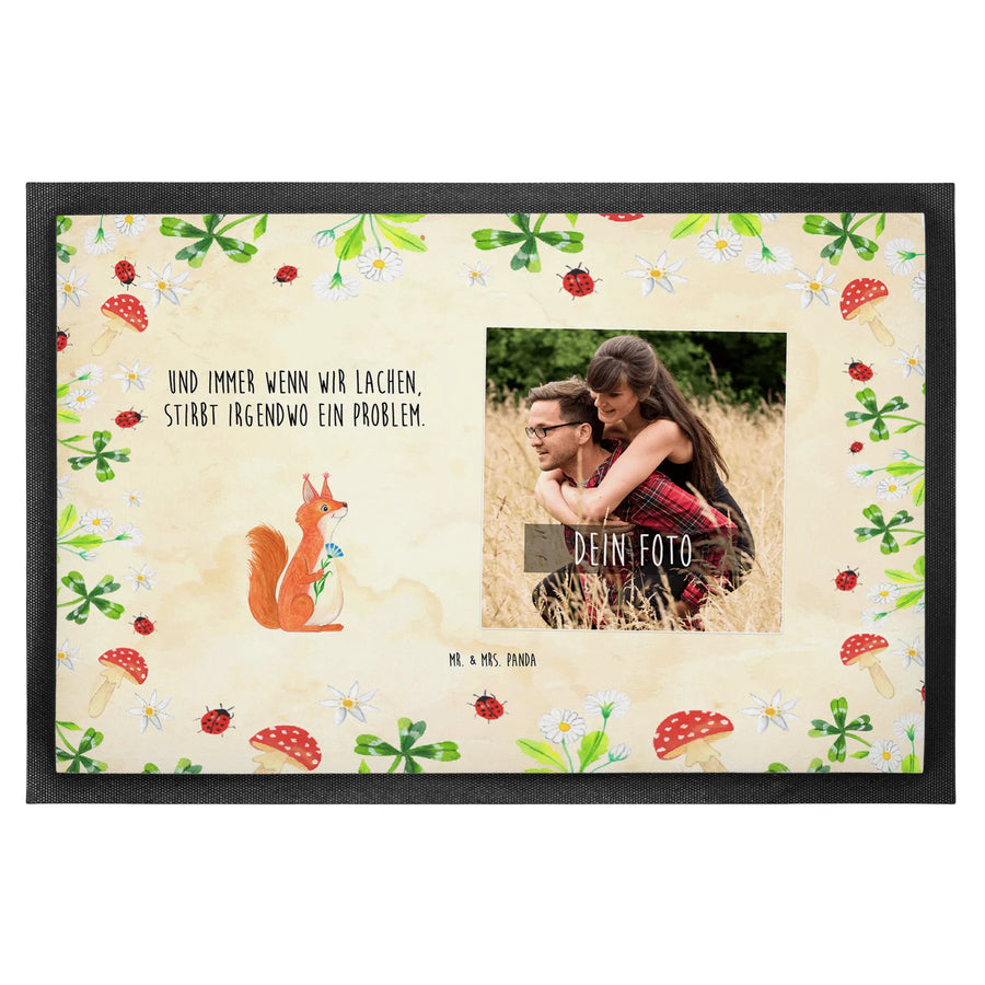 Personalisierte Foto Fußmatte "Eichhörnchen Blume" – Ein fröhlicher Empfang für dein Zuhause aus der Small World Kollektion von Mr. & Mrs. Panda. Das niedliche Eichhörnchen mit Blume und der liebevolle Spruch Und immer wenn wir lachen, stirbt irgendwo ein Problem. sorgen jeden Tag für gute Laune.