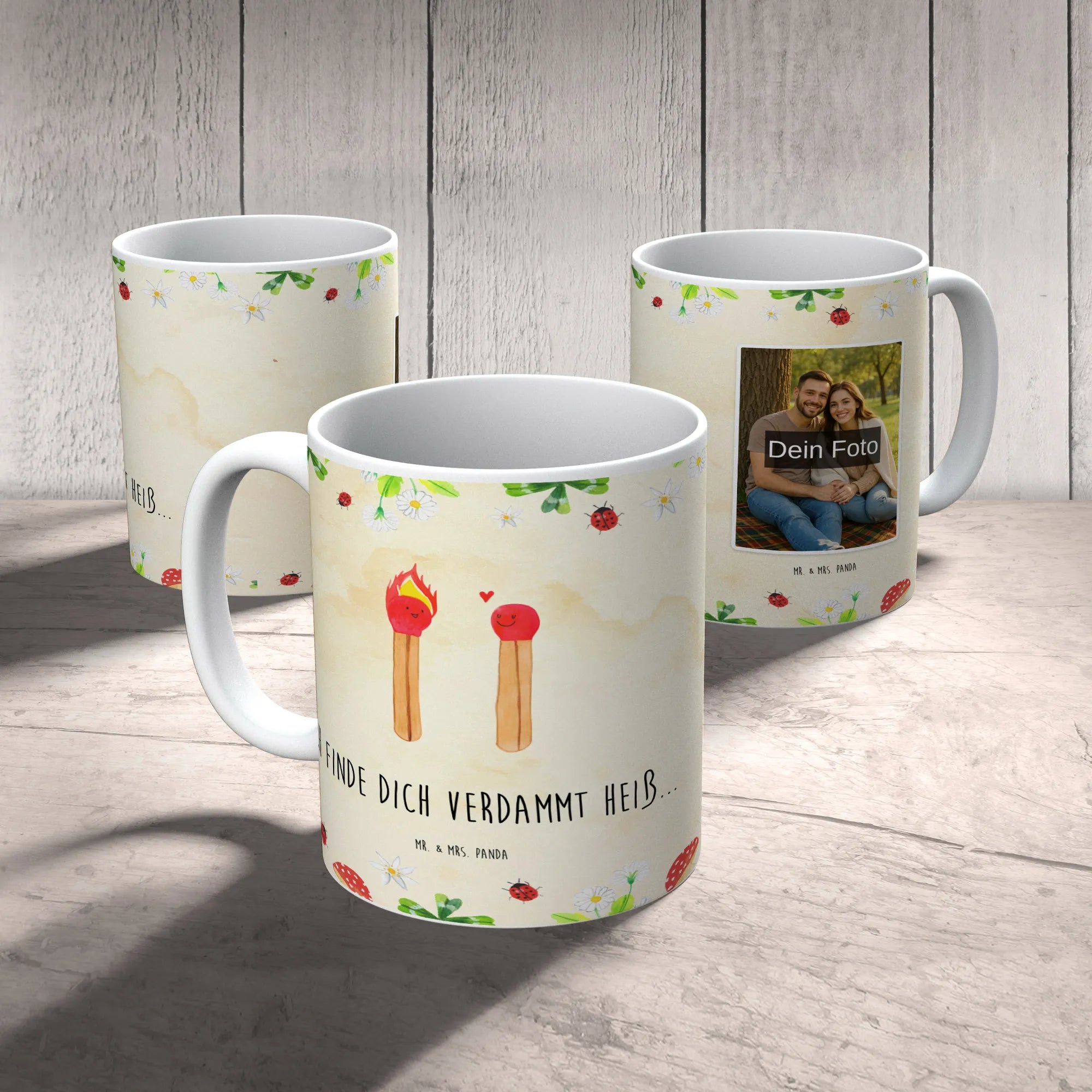 Die personalisierte Foto Tasse „Streichhölzer“ aus der Liebe-Kollektion von Mr. & Mrs. Panda ist das liebevoll-freche Geschenk für Verliebte. Auf der Tasse lachen zwei süße Streichhölzer sich verliebt an, verbunden durch ein kleines Herz. Der verspielte Spruch „Ich finde dich verdammt heiß...“ sorgt für Schmunzeln und Romantik zugleich.