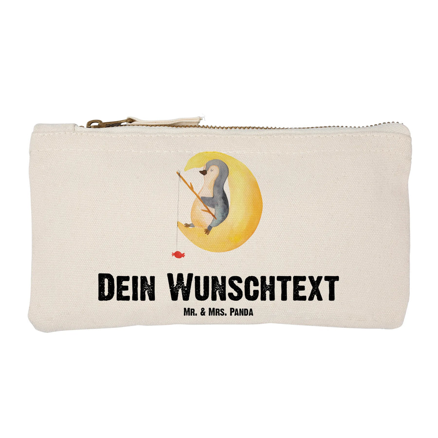 Die personalisierte Schminktasche "Pinguin Mond" aus der Pinguin-Kollektion von Mr. & Mrs. Panda ist nicht nur ein praktischer Begleiter, sondern auch das perfekte Geschenk für alle, die das Besondere lieben! Diese wunderschöne Kosmetiktasche ist aus 100% weicher Baumwolle gefertigt und somit nicht nur angenehm anzufassen, sondern auch äußerst langlebig. Mit dem süßen Pinguin-Motiv, das einen Pinguin zeigt, der gemütlich auf einer Mondsichel schläft und an einer Angel nach Sternen angelt, zaubert diese Tasche jedem ein Lächeln ins Gesicht. Der spezielle Spruch "Ich und mein Körper wollen schlafen, aber mein Kopf will wissen, ob Pinguine Knie haben..." bringt Humor und eine Portion Charm in den Alltag.