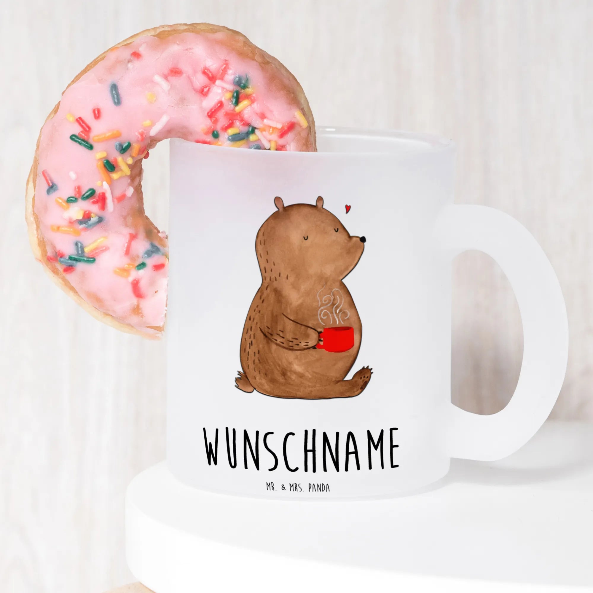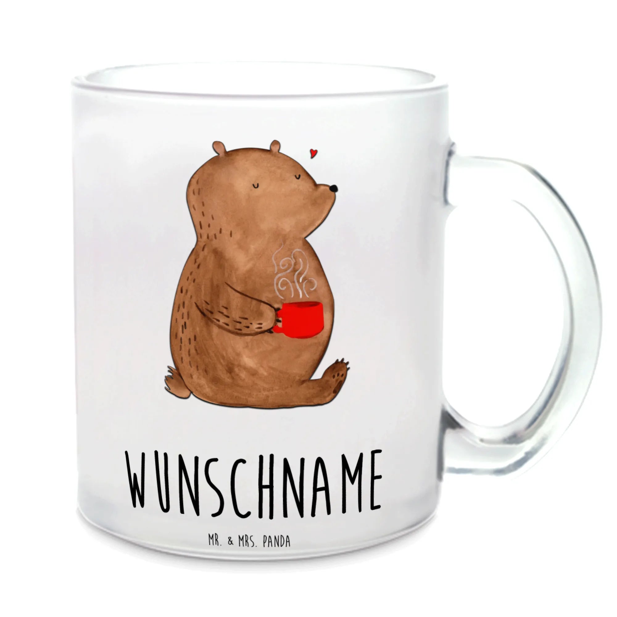 Unsere personalisierte Teetasse mit dem süßen Bärenmotiv "Kaffee" von Mr. & Mrs. Panda lässt keine Wünsche offen. Diese edle, aus robustem Glas gefertigte Teetasse ist nicht nur ein praktisches Alltagsobjekt, sondern auch ein liebevoll gestaltetes Kunstwerk, das deinen Morgen versüßt.