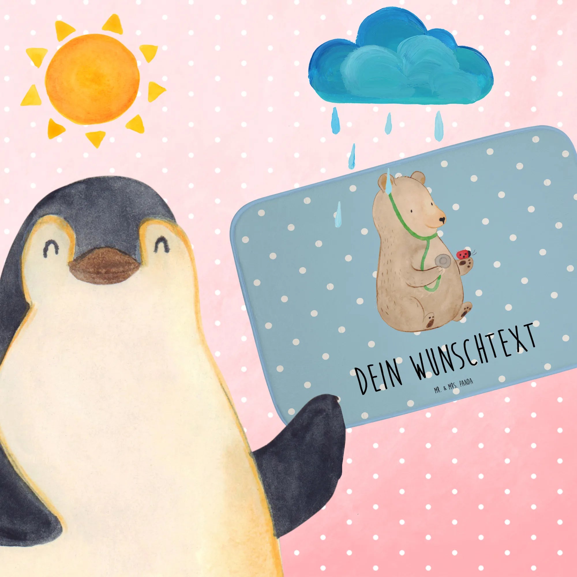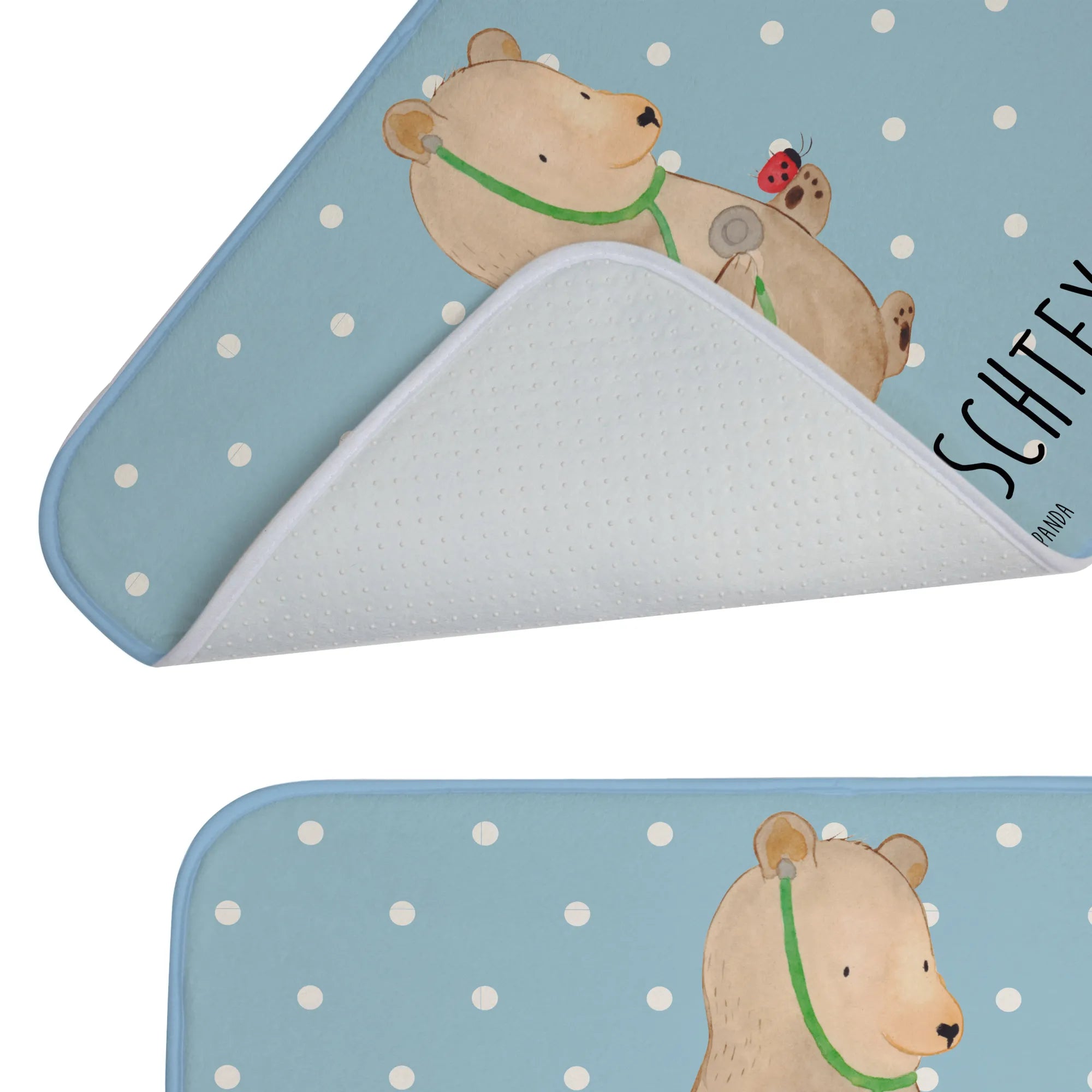 Verziere dein Badezimmer mit unserem einzigartigen Design: ein niedlicher Bär, der als Arzt einen kleinen Marienkäfer behandelt. Diese liebevoll gestaltete Illustration bringt Freude und eine persönliche Note in dein Zuhause. Der Badvorleger ist personalisierbar und kann mit deinem Wunschnamen oder einem persönlichen Wunschtext bedruckt werden. Warum also nicht einen Badvorleger mit Namen schenken?