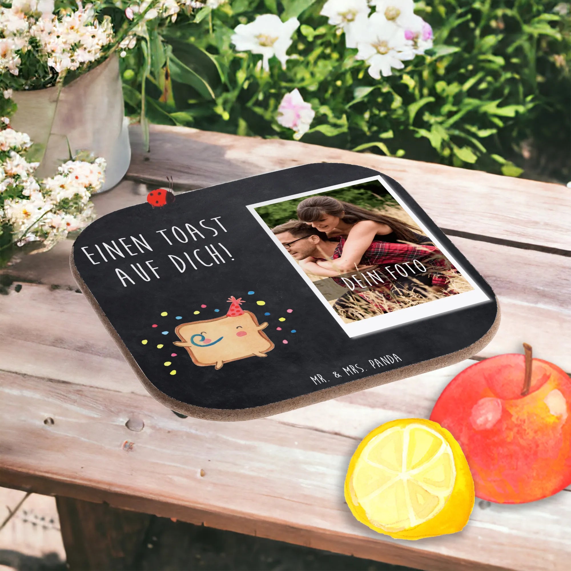 Personalisierter Foto Untersetzer „Toast Party“ – Ein kleines, aber feines Geschenk aus der Liebe-Kollektion von Mr. & Mrs. Panda. Der fröhliche Toast mit Partyhut und buntem Konfetti bringt sofort gute Laune auf den Tisch. Mit deinem Foto und dem liebevollen Spruch „Einen Toast auf dich!“ wird dieser Untersetzer zu einem ganz persönlichen Liebesgeschenk, ideal für Freundin, Freund, Partner oder Ehemann. 🥂