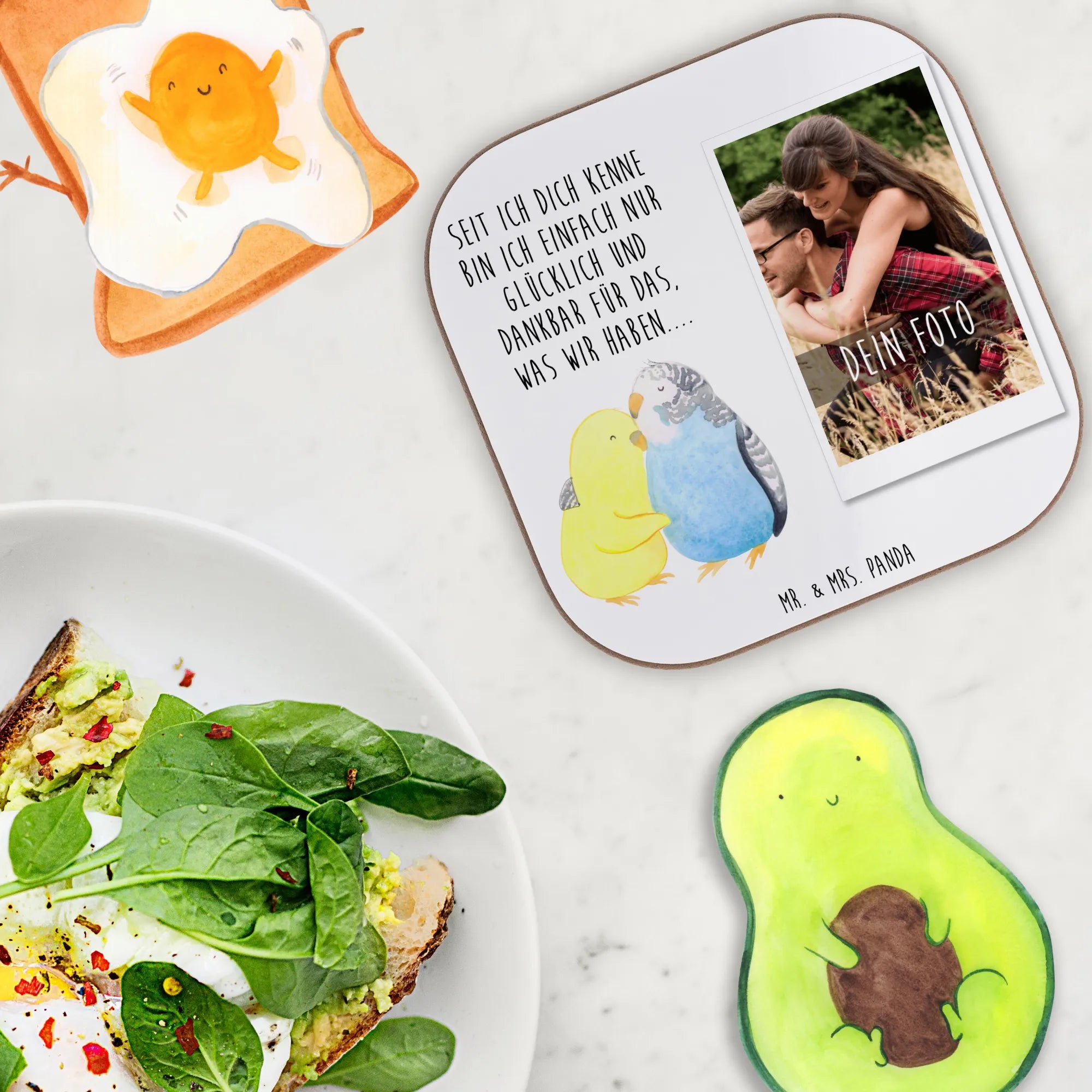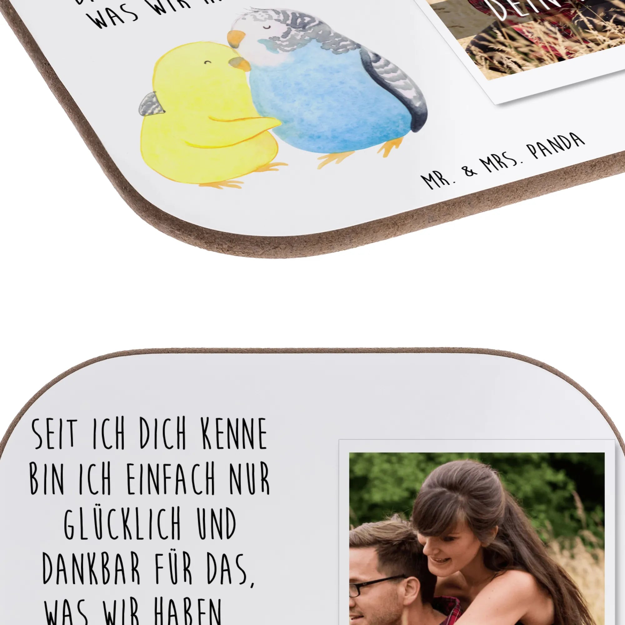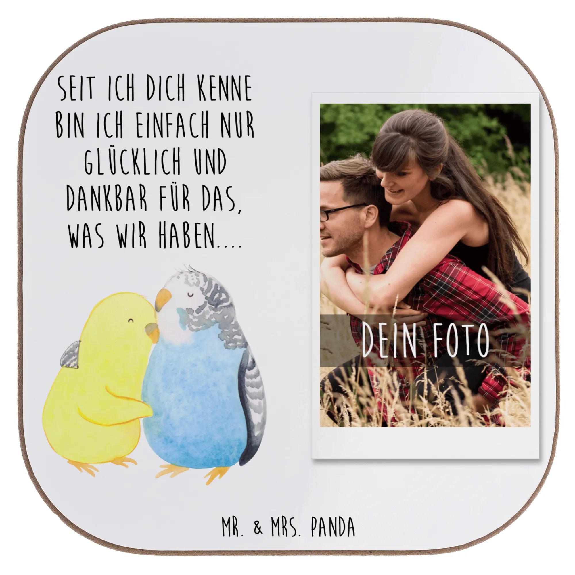 Der personalisierte Foto Untersetzer "Wellensittich Liebe" von Mr. & Mrs. Panda ist das perfekte Geschenk für deine Liebsten. Egal ob für deinen Partner, die beste Freundin oder bei einem besonderen Anlass wie Verlobung, Hochzeitstag oder Valentinstag – dieser Untersetzer bringt nicht nur Farbe auf den Tisch, sondern auch viel Herz! Mit einem liebevollen Motiv zweier Wellensittiche, die eng umschlungen sind, verkörpert er Zuneigung, Vertrauen und Nähe wie kaum ein anderes Produkt.