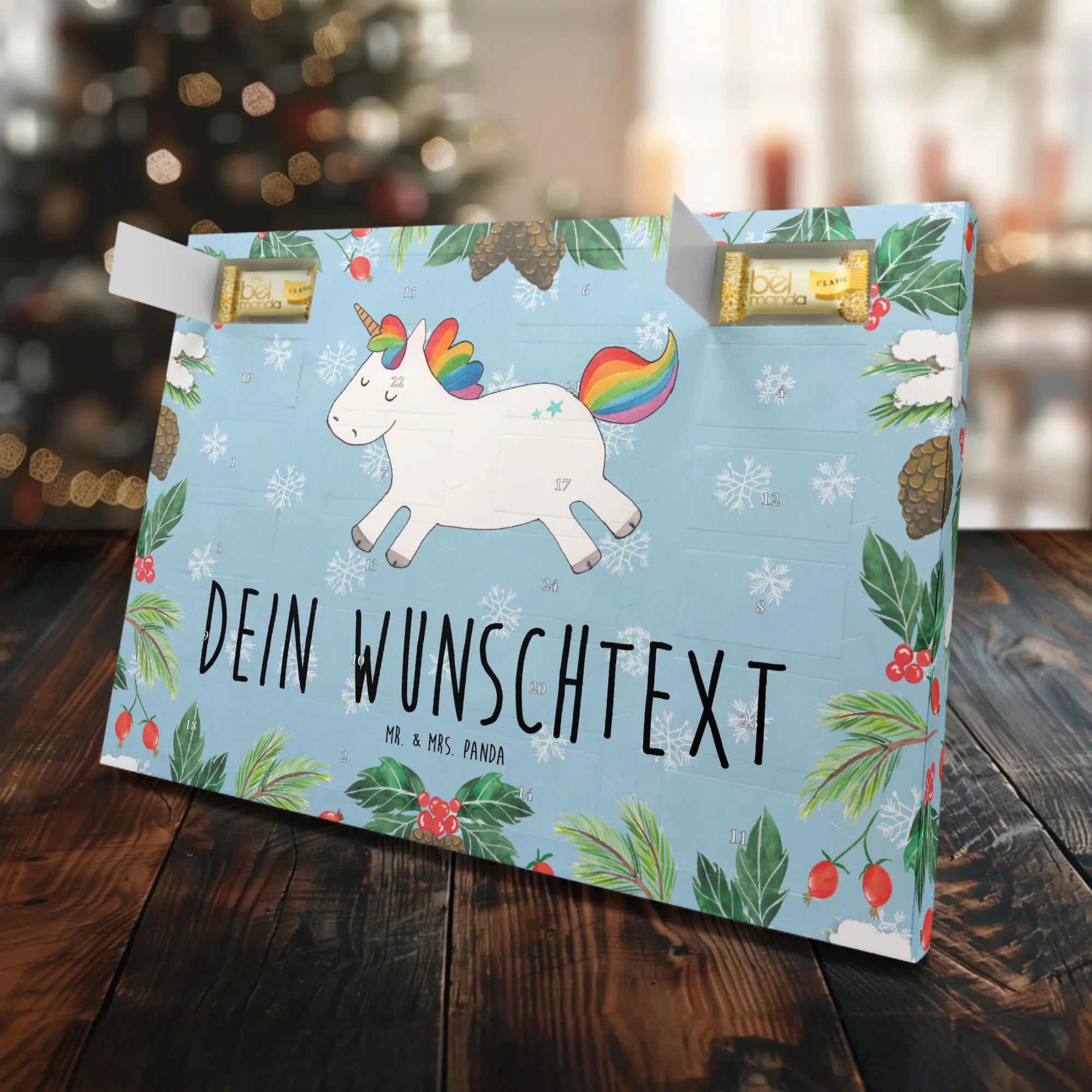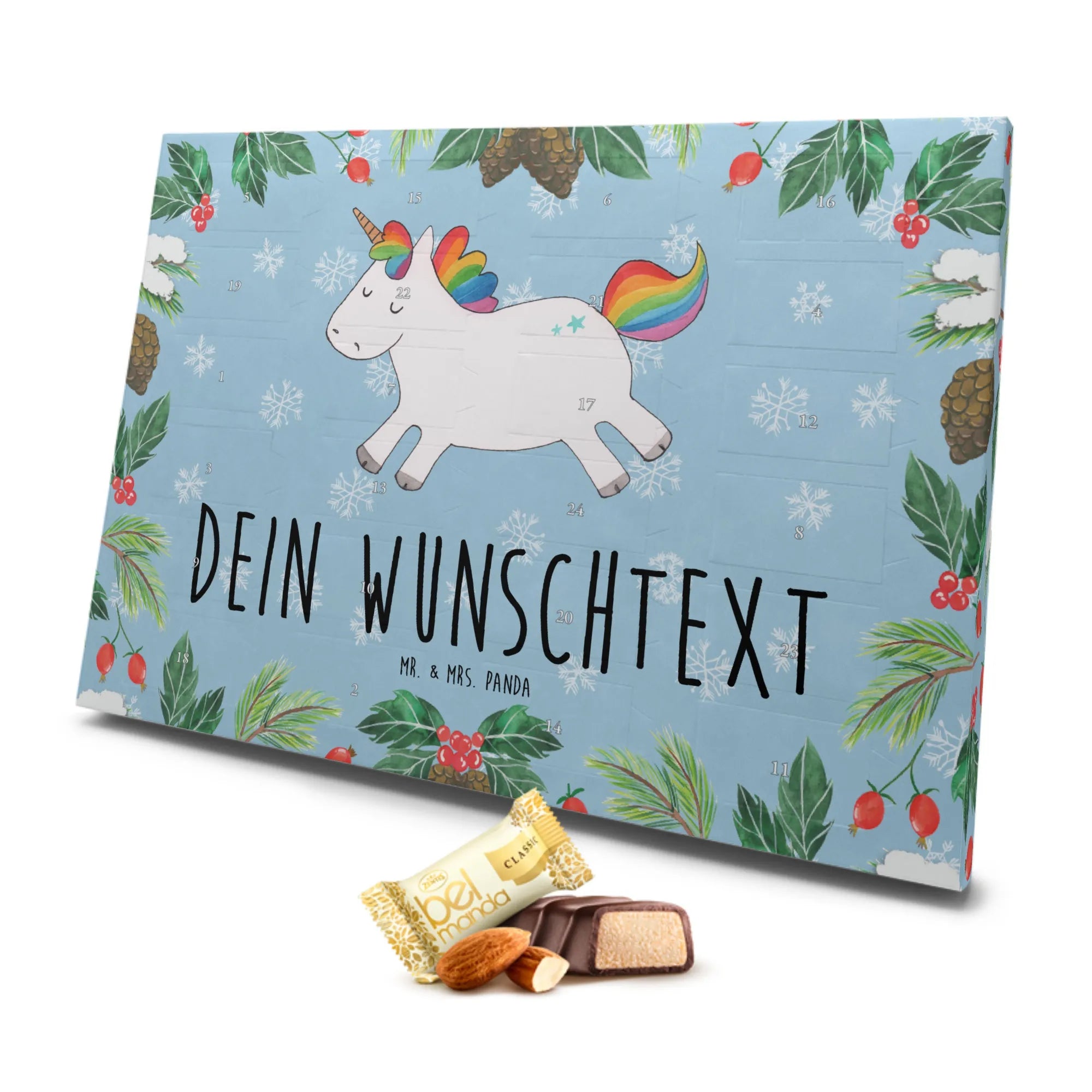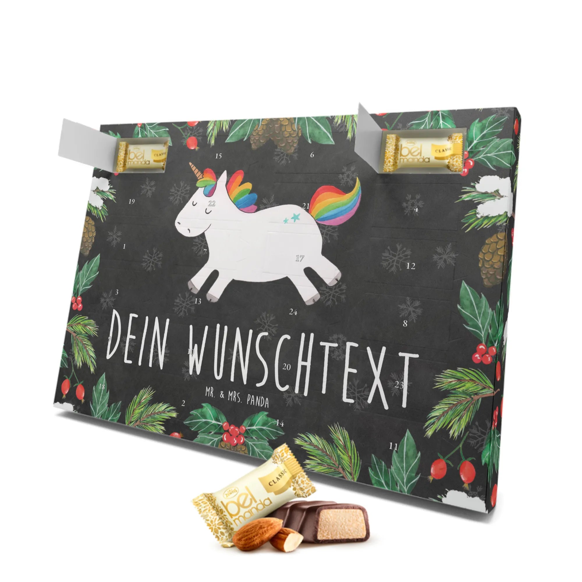 Der personalisierte Marzipan Adventskalender Einhorn Happy von Mr. & Mrs. Panda ist das perfekte Geschenk für alle Einhorn-Liebhaber! 🎁 Mit seinem magischen Design und witzigem Motto "Fresst meinen Sternenstaub, ihr Langweiler" zaubert dieser Adventskalender ein strahlendes Lächeln auf die Gesichter der Beschenkten.