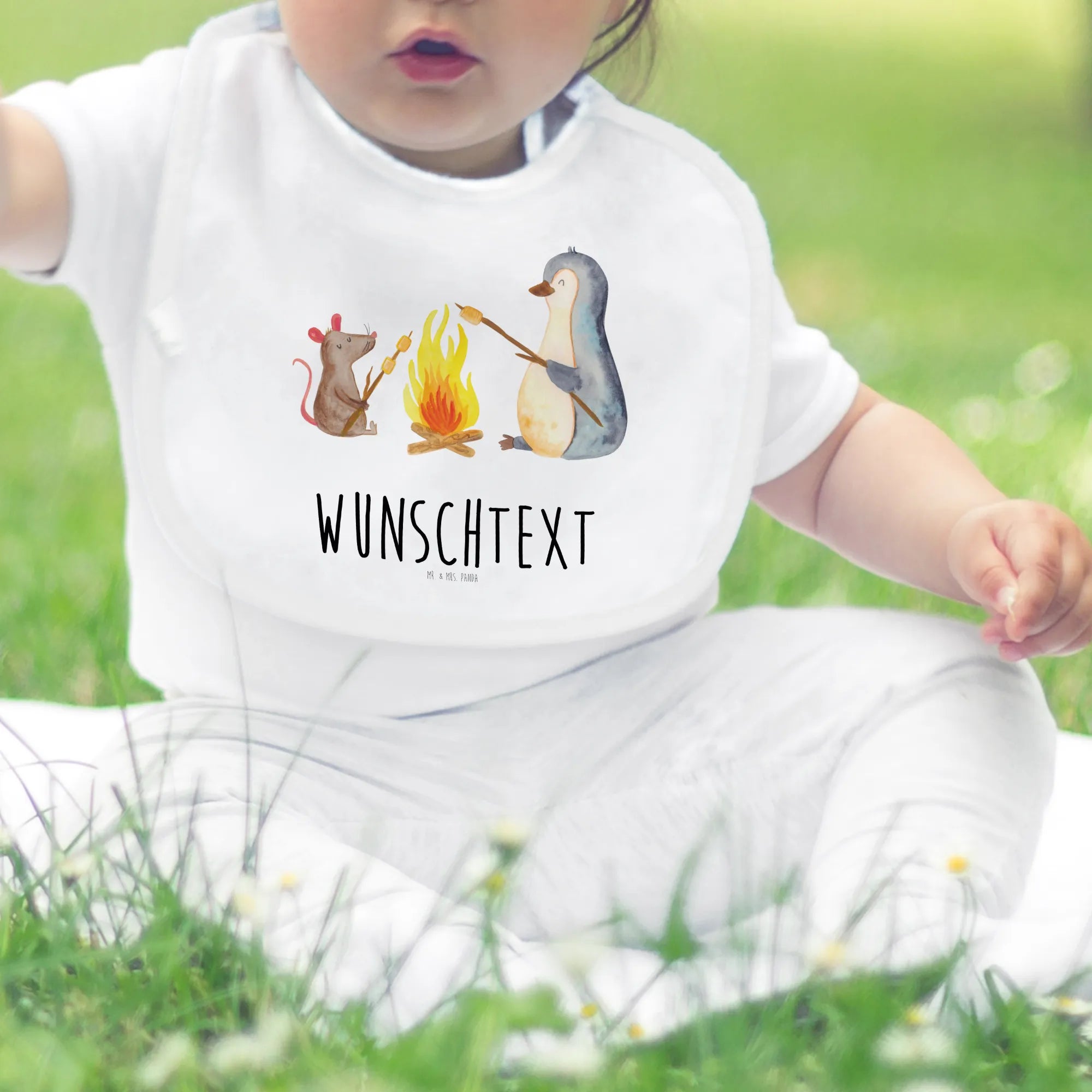 Das personalisierte Babylätzchen mit dem zauberhaften Motiv "Pinguin Lagerfeuer" aus unserer Pinguin-Kollektion ist das perfekte Geschenk für neugeborene Babys oder zur Babyparty! Mit diesem Lätzchen verleihst du nicht nur einem der wichtigsten Begleiter im Alltag eine persönliche Note, sondern bringst auch ein Stück Wärme und Natur ins Leben der Kleinsten. Der süße Pinguin und die fröhliche Maus, die lustig am Lagerfeuer sitzen und Marshmallows grillen, sorgen garantiert für gute Laune bei den Kleinen und den Eltern.