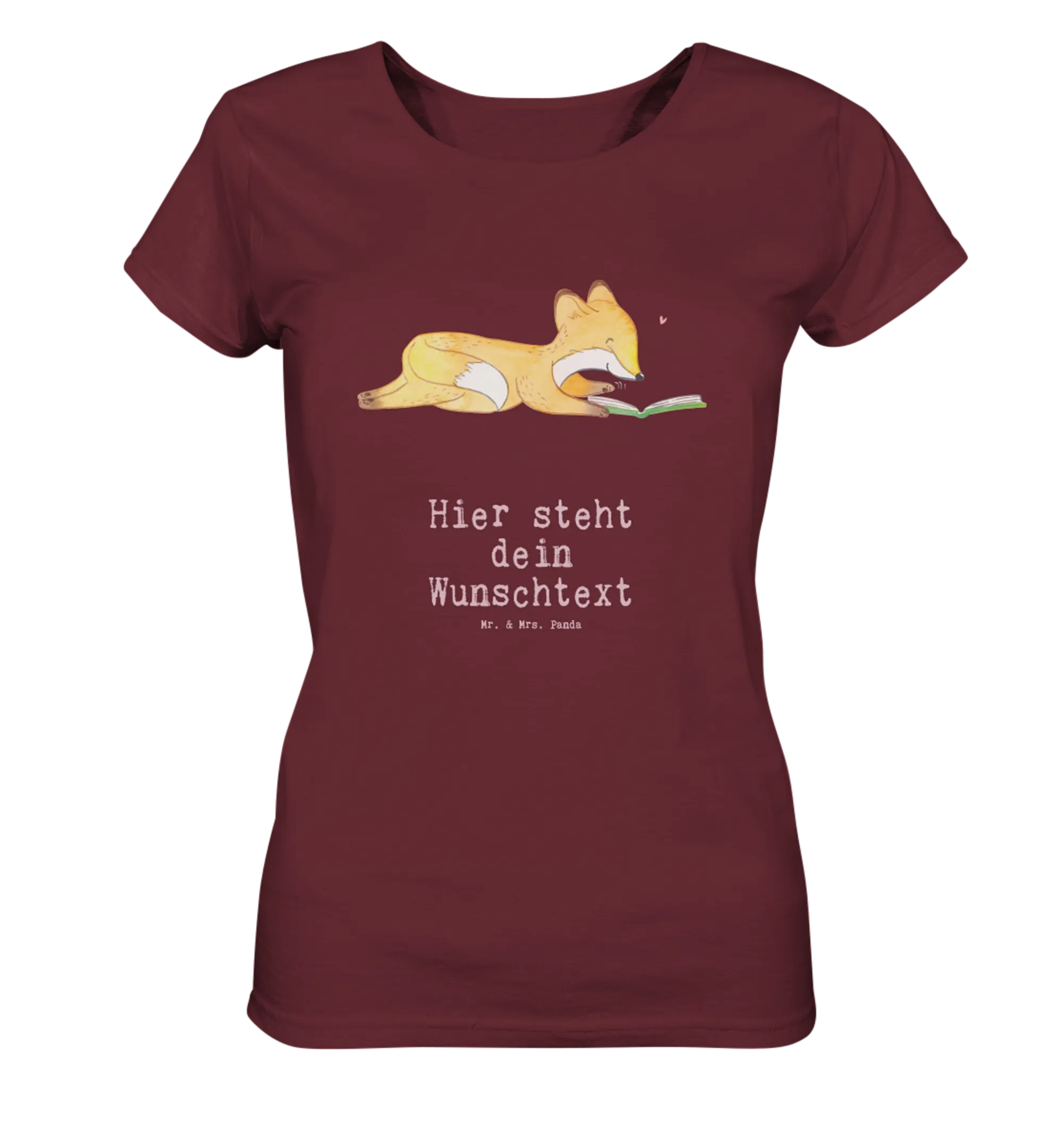 Das personalisierte Shirt Damen "Fuchs Lesen Tage" ist das perfekte Geschenk für alle Buchliebhaber und Leseratten! In einem eleganten burgunderfarbenen Design zeigt es einen süßen Fuchs, der entspannt mit einem spannenden Buch in der Hand auf dem Boden sitzt.