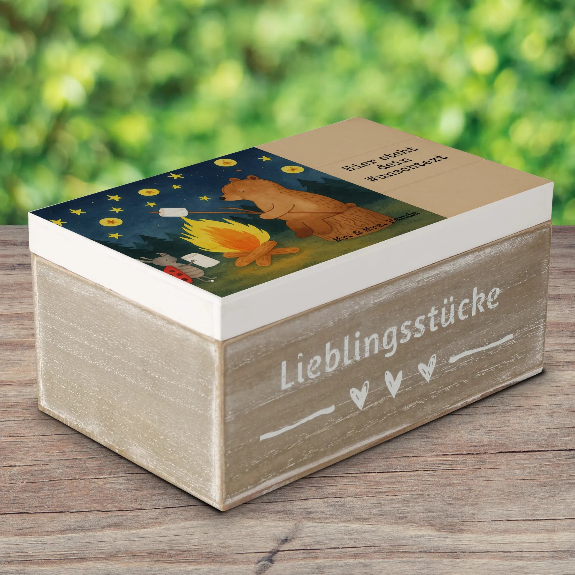 Personalizowane drewniane pudełko Niedźwiedź i biedronka przy ognisku Design - 19 x 12 cm