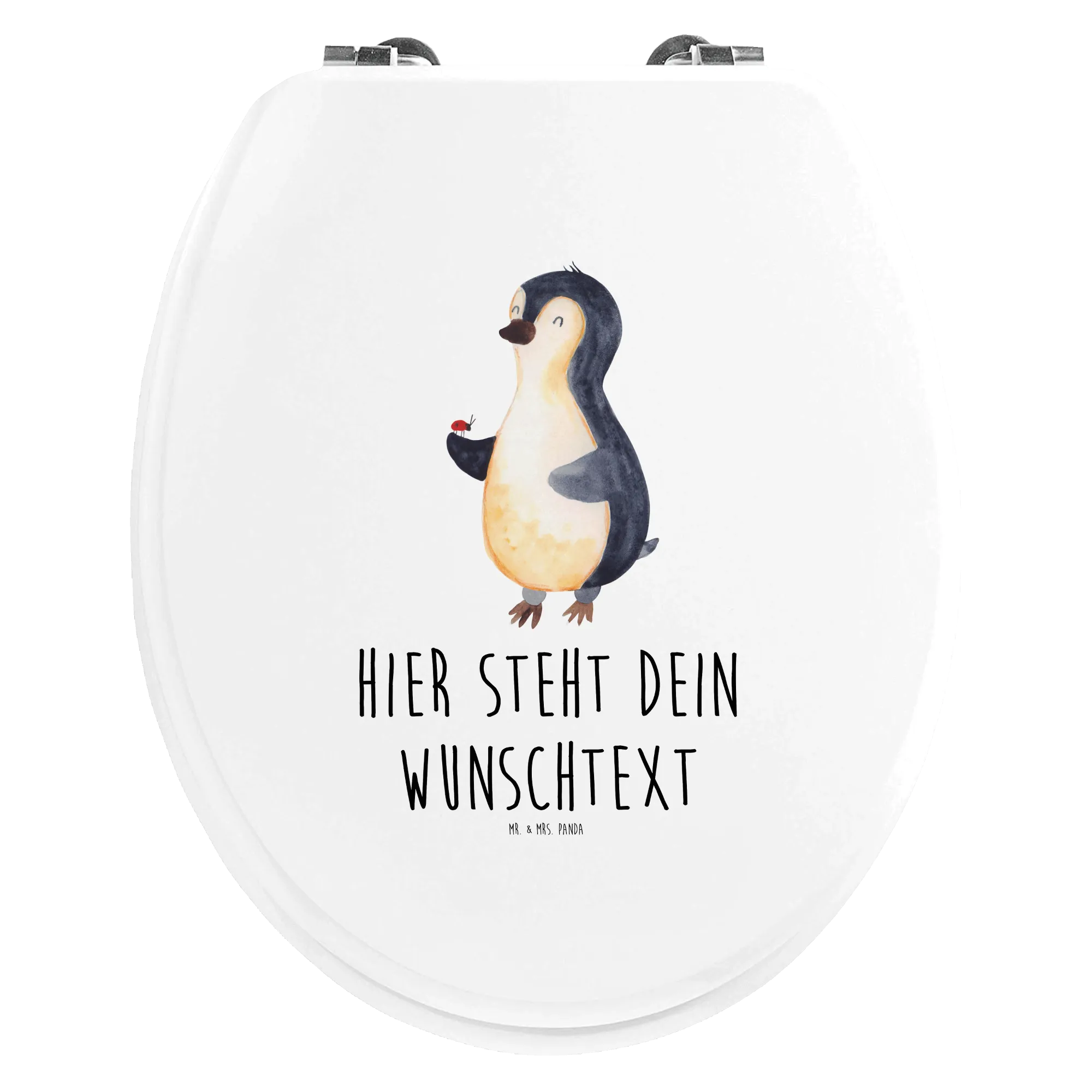 Willkommen in der zauberhaften Welt der personalisierten WC Sitze von Mr. & Mrs. Panda! Hier stellen wir dir unseren wunderschönen personalisierten WC Sitz mit dem fröhlichen Pinguin-Motiv und dem charmanten Marienkäfer vor. Dieser Toilettendeckel wird nicht nur dein Badezimmer aufpeppen, sondern auch ein echtes Unikat, das deinen persönlichen Stil zum Ausdruck bringt. Der Pinguin, der einen putzigen Marienkäfer auf seiner Flosse hält, symbolisiert Freude und Lebensfreude. Mit dem liebevollen Slogan "Glaube an Wunder, Liebe und Glück." zaubert dieser WC Sitz garantiert ein Lächeln auf dein Gesicht.