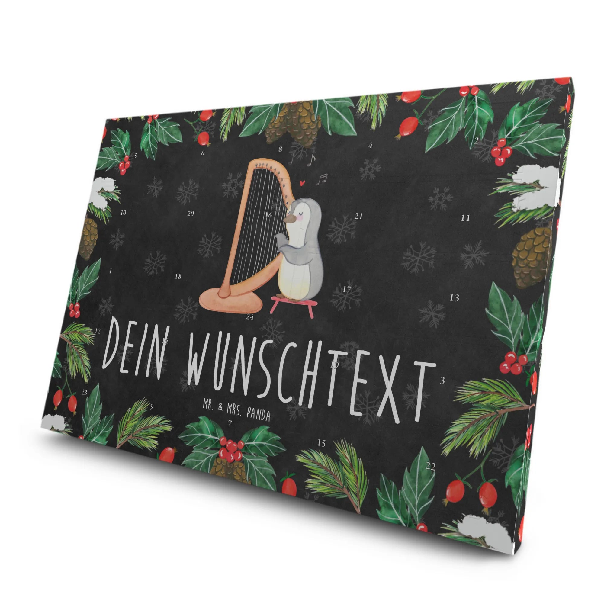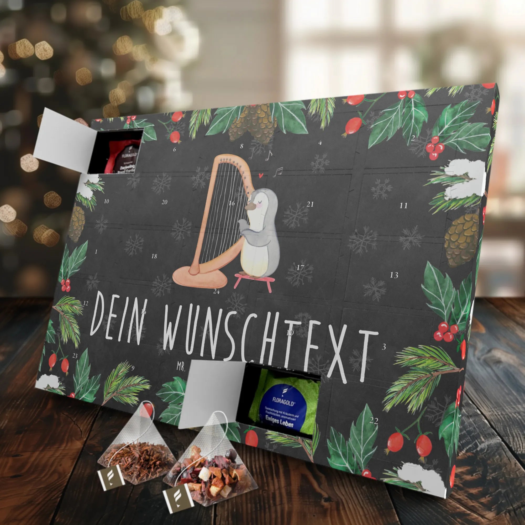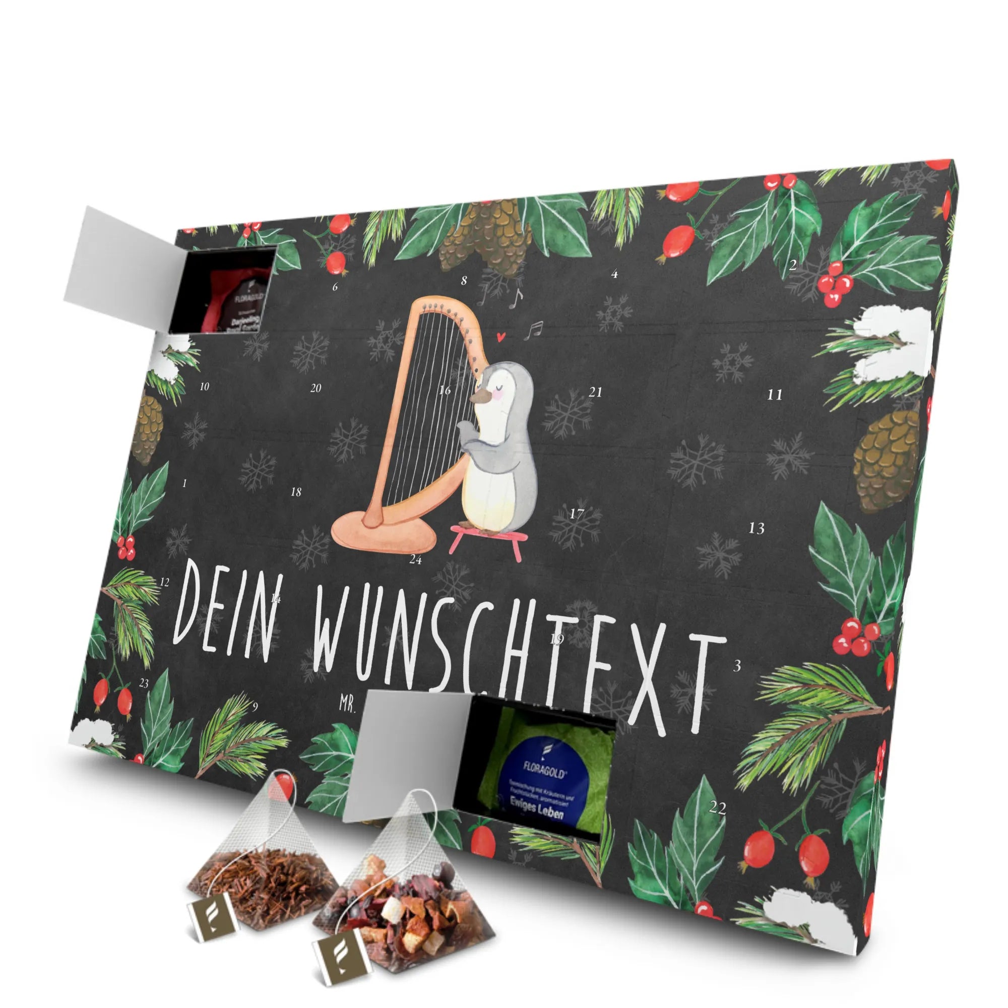Der personalisierte Tee Adventskalender mit dem bezaubernden Motiv Pinguin Harfe von Mr. & Mrs. Panda ist das perfekte Geschenk für Musikliebhaber und Tee-Fans. Dieser Adventskalender bringt nicht nur musikalische Freude in die Vorweihnachtszeit, sondern auch die Möglichkeit, jeden Tag ein Stück köstlichen Tee zu genießen.